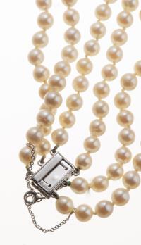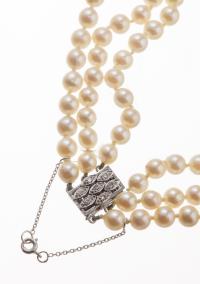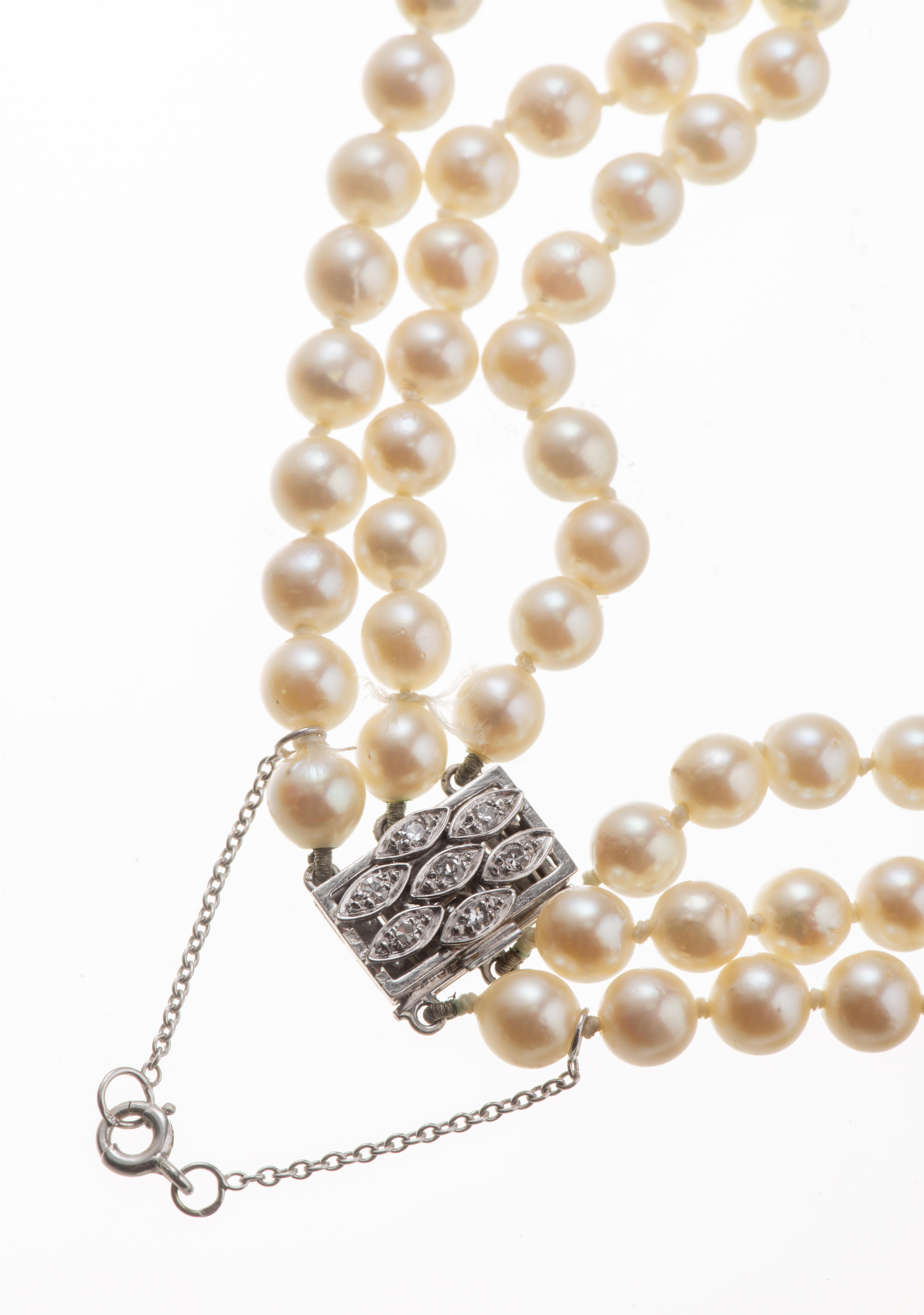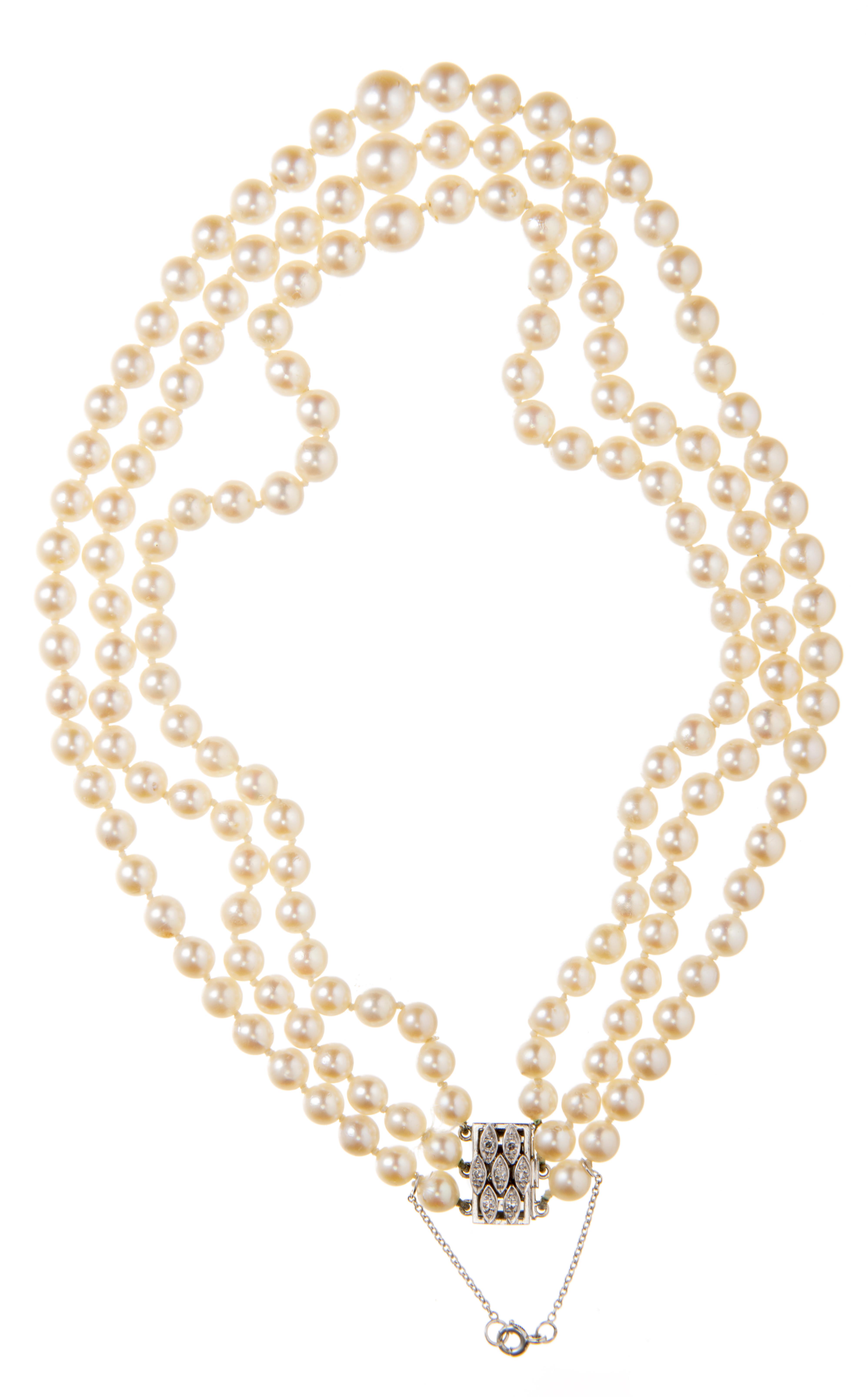 Collier tour de cou à trois rangs de 159 perles de culture de diamètre de 5 à 9 mm, fermoir en or gris .750 serti de 7 diamants de taille 8/8 pour un total de 0.07 ct.