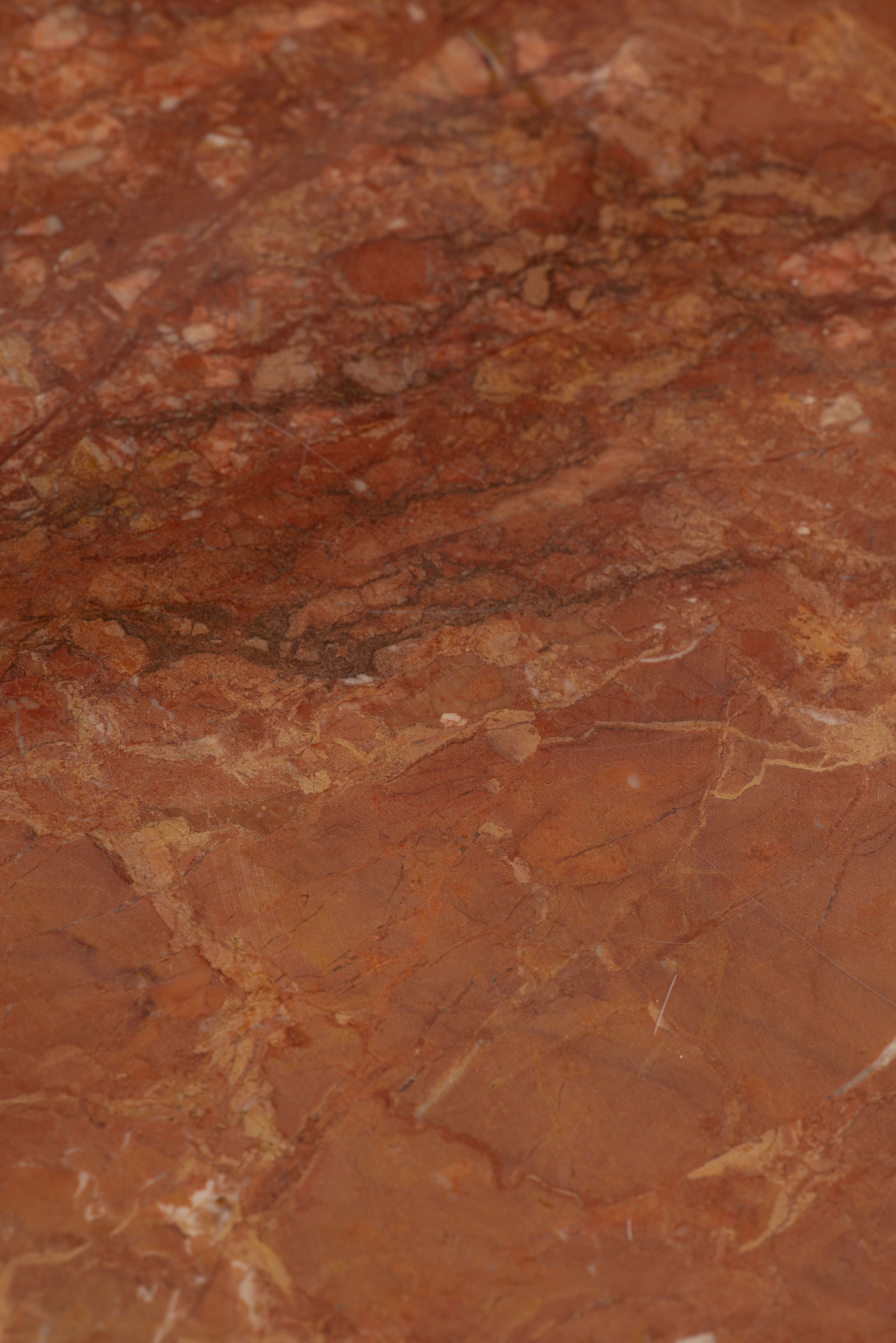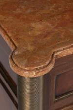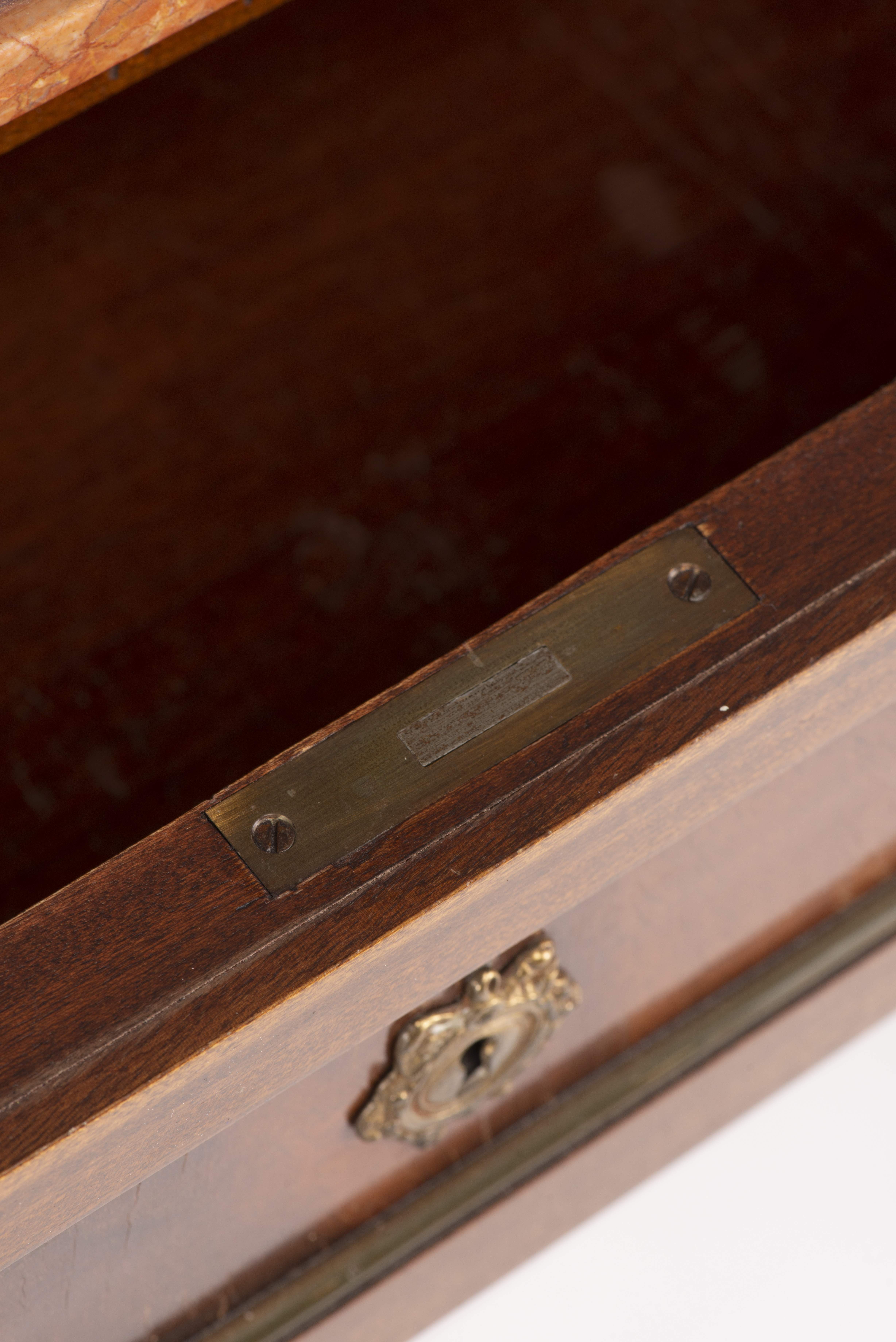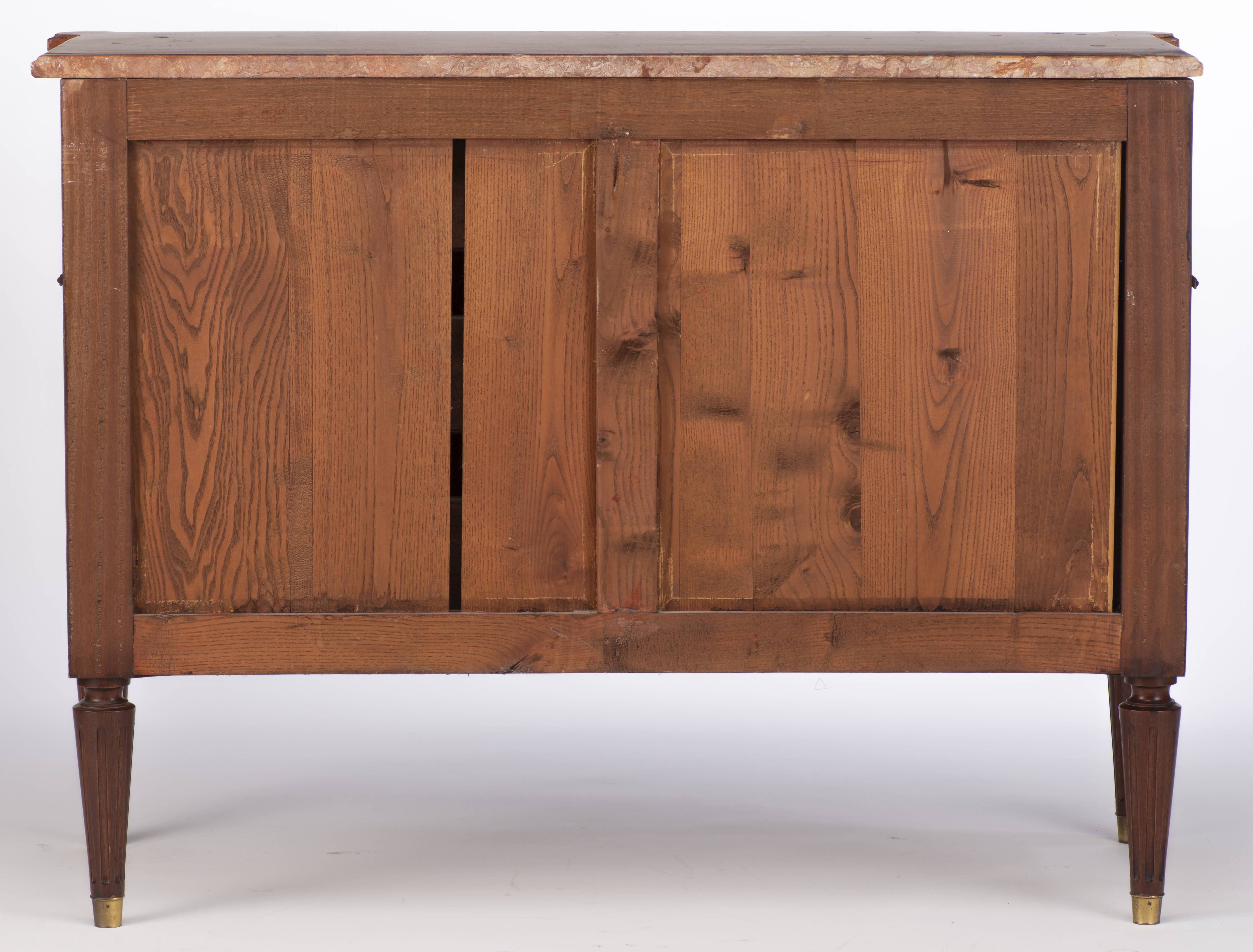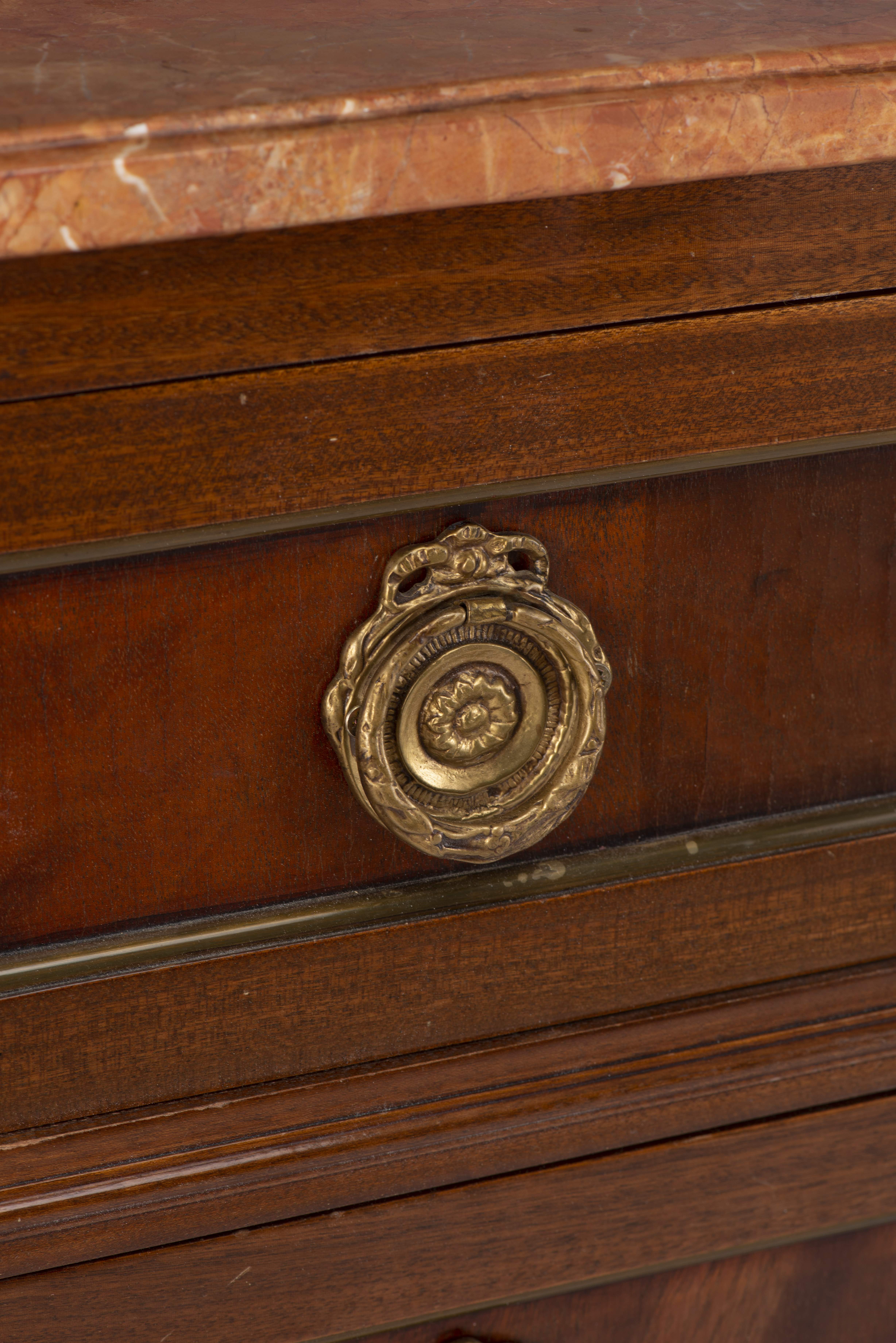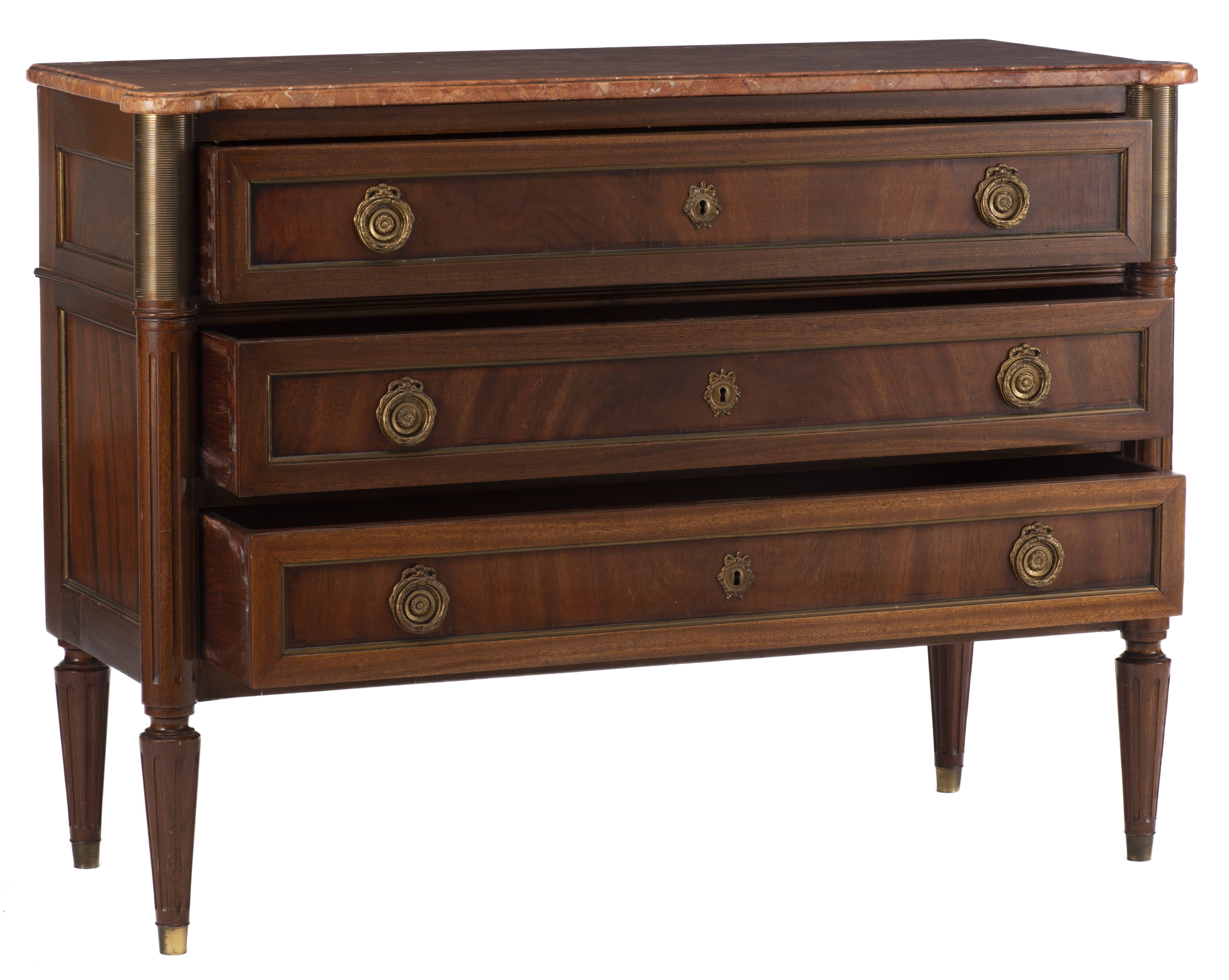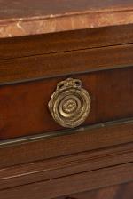 Commode en acajou de style Louis XVI à 3 tiroirs, dessus de marbre rouge lie de vin.
