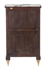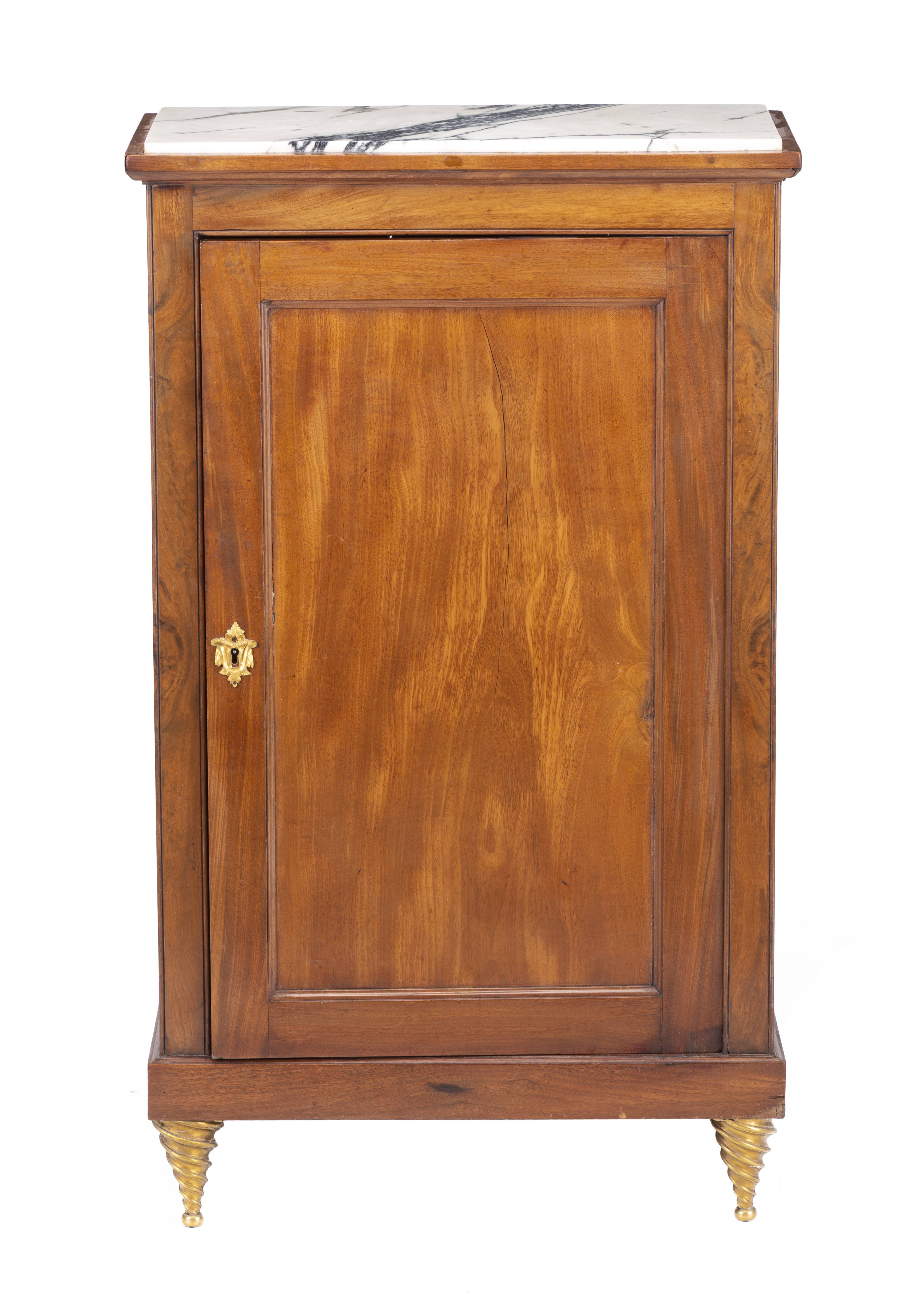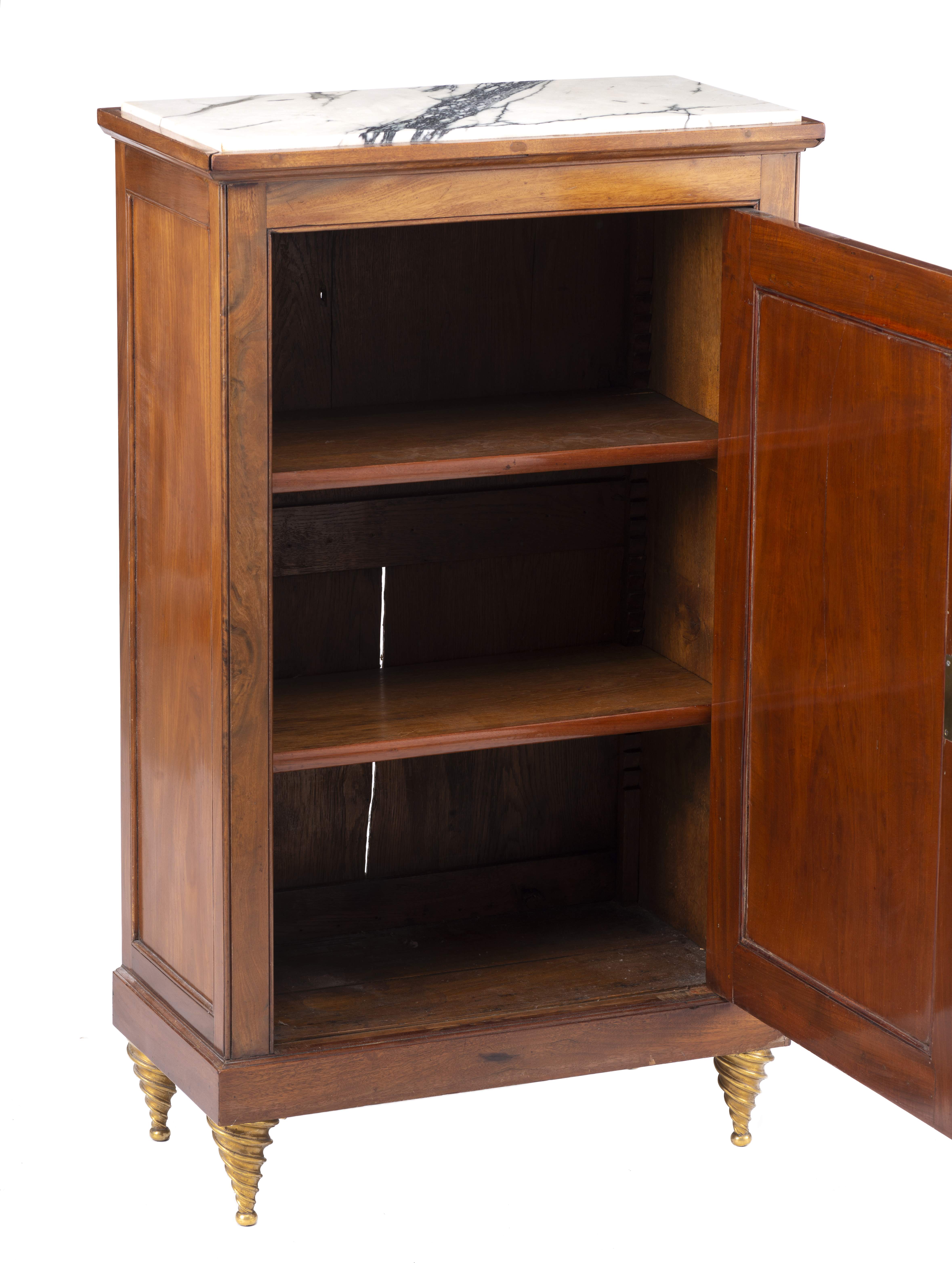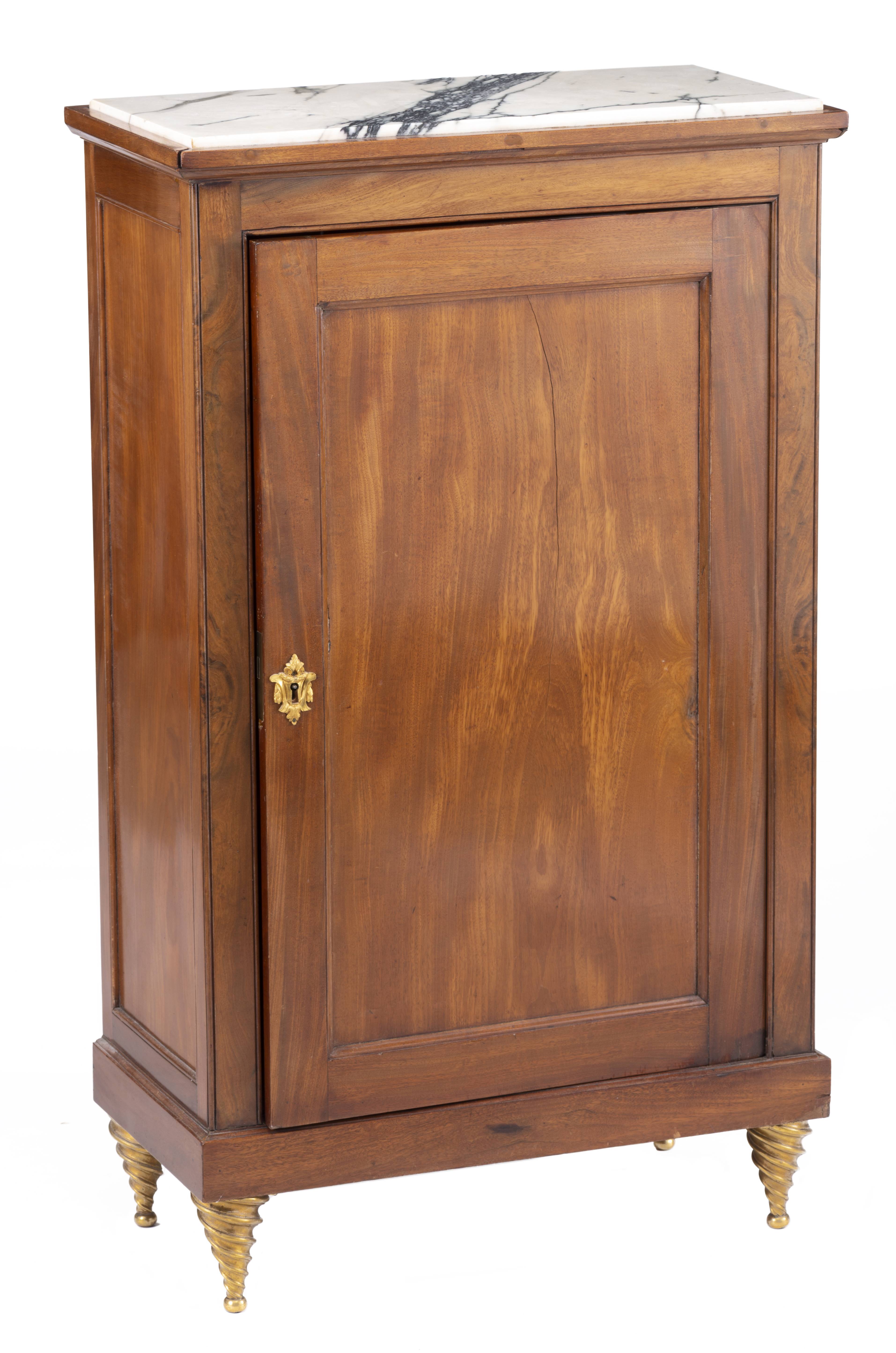 Meuble d'appui ou confiturier d'époque Louis XVI à pieds avant toupille en bronze doré, une porte en acajou plein, dessus de marbre blanc brèche.