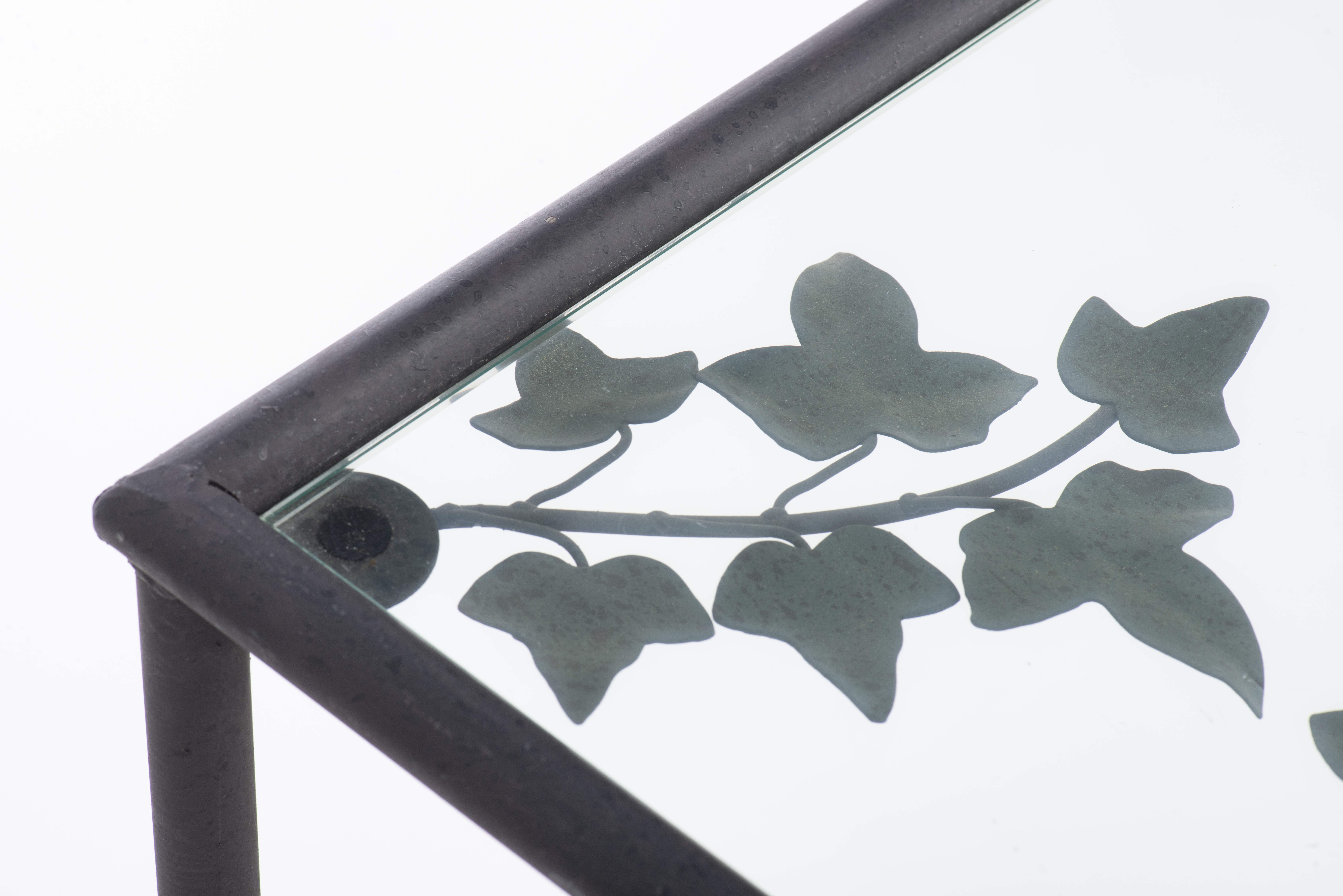 Console en verre et fer forgé à décor de feuilles de lierre et deux appliques en suite