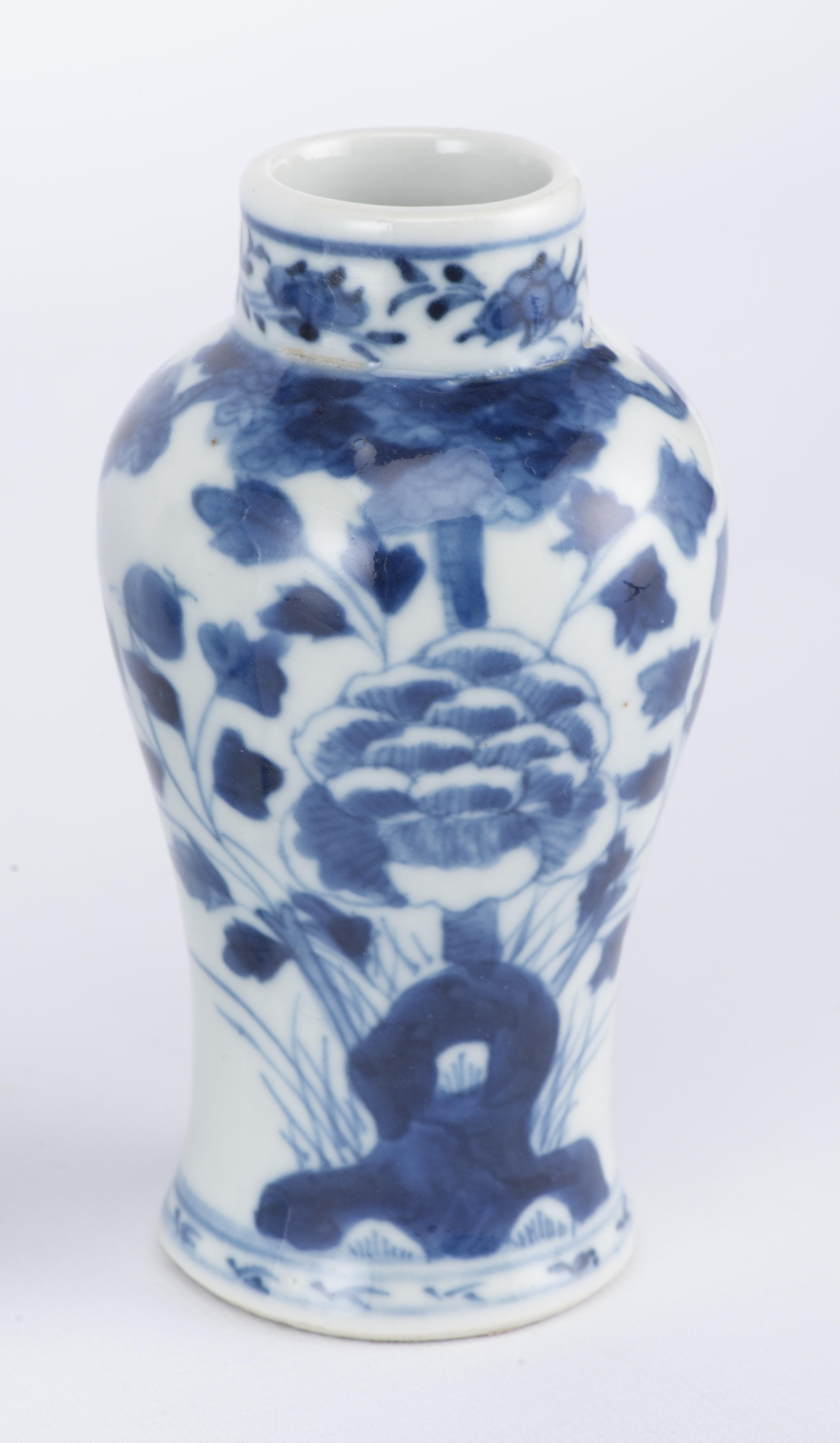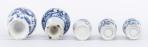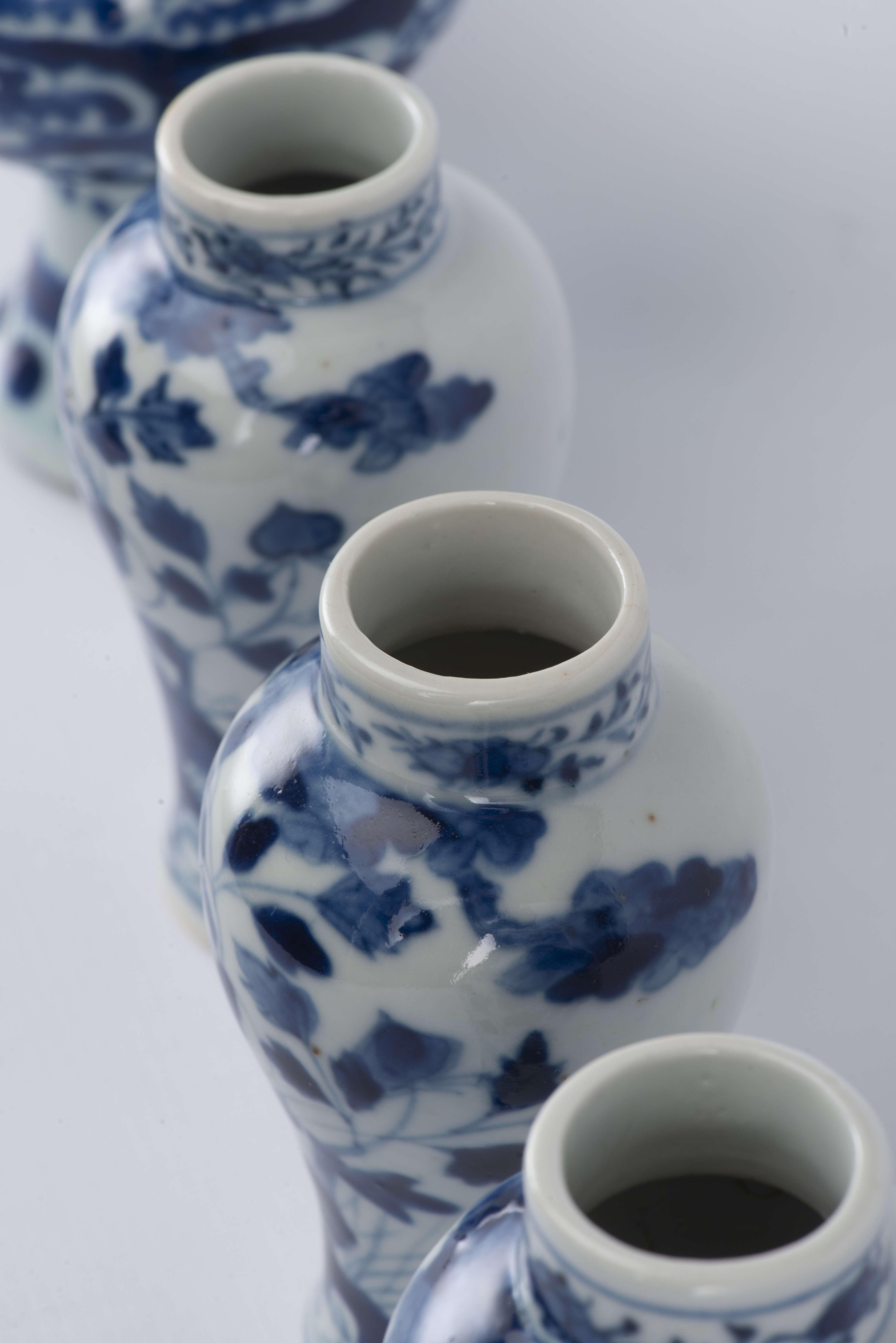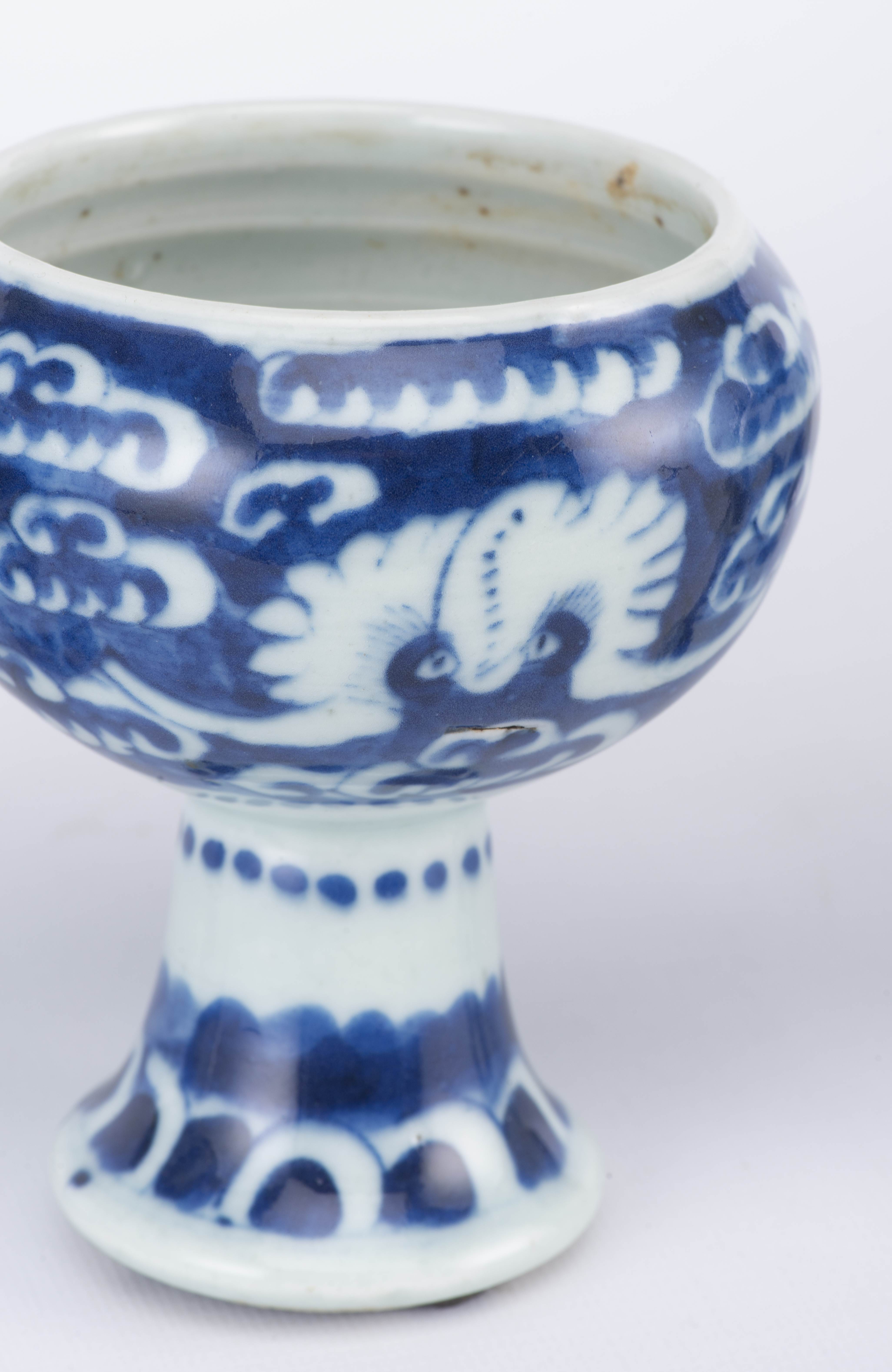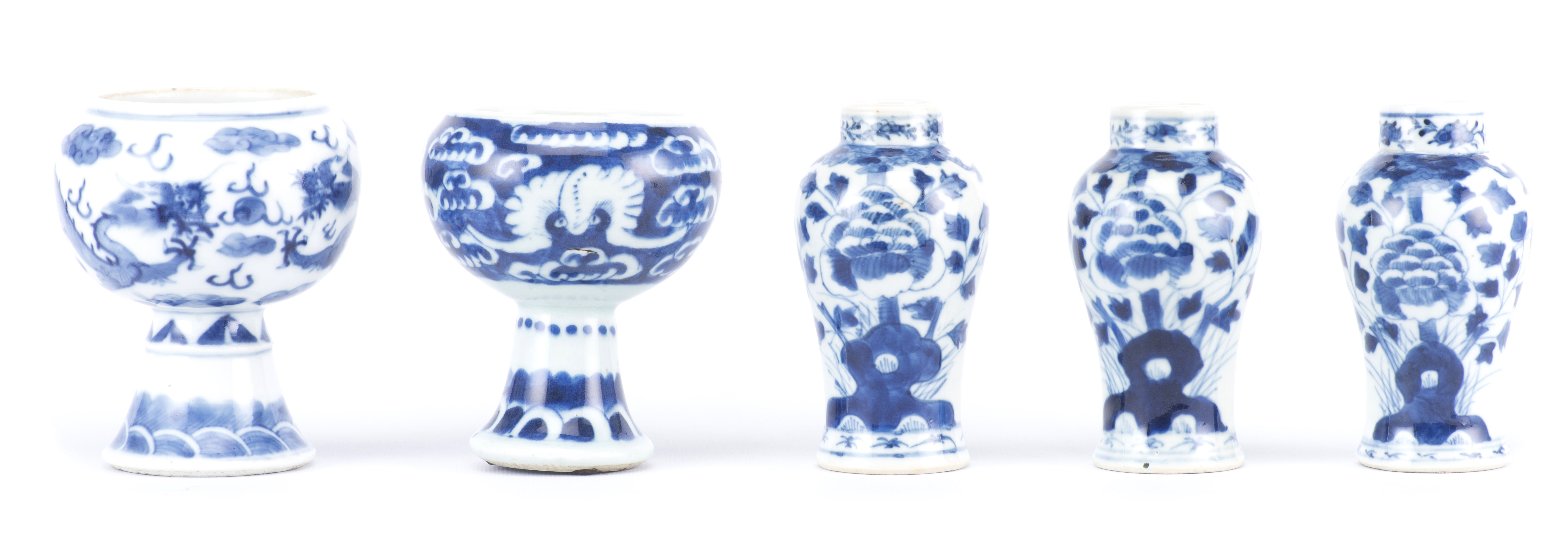 Deux coupes sur pied et trois vases de forme Meiping en porcelaine de Chine à décor en bleu & blanc de dragons dans les nuages et de chauves-souris dans les nuages pour les coupes et jardins fleuris pour les vases.