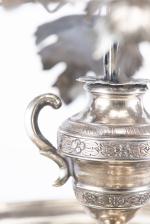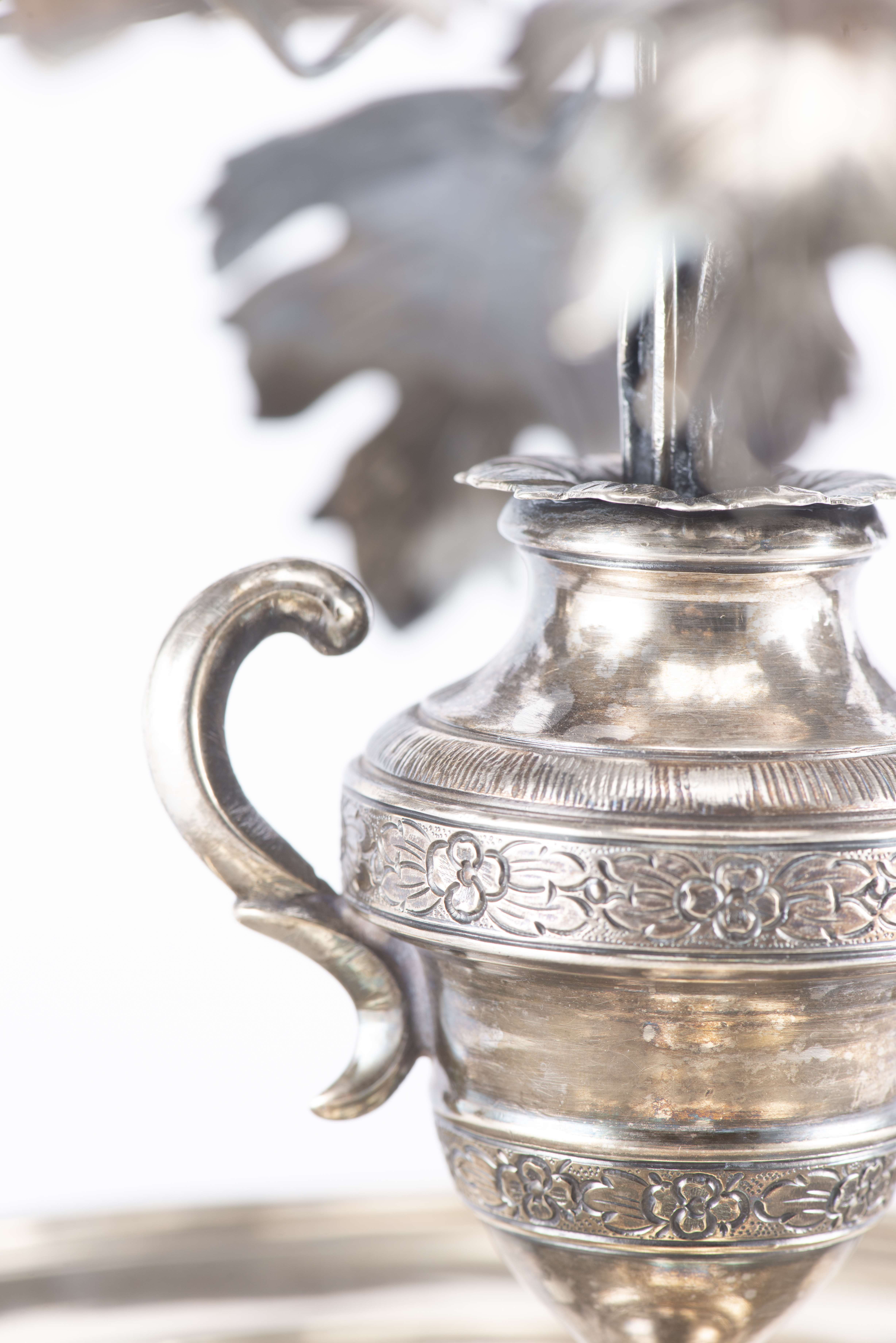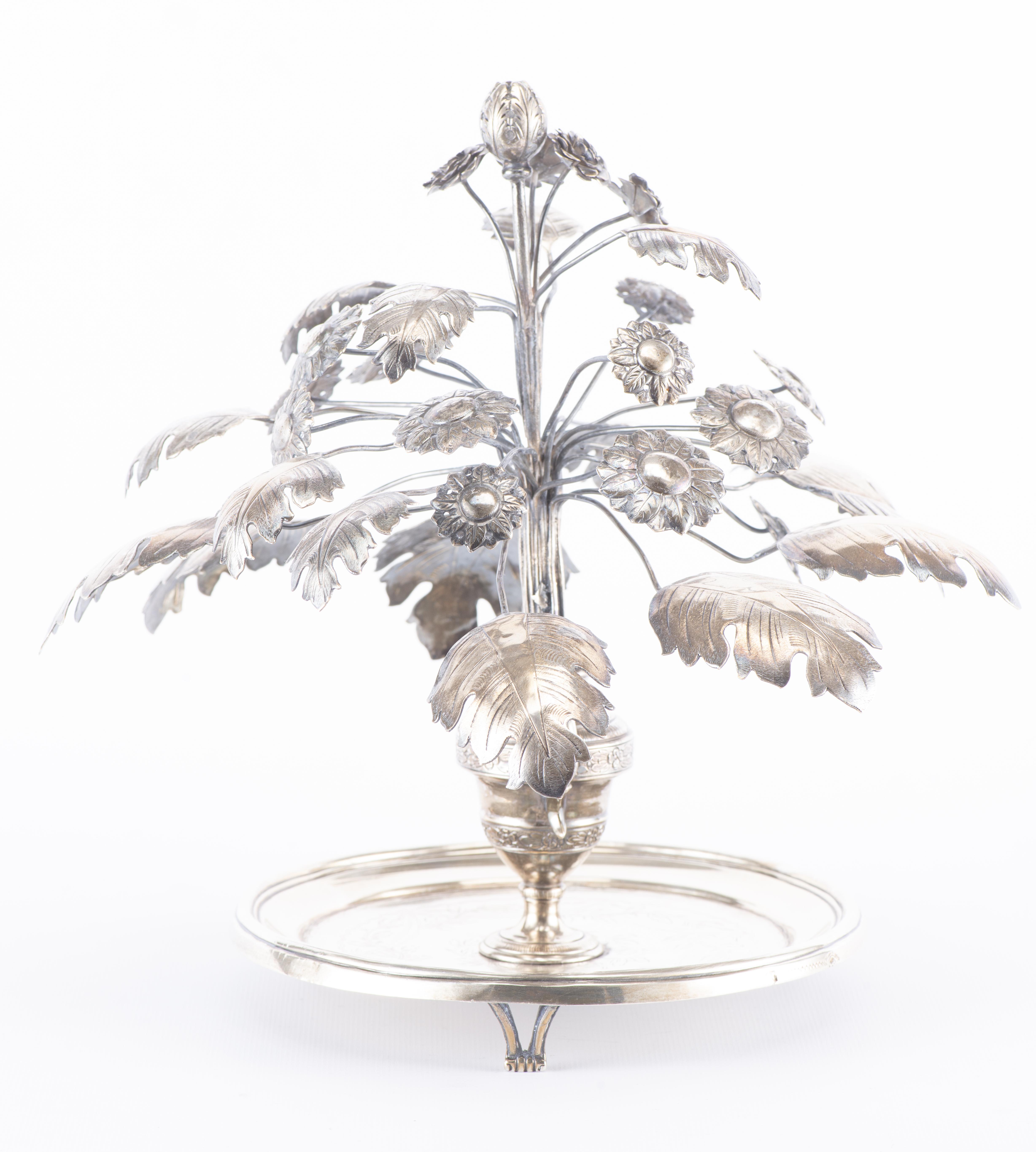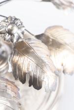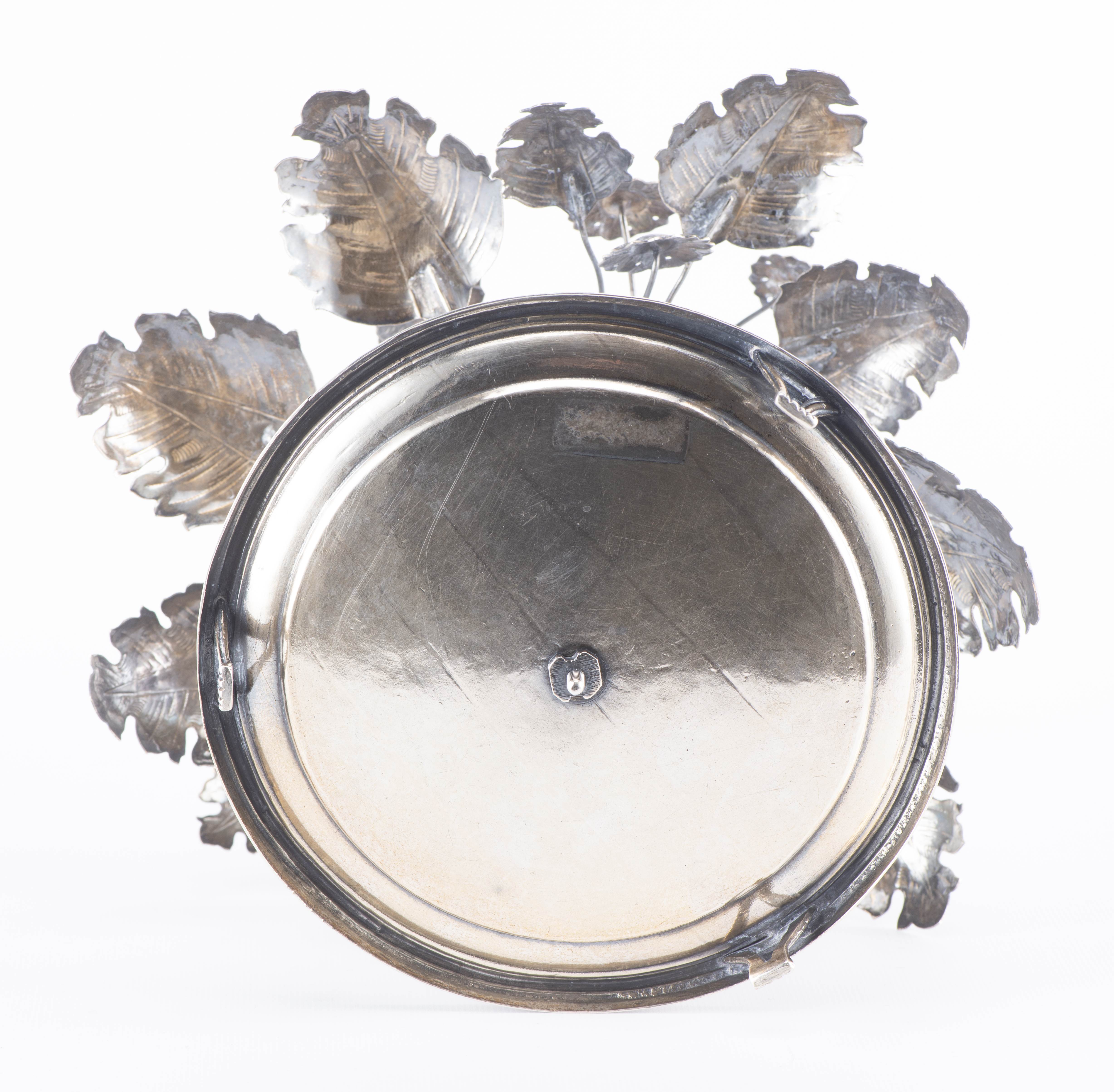 Jolie décoration en argent représentant un vase fleuri et feuillagé, poinçon d'argent partiellement visible : P surmonté d'une couronne et poinçon de maitre APC.