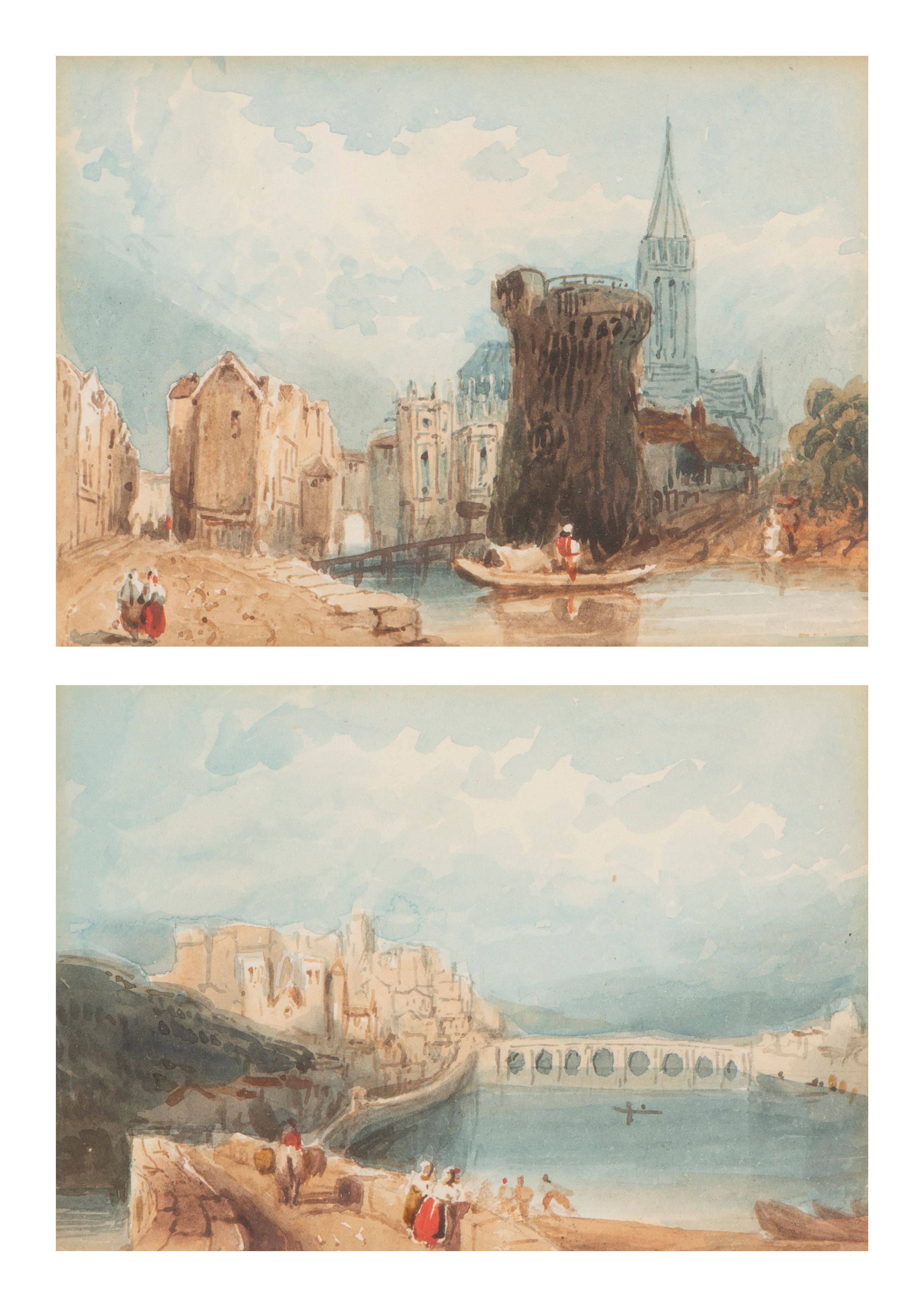 Deux aquarelles sur papier représentant des paysages fluviaux avec personnages, non signé.