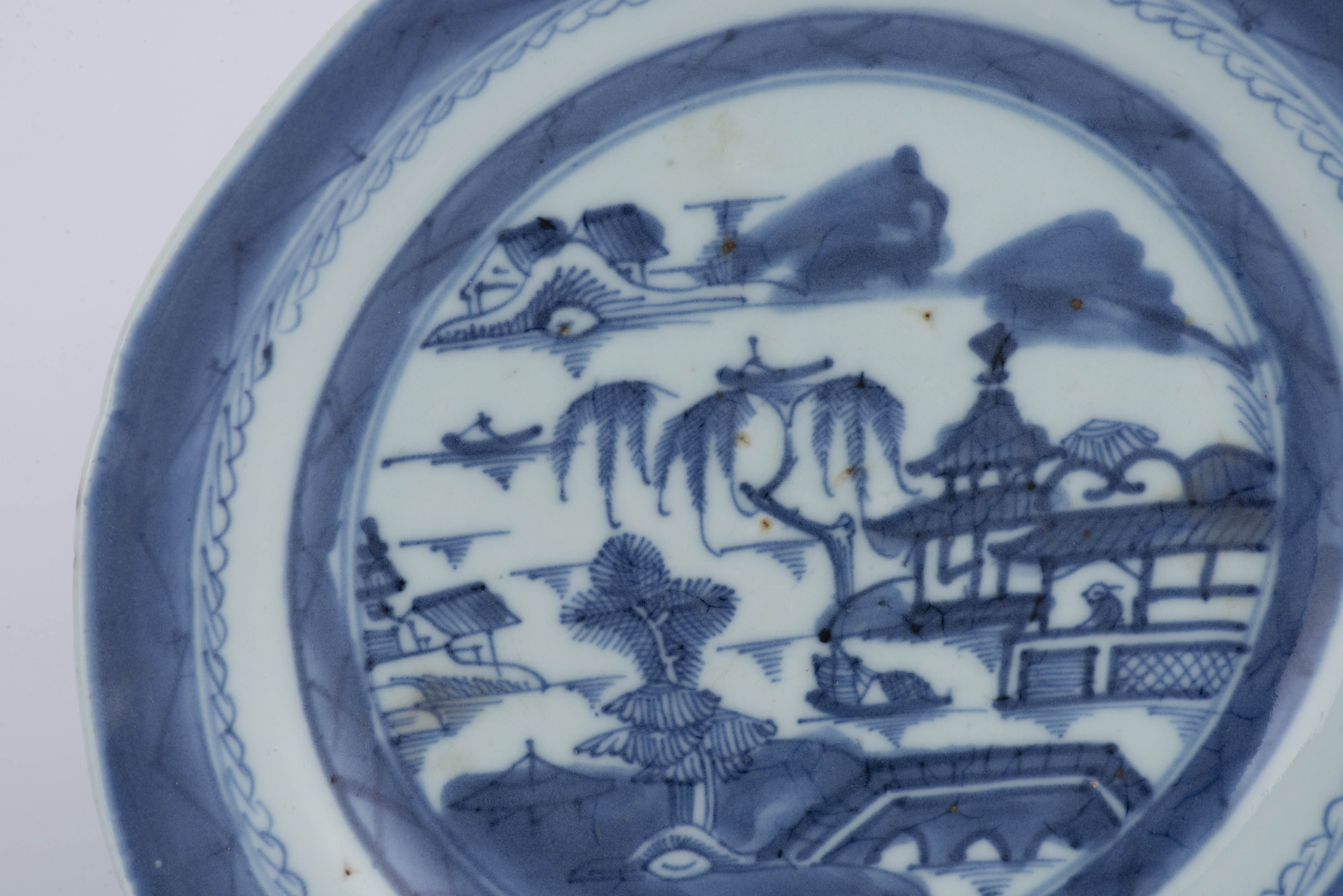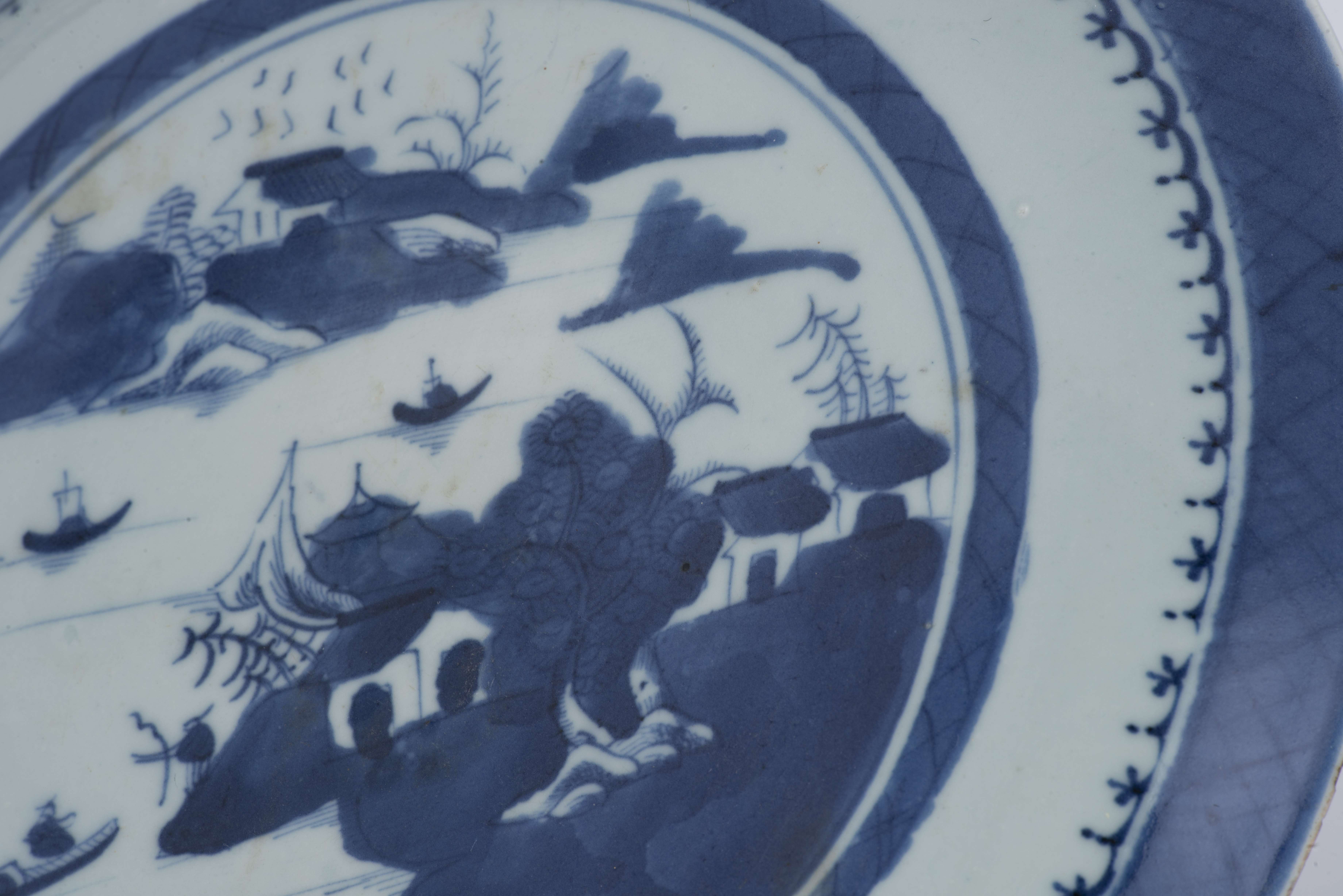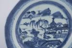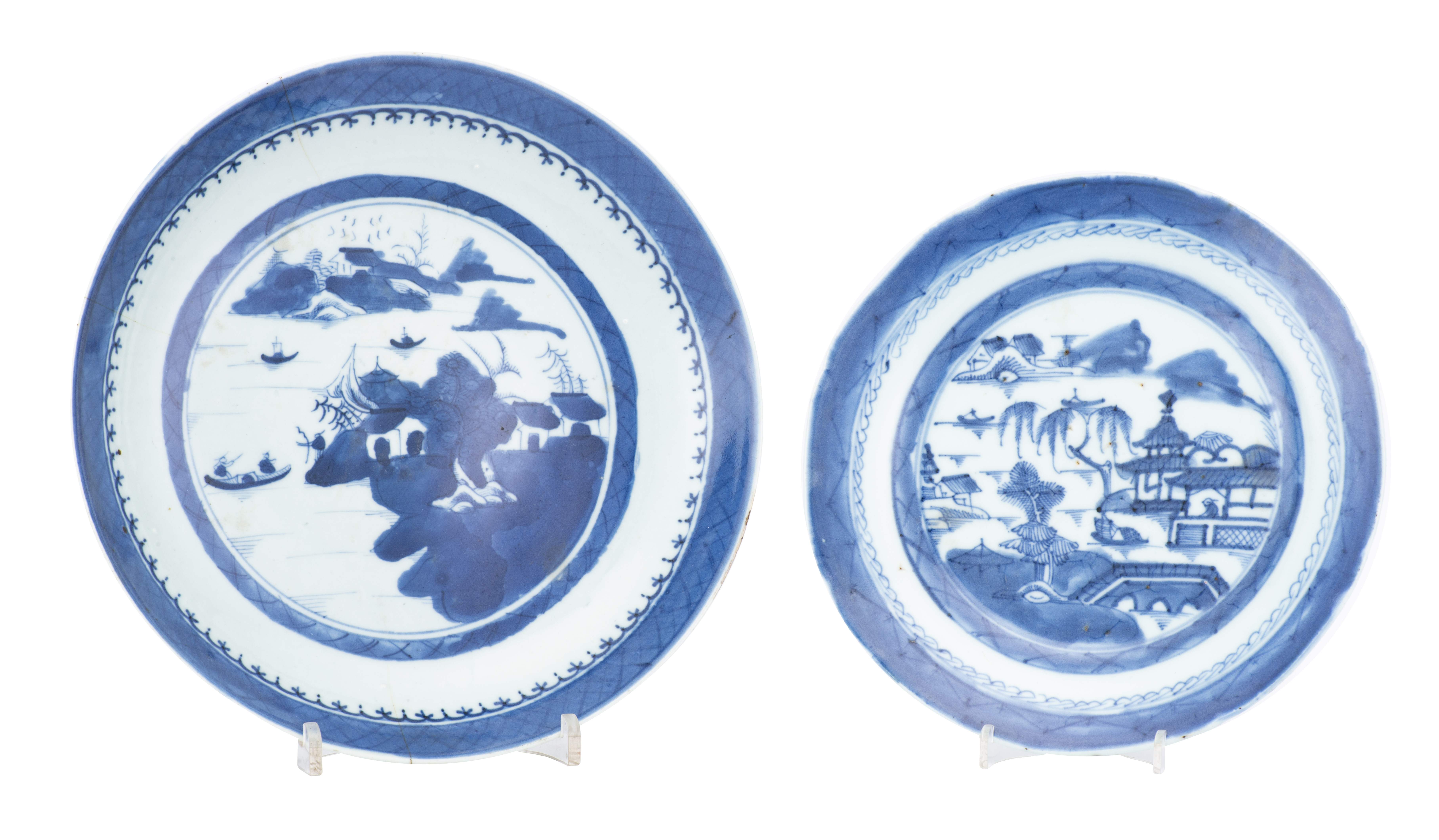 Deux assiettes en porcelaine de Chine à décor en bleu & blanc de paysages lacustres, XIXe.