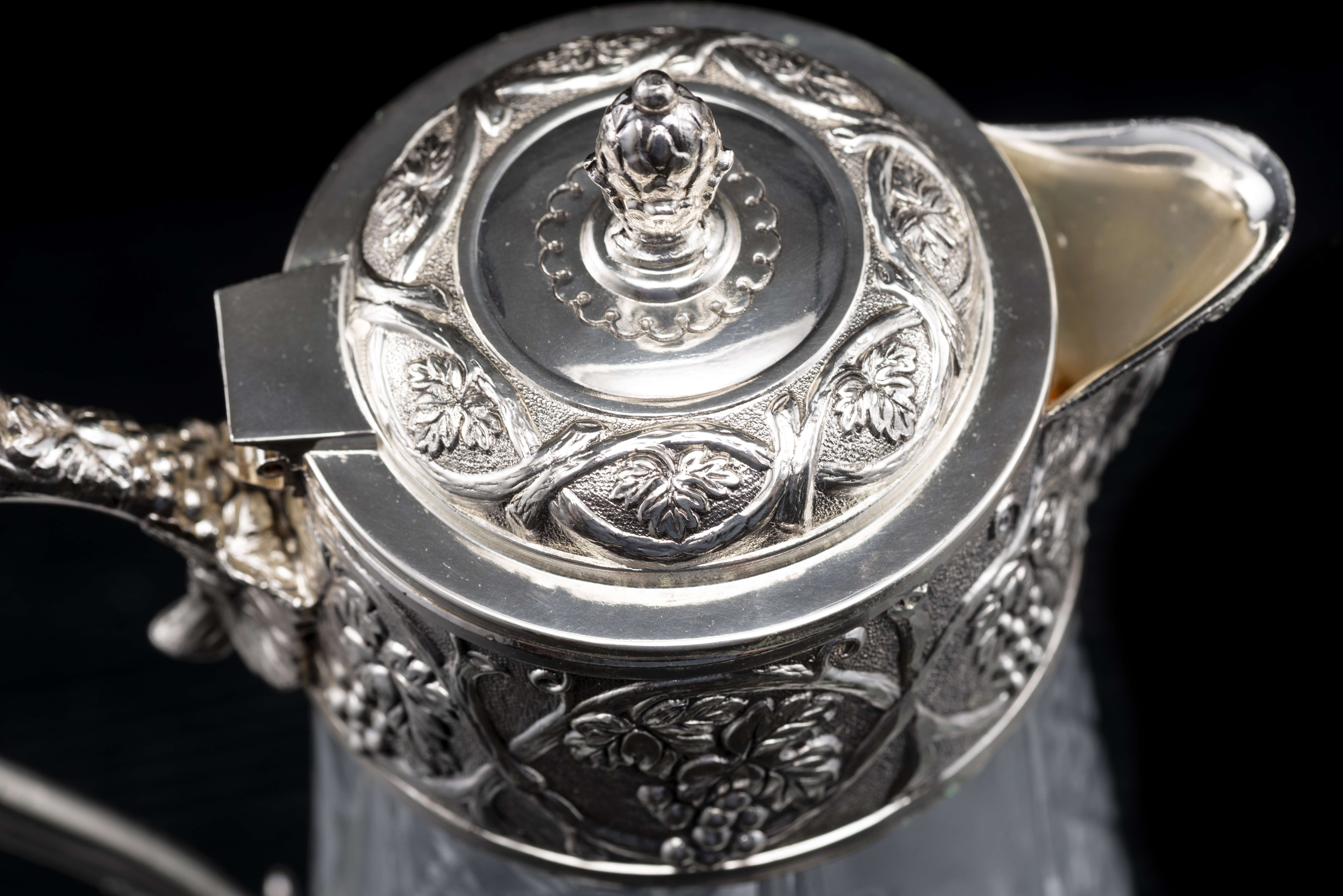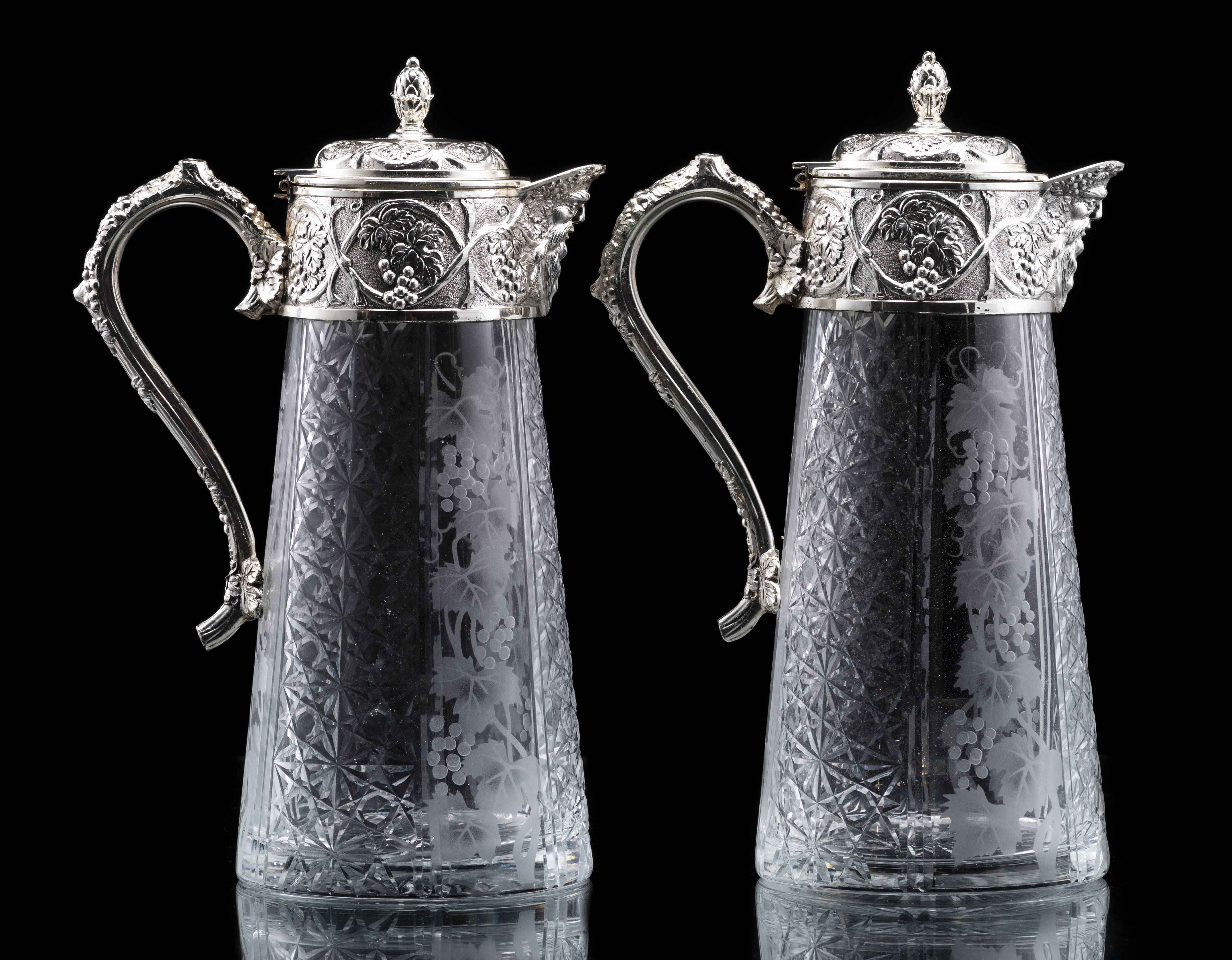 Deux carafes à vin à anses, bec verseur et couvercle en métal argenté à décor de grappes de raisin et tête de Bacchus, contenant en cristal taillé à décors verticaux alternés en damier étoilé et ceps de vigne. Cristal, non signé.