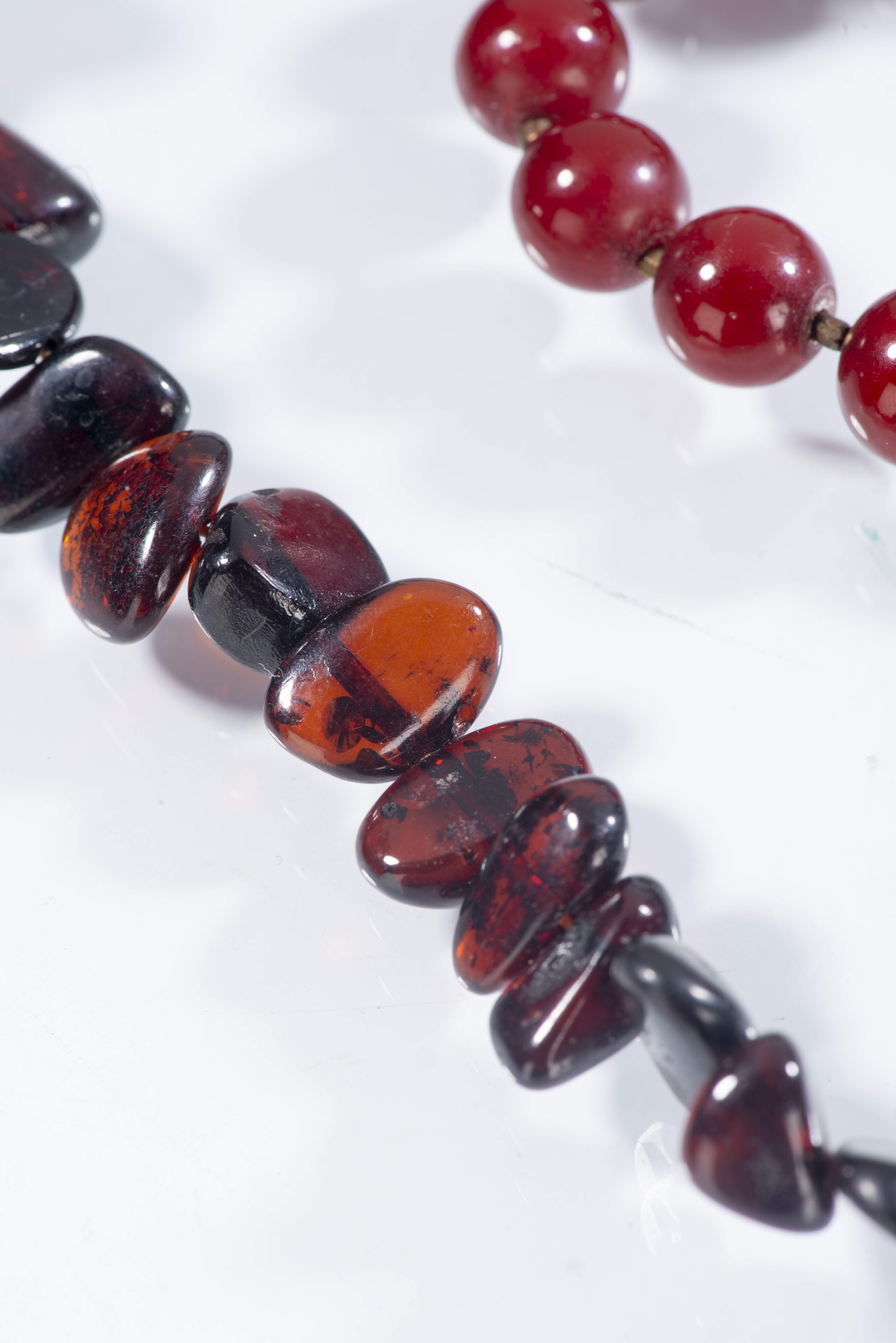 Un collier en perles irrégulières d'ambre rouge foncé très légèrement transclucide.
