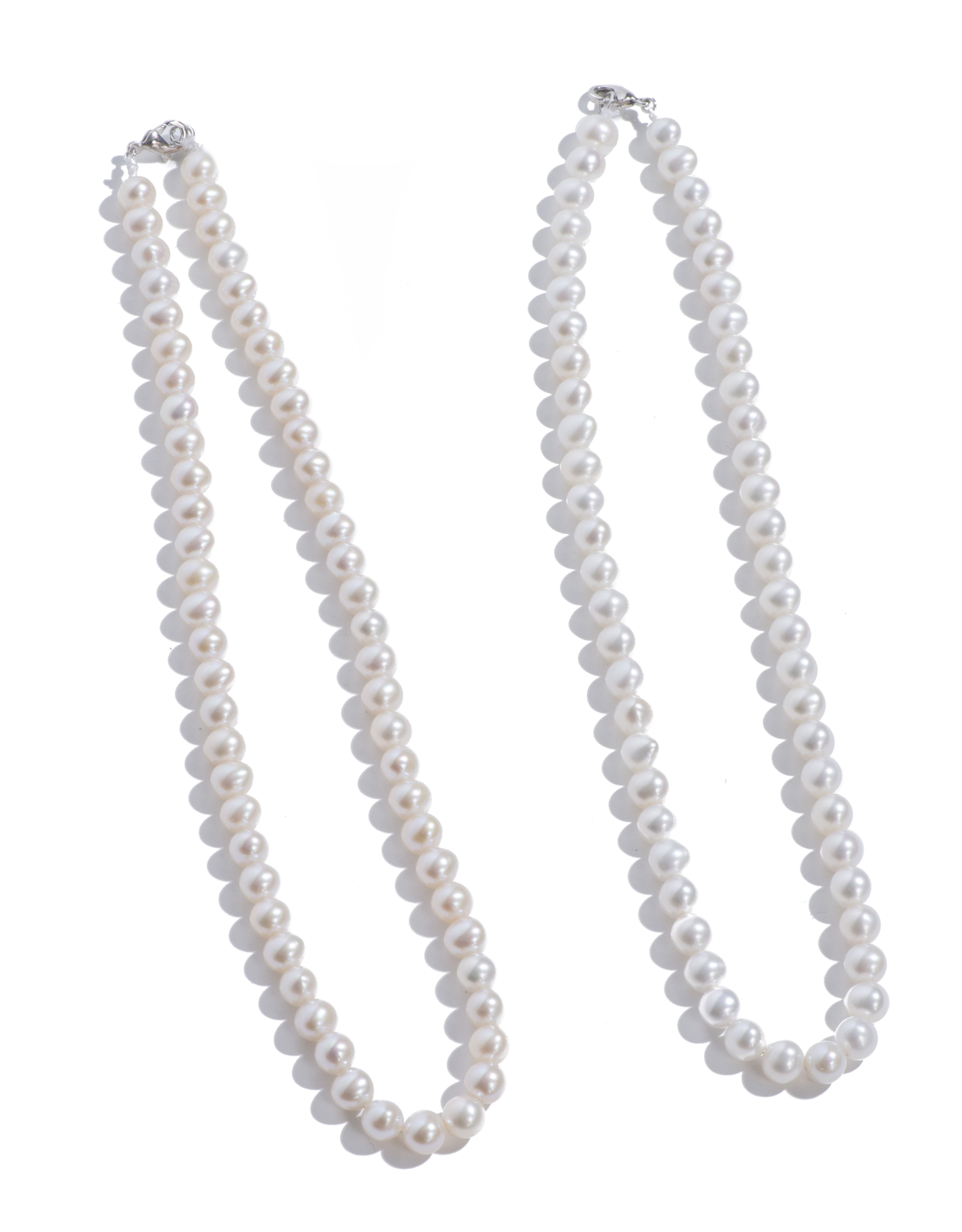 Paire de deux colliers choker de perles d'eau douce avec fermoir en métal argenté.