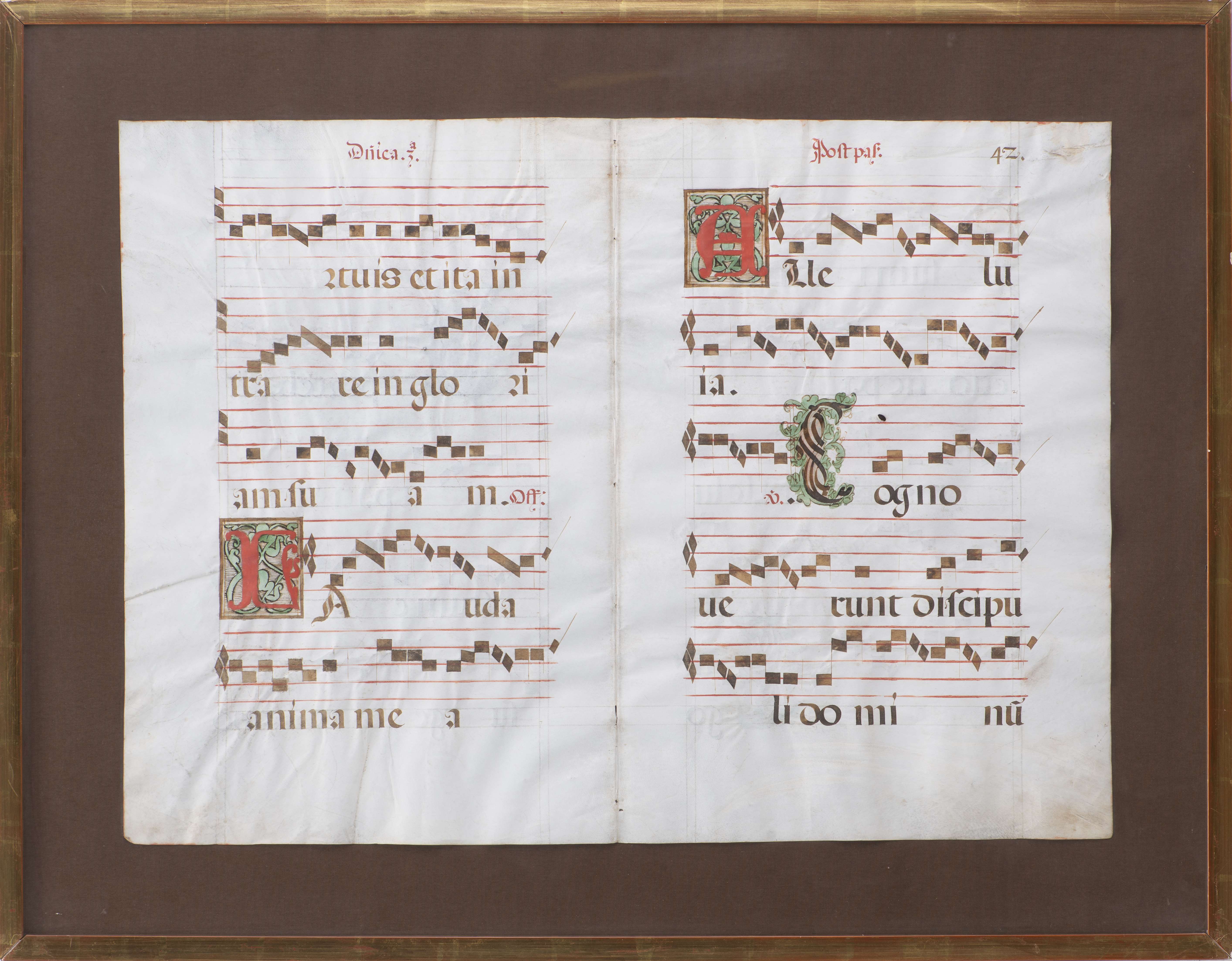 Deux double feuilles d'Antiphonaires avec lettrines et neumes sur parchemin, encadrées.