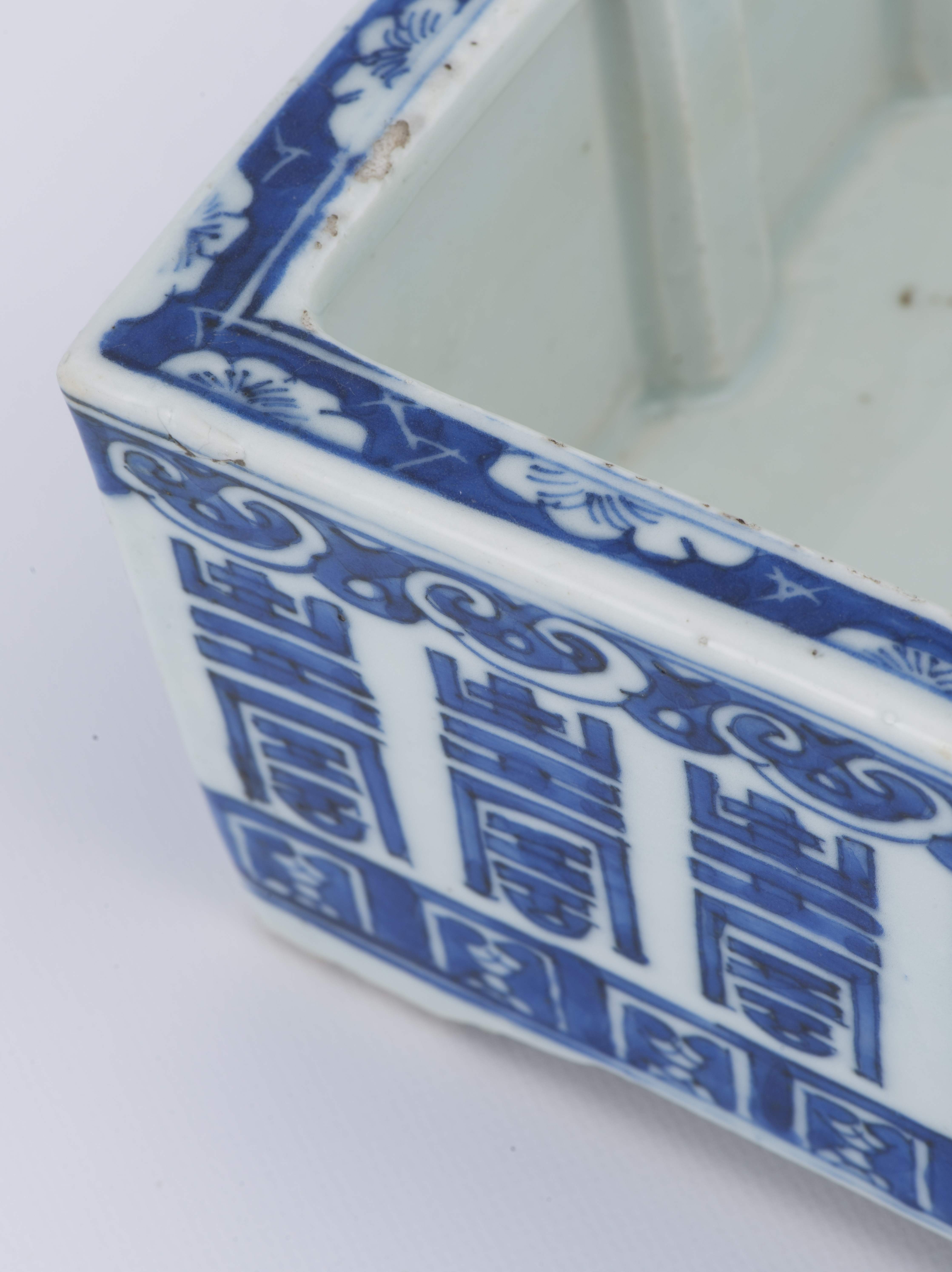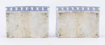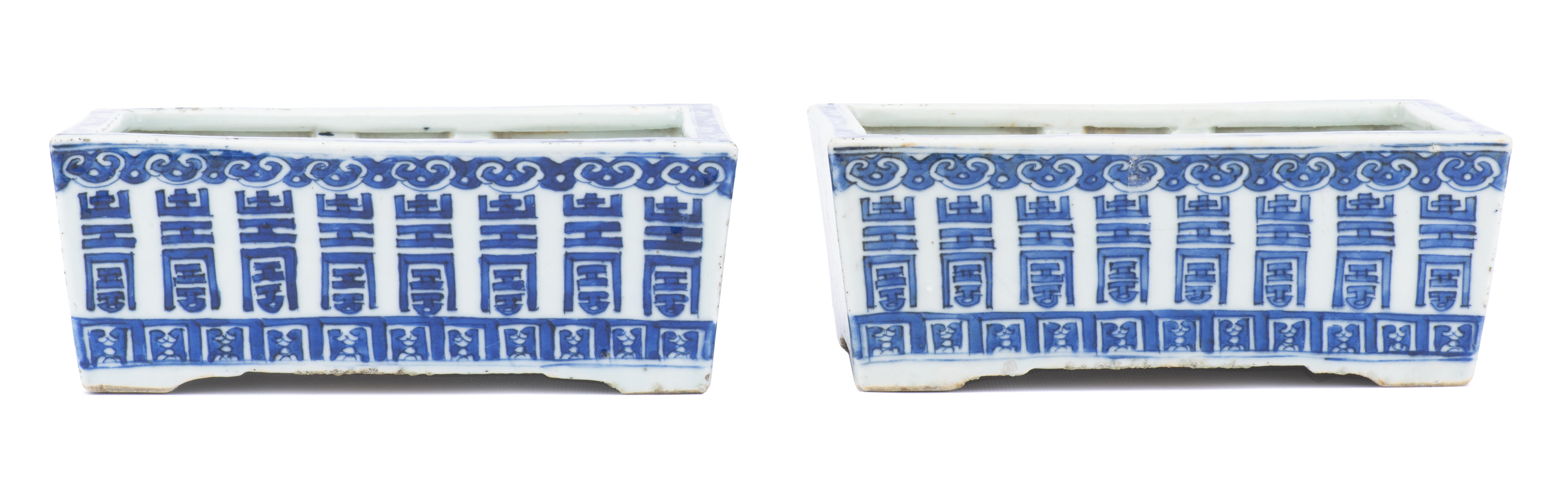Deux jardinières rectangulaires en porcelaine de Chine à décor en bleu & blanc en registres. La lèvre est décorée sur le dessus d'une frise de fleurs de pruniers sur un champ bleu 'ice crackled', le bandeau vertical de la lèvre d'une frise de Ruyi, la panse d'une frise de caractères Shou (longue vie), et vers la base, le registre présente une frise de feuilles terminée par quatre pieds allongés aux angles. Epoque Qing XIXe.
