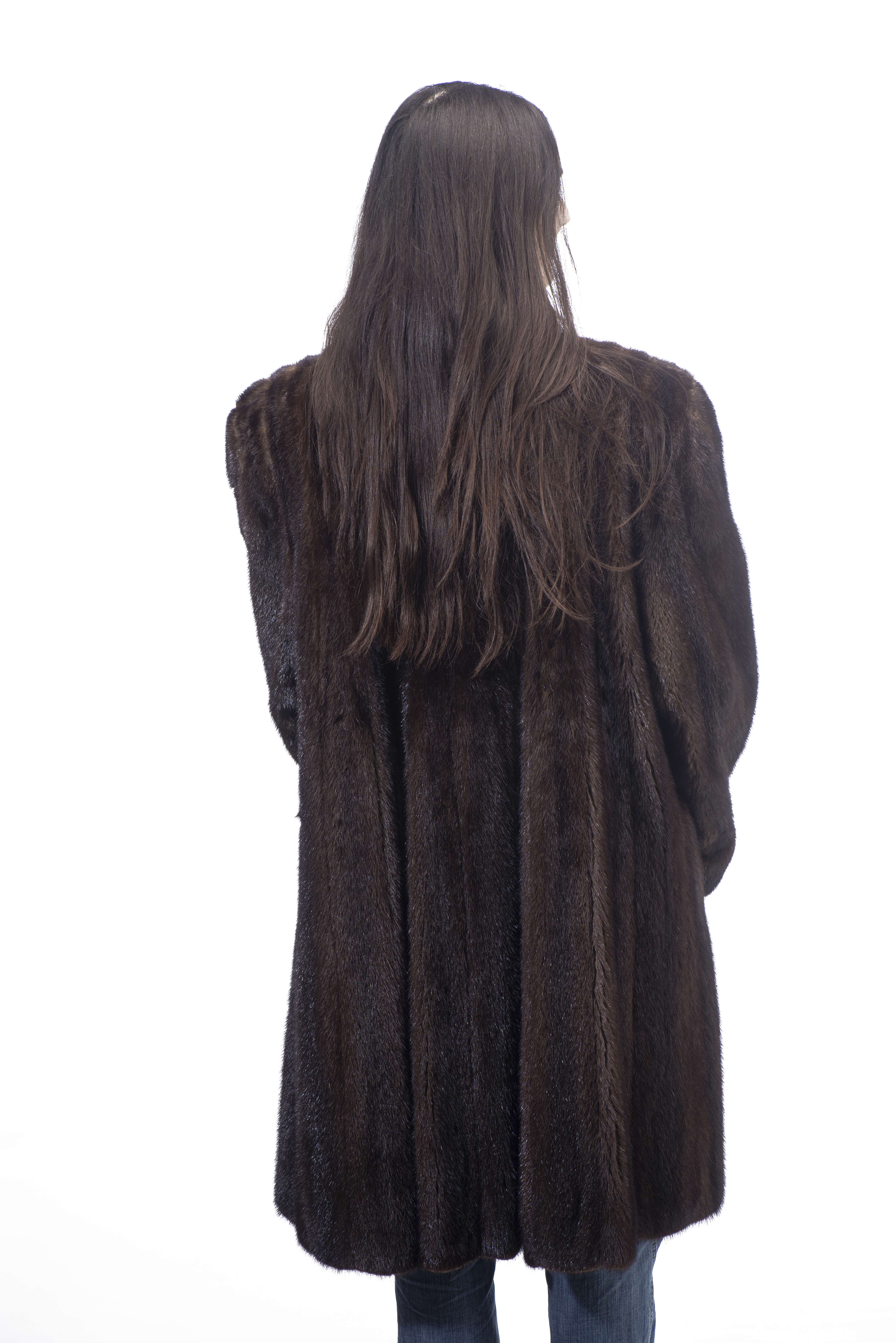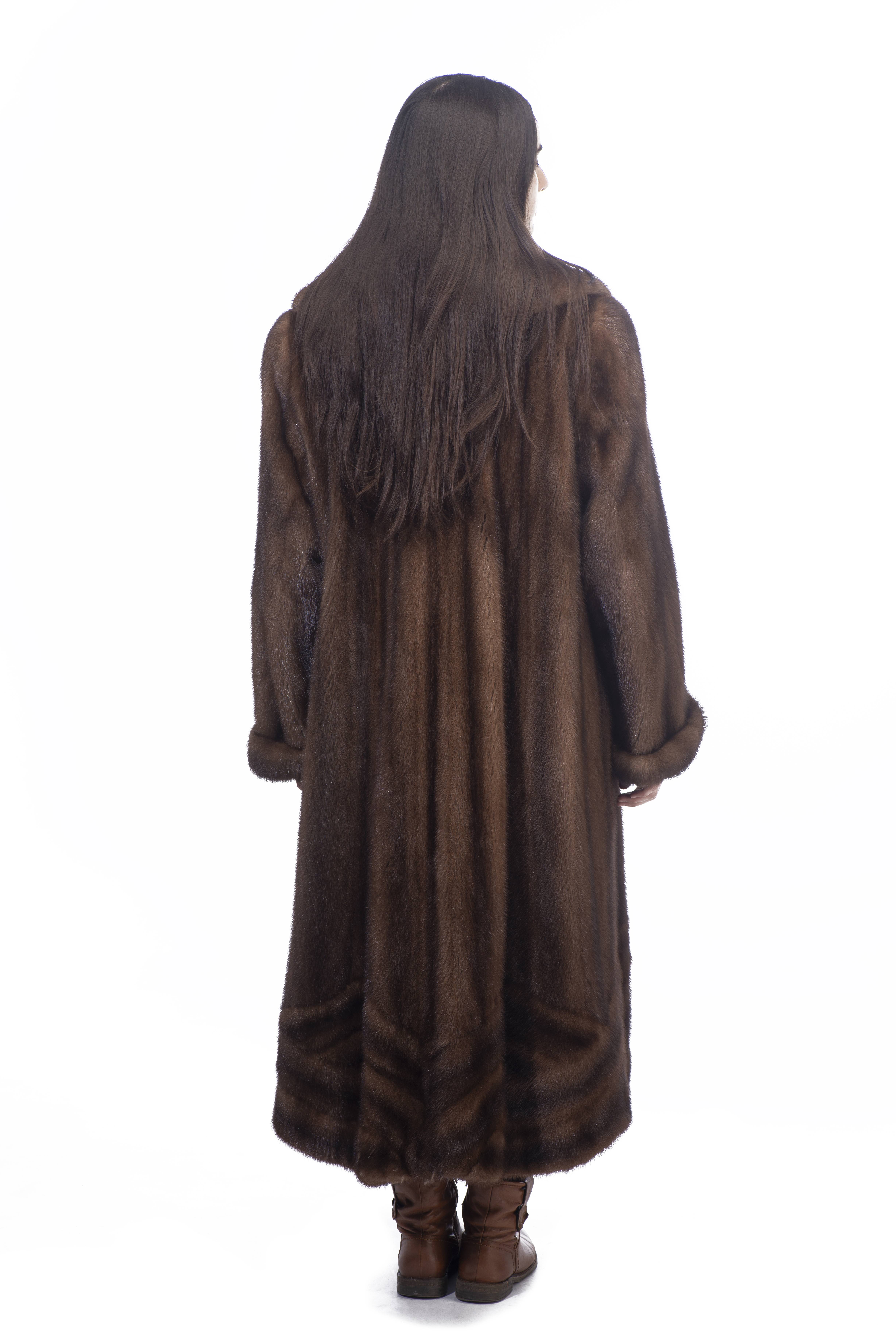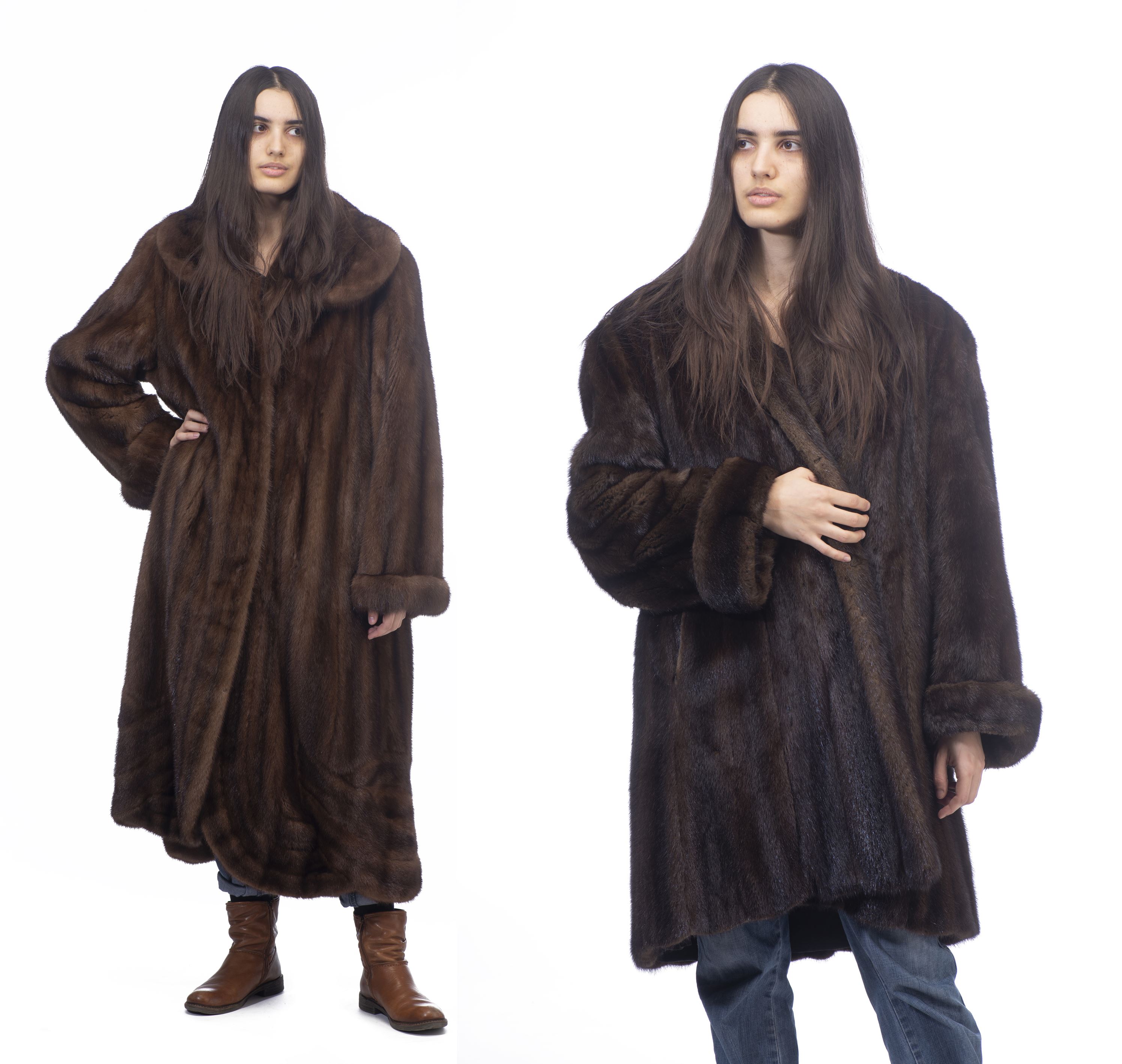 Deux manteaux longs de vison brun Benjamin Fourrures Lausanne Genève env. T. 46.