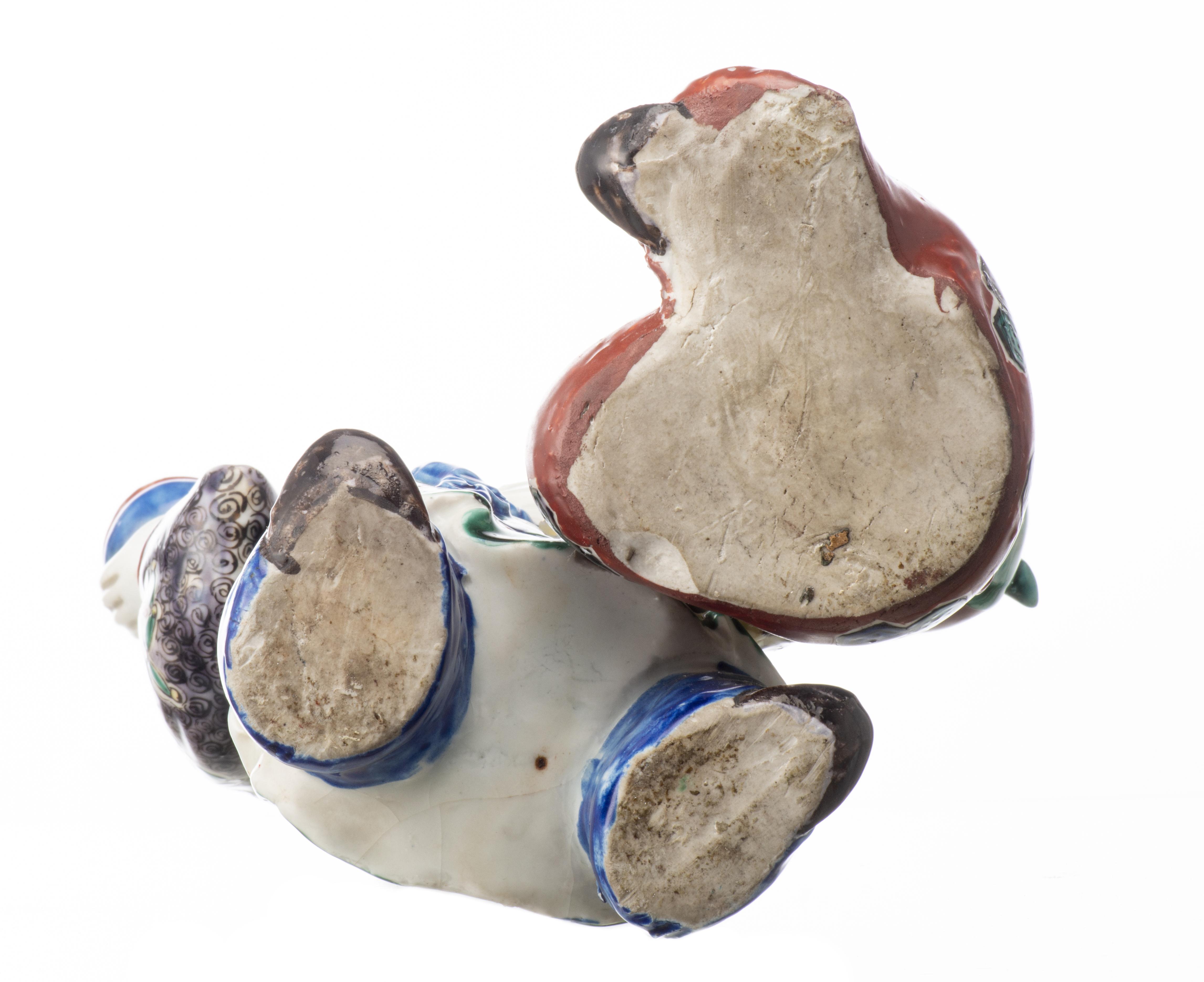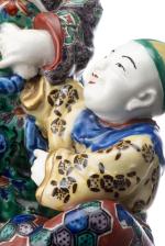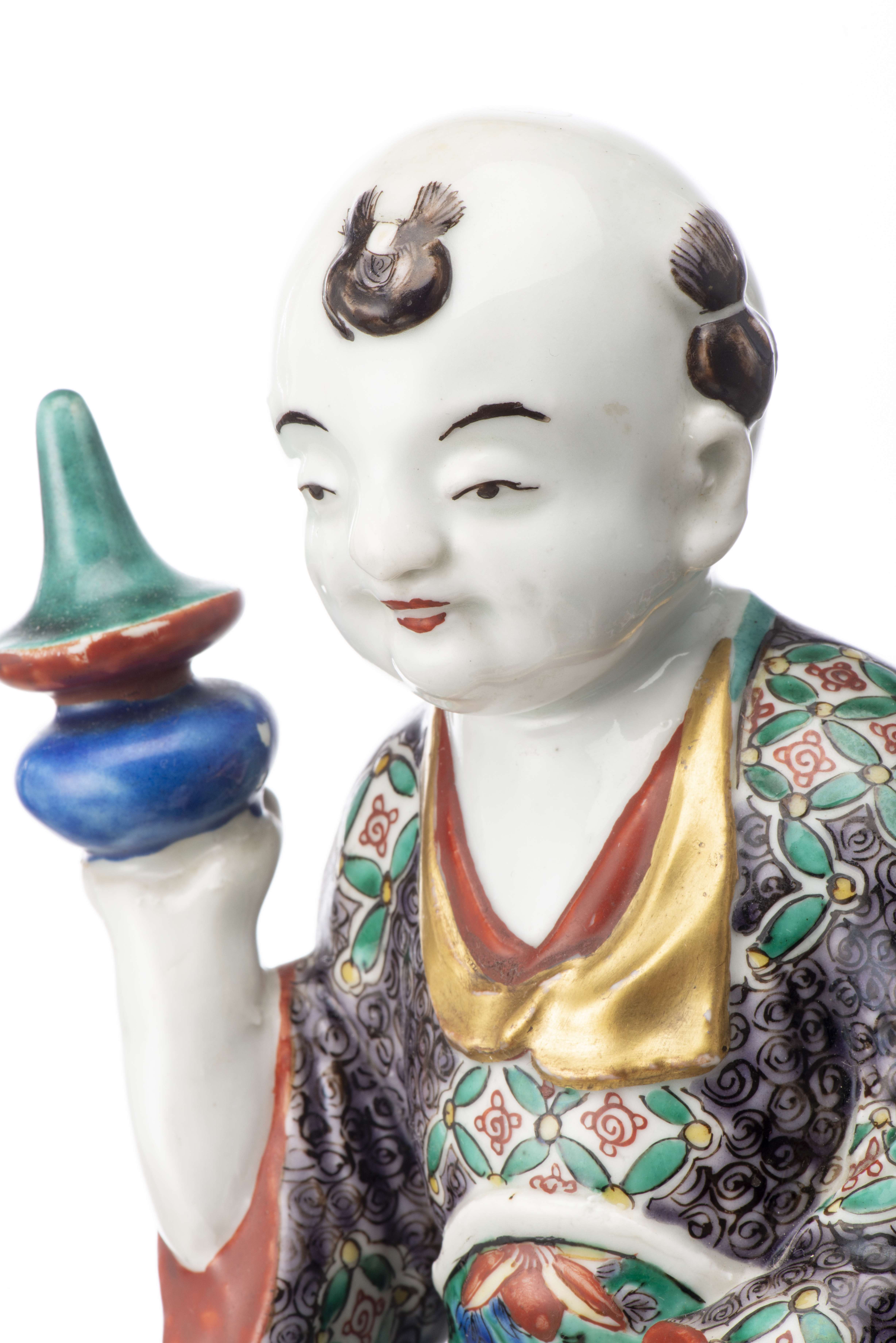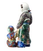 Deux petits garçons en porcelaine de Kutani du Japon, celui debout porte une lanterne.