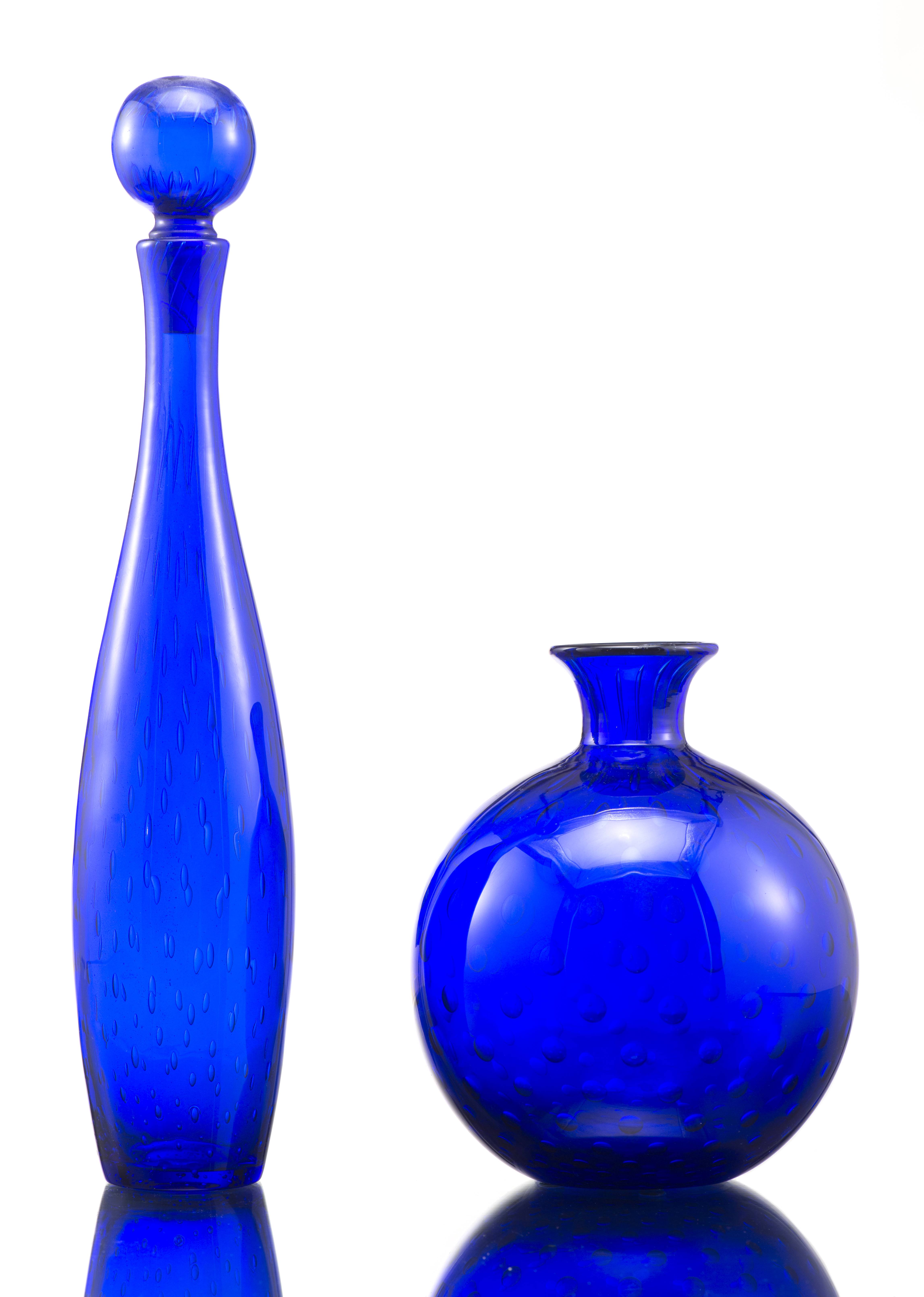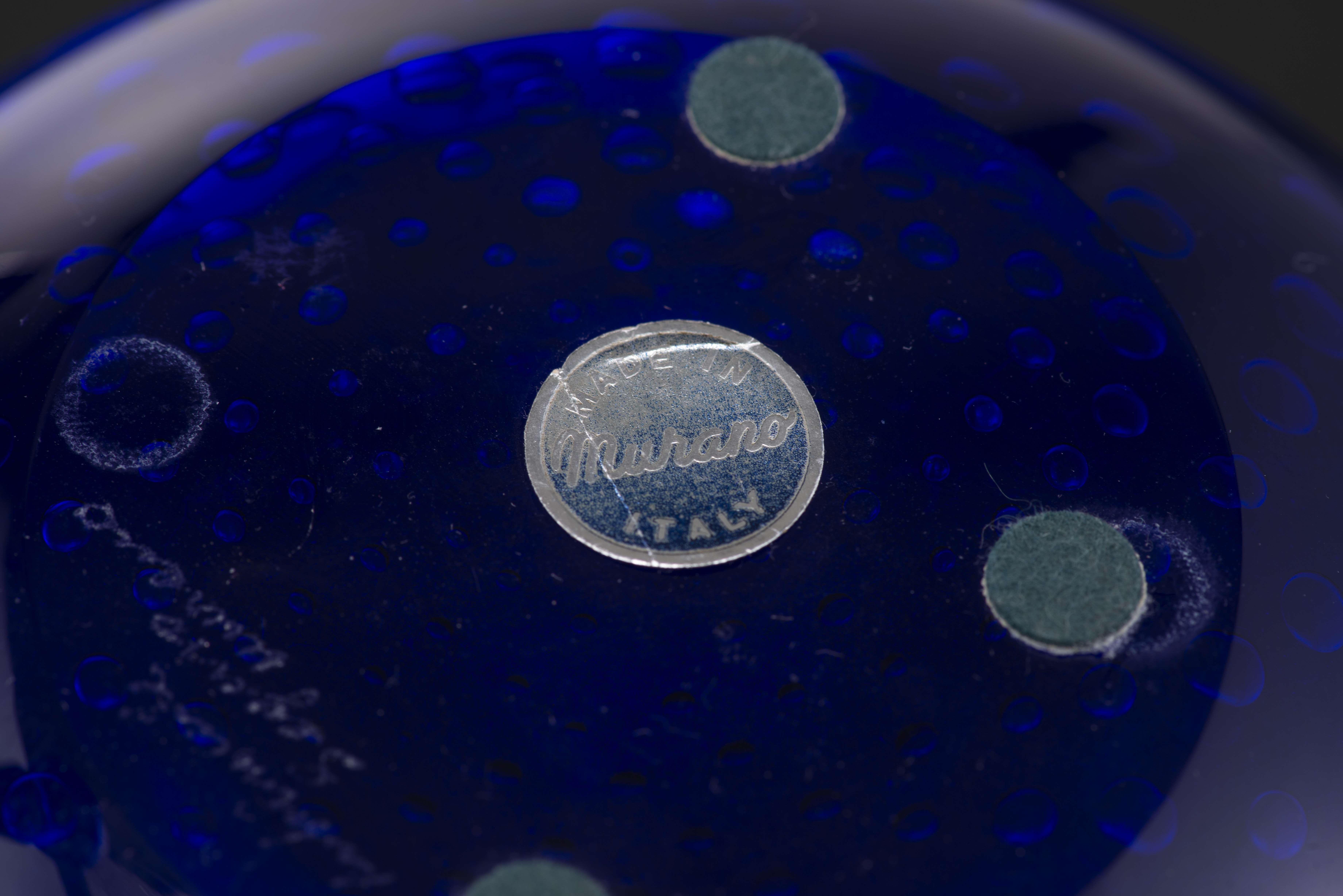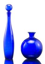 Deux pièces en verre bleu de Murano par Archimede Seguso à décor bullé :