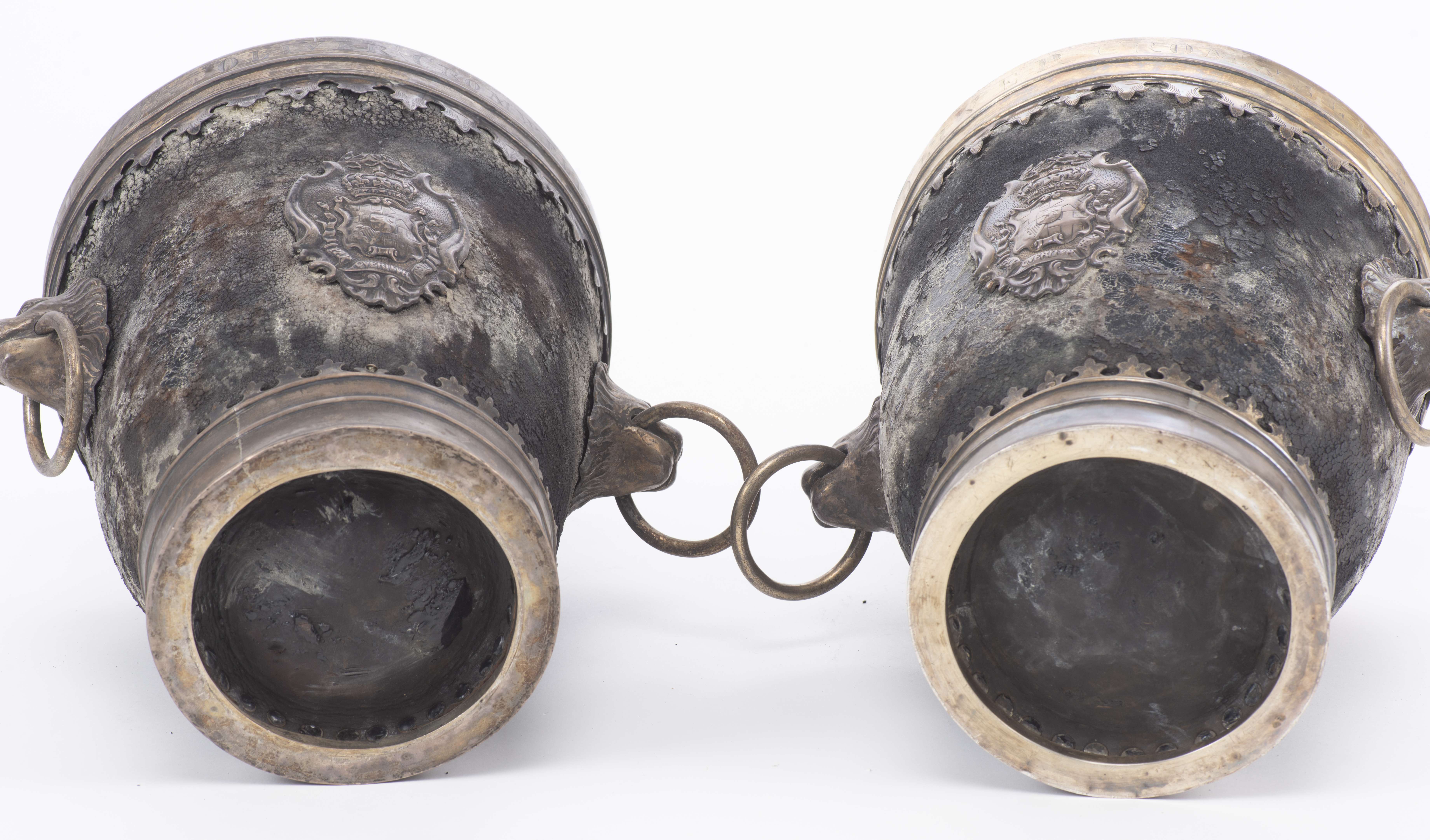 Deux seaux à incendie en cuir et métal argenté inscrits "Oliver Cromwell, Lord Protector of England Scotland and Ireland * 1653* " avec armoiries couronnées et sa devise "Pax Qveritva Bello" ainsi que deux mascarons de têtes de lion à anneaux sur la panse.