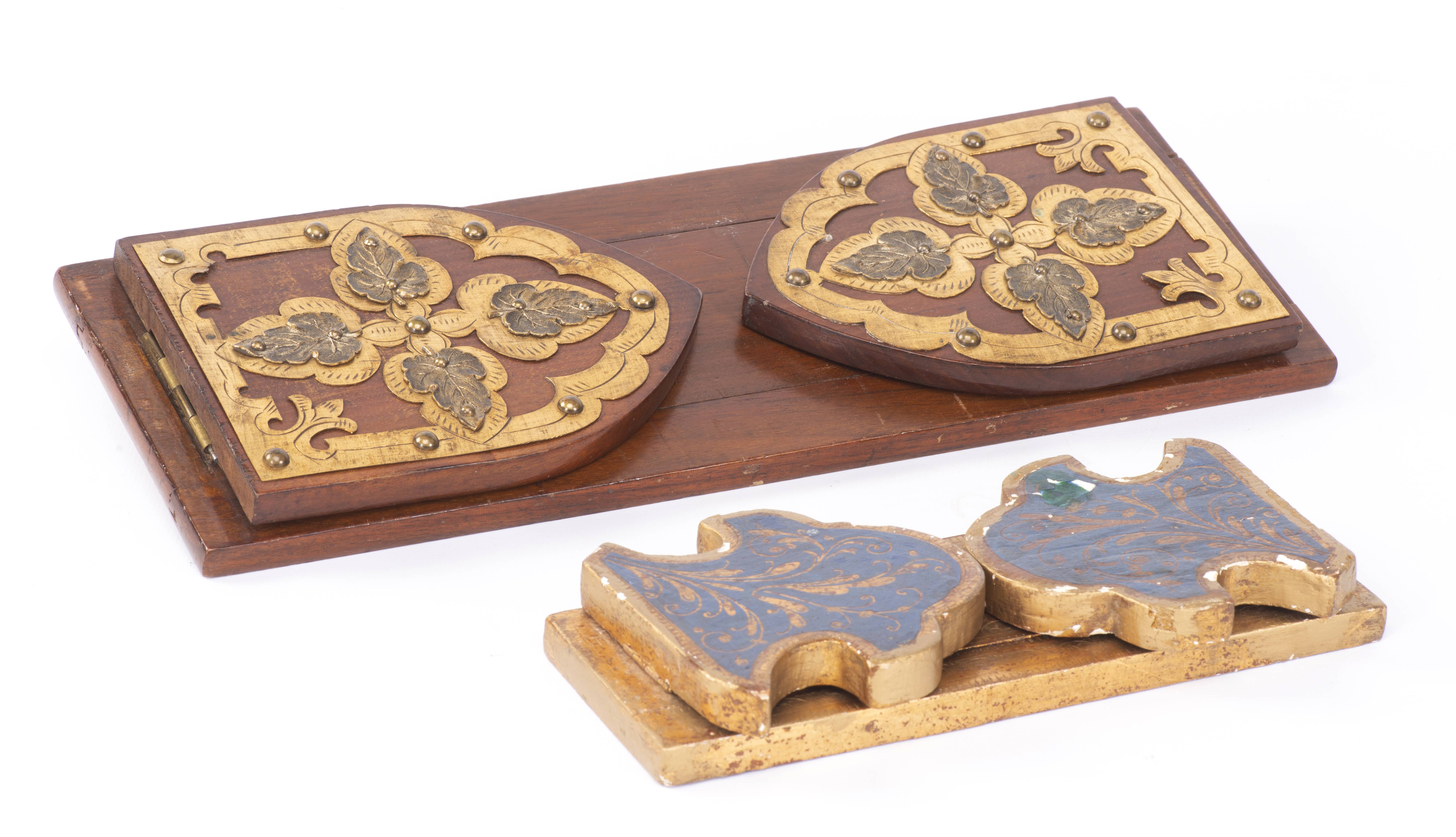 - un en bois teinté recouvert partiellement de métal doré et feuilles.