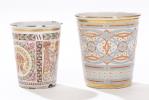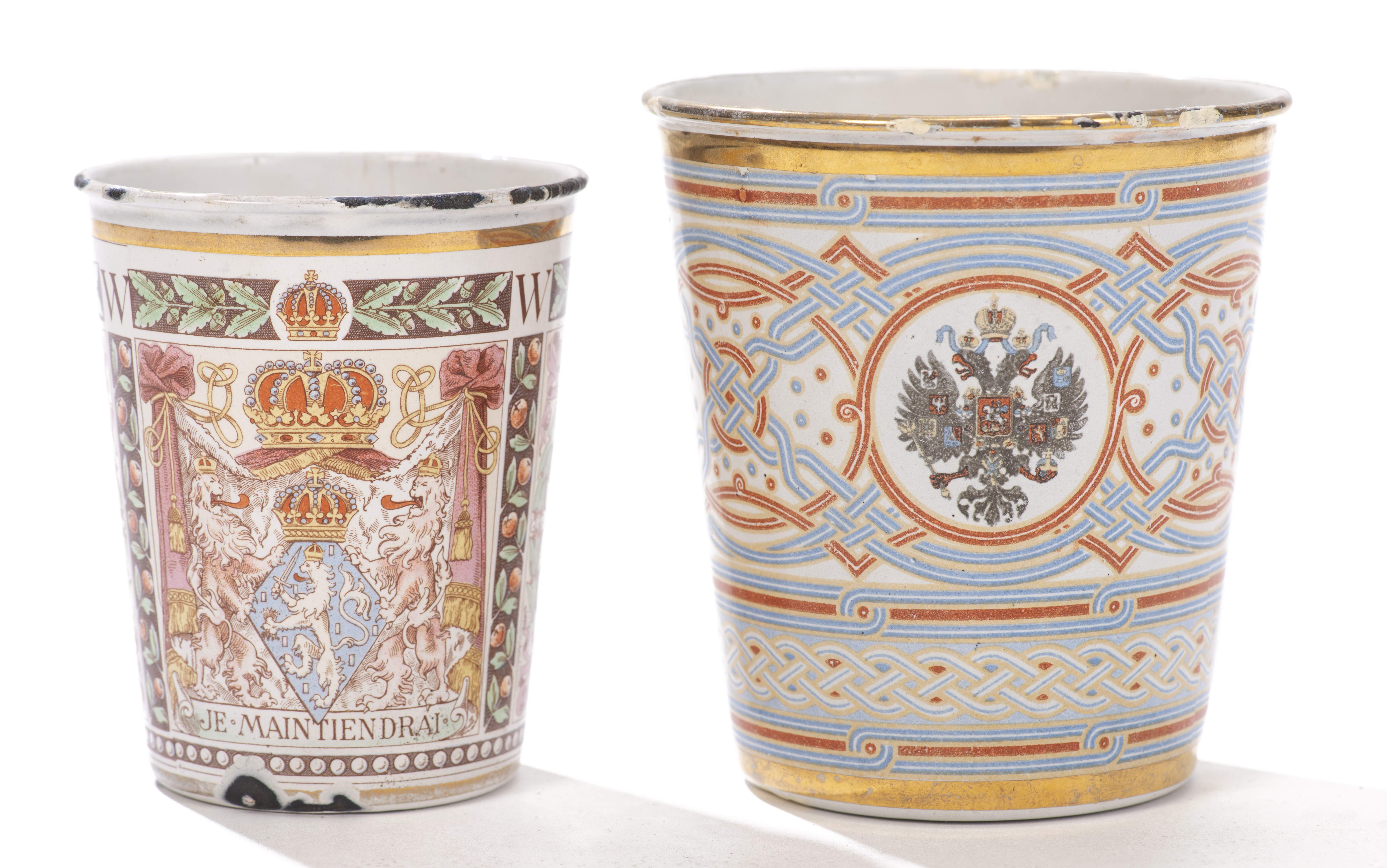- l'une à décor d'entrelacs rouges et bleus formant des réserves. Cerclée de filets dorés sous le col et au niveau du pied, elle porte l'aigle bicéphale couronné, la date de 1896 et les initiales de Nicolas II.