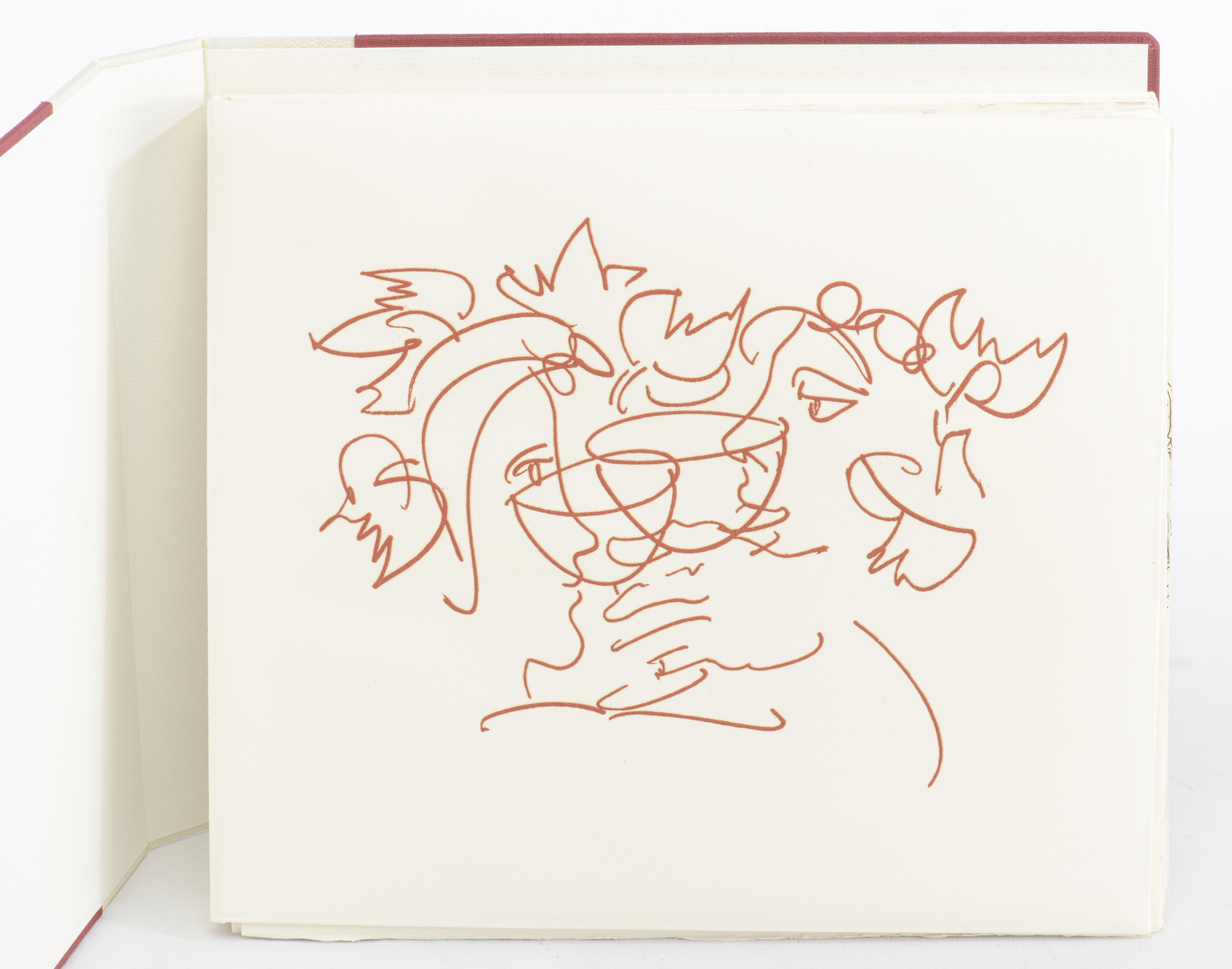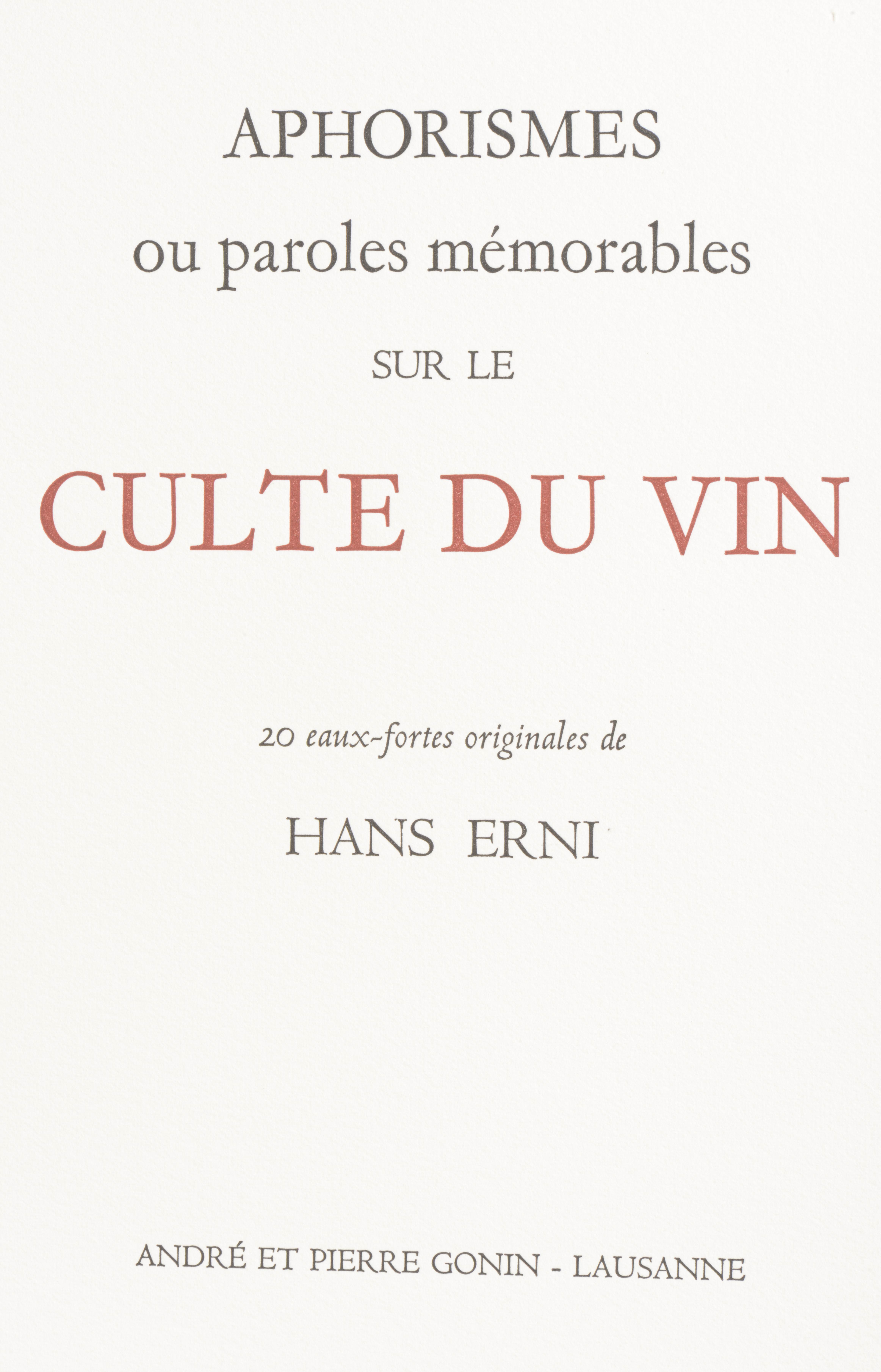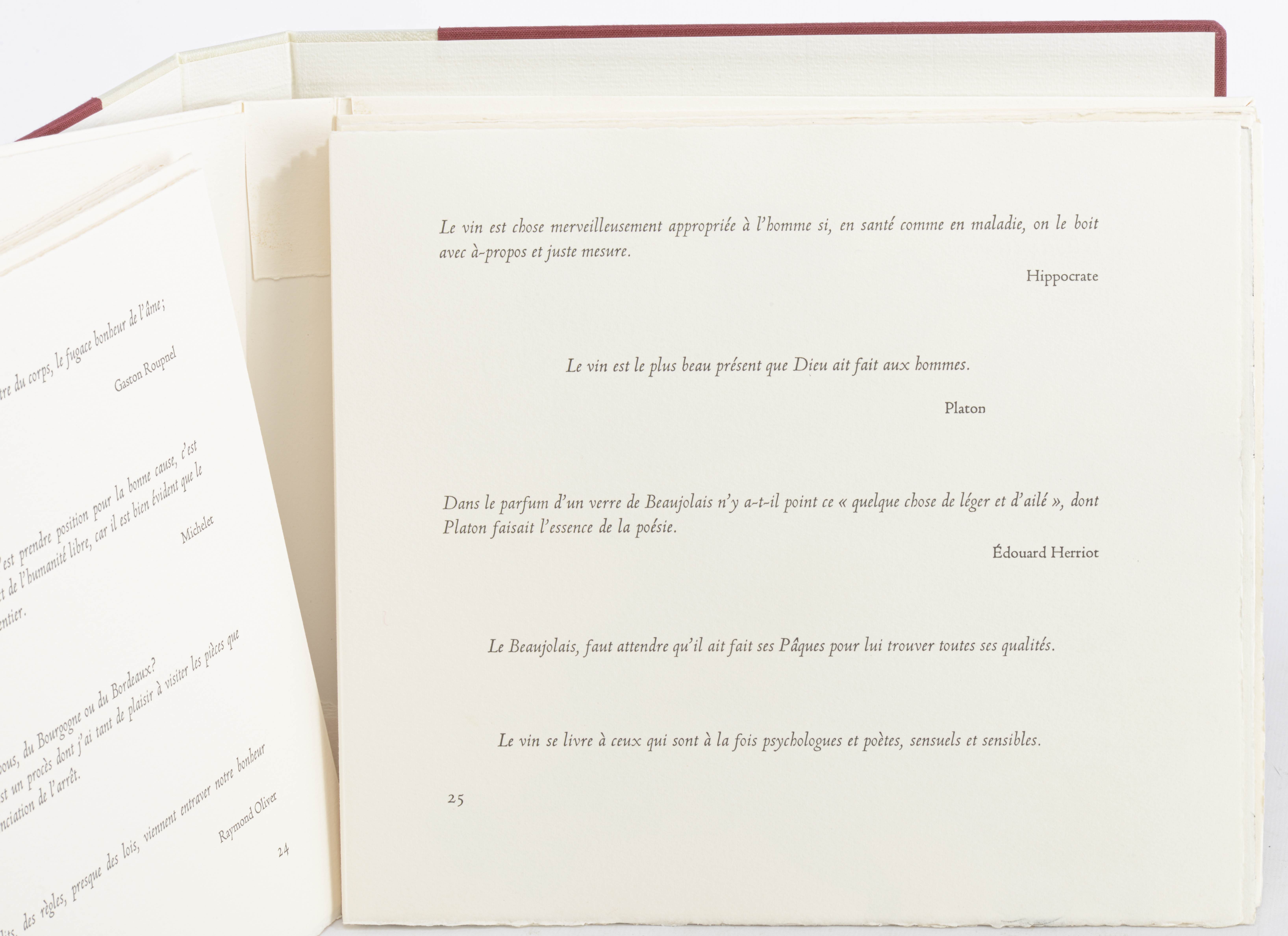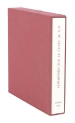 Hans ERNI, DIVERS AUTEURS, "Aphorismes ou paroles mémorables sur le culte du vin", éditions André et Pierre Gonin, 1990, Lausanne, In-8 oblong en feuilles sous chemise illustrée et emboîtage d'éditeur tissu bordeau, illustré de 20 eaux-fortes originales de Hans Erni tirées sur les presses à bras de l'Atelier de taille-douce à Saint-Prex, sous la direction de Michel Duplain, tirage du livre limité à 150 exemplaires, celui-ci ex. N° 87 des 108 sur vélin d'Arches.