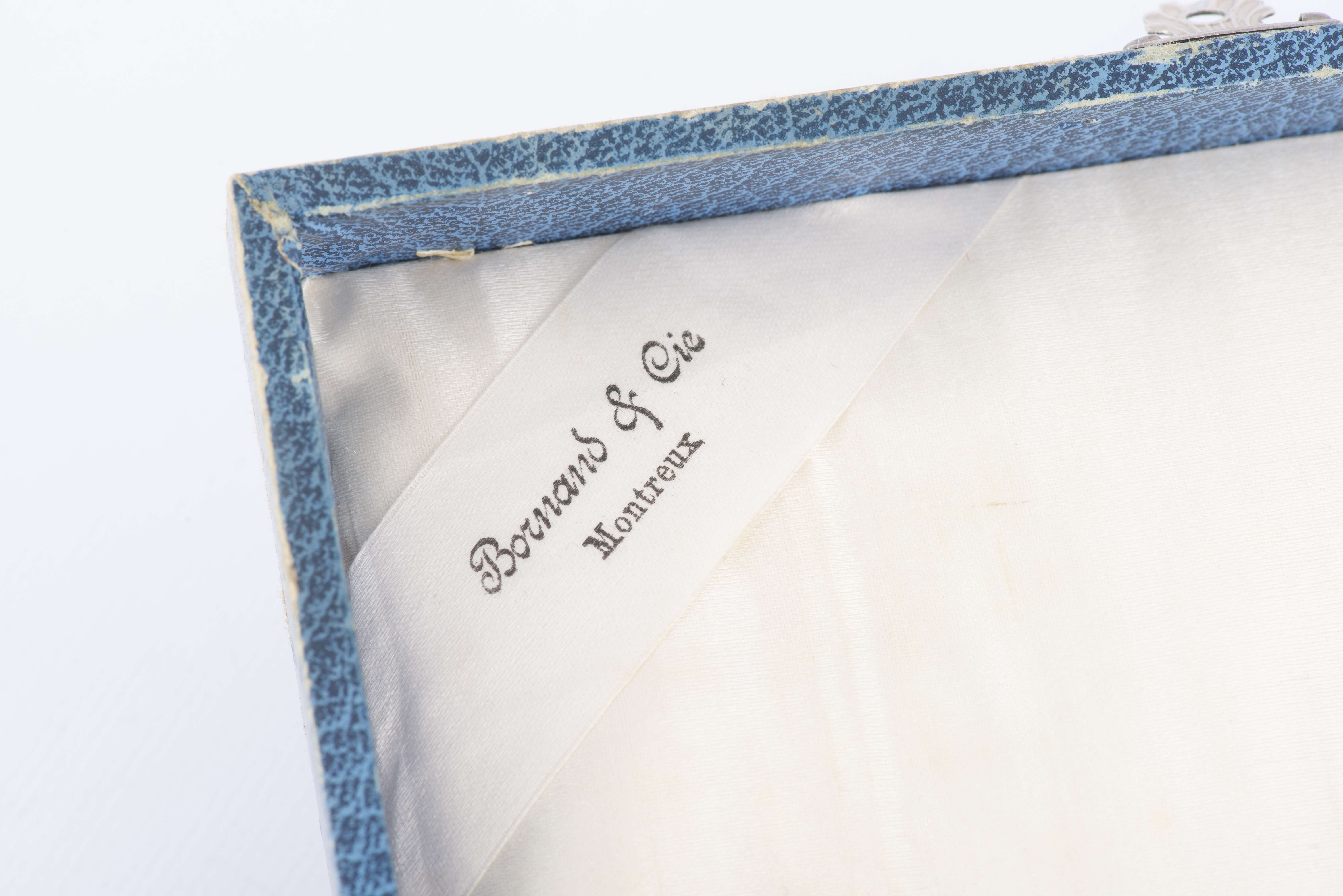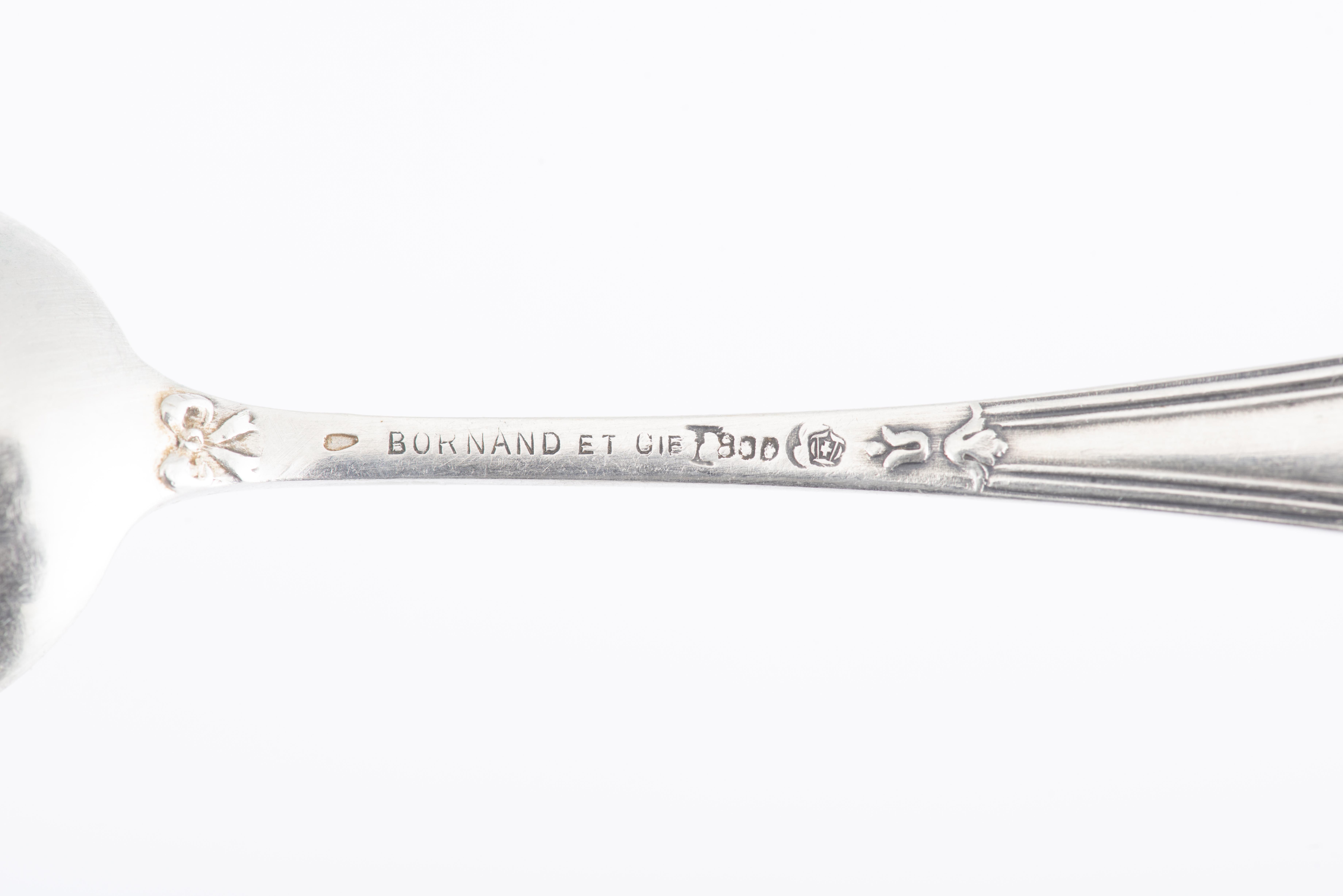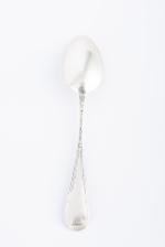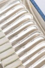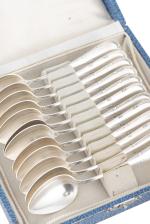 Douze cuillères à thé à décor au ruban croisé en argent .800 allemand par Bornand et Cie, dans son écrin.