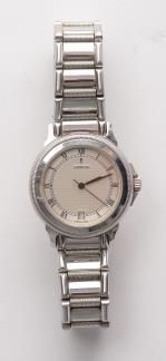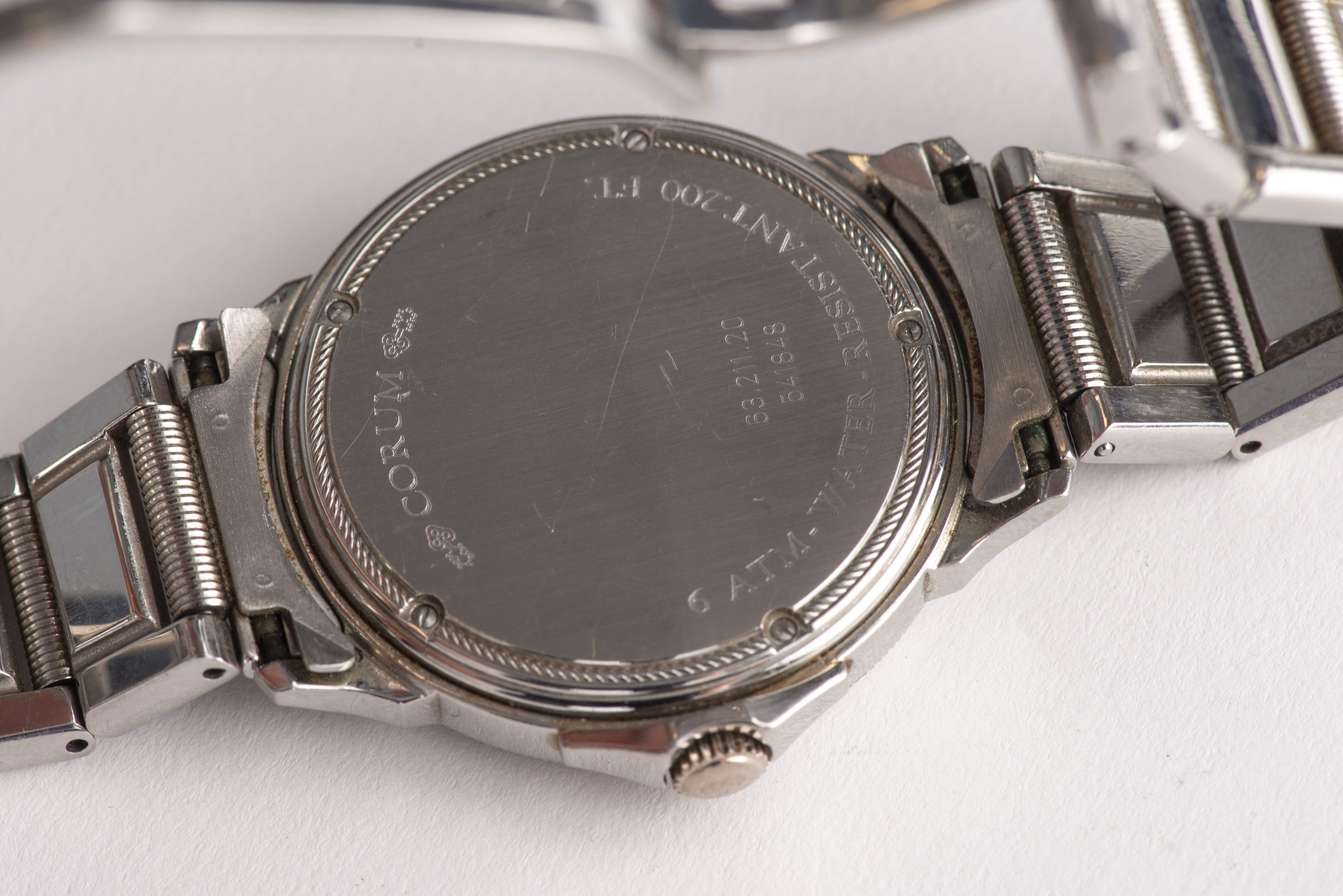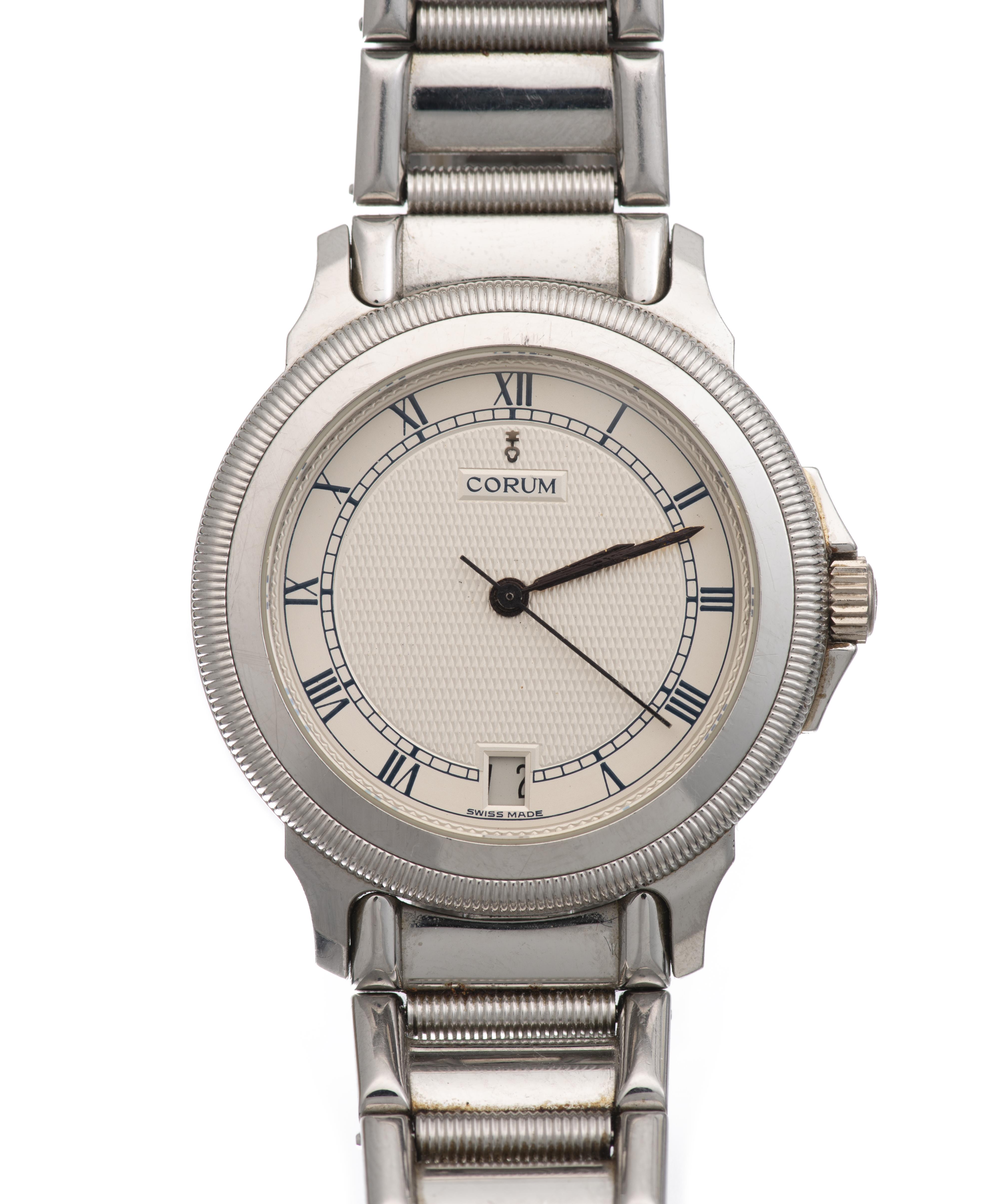 CORUM montre-bracelet homme en métal chromé, mvt quartz, à guichet de date à 6h, index des heures à chiffres romains, aiguille des secondes centrale.