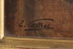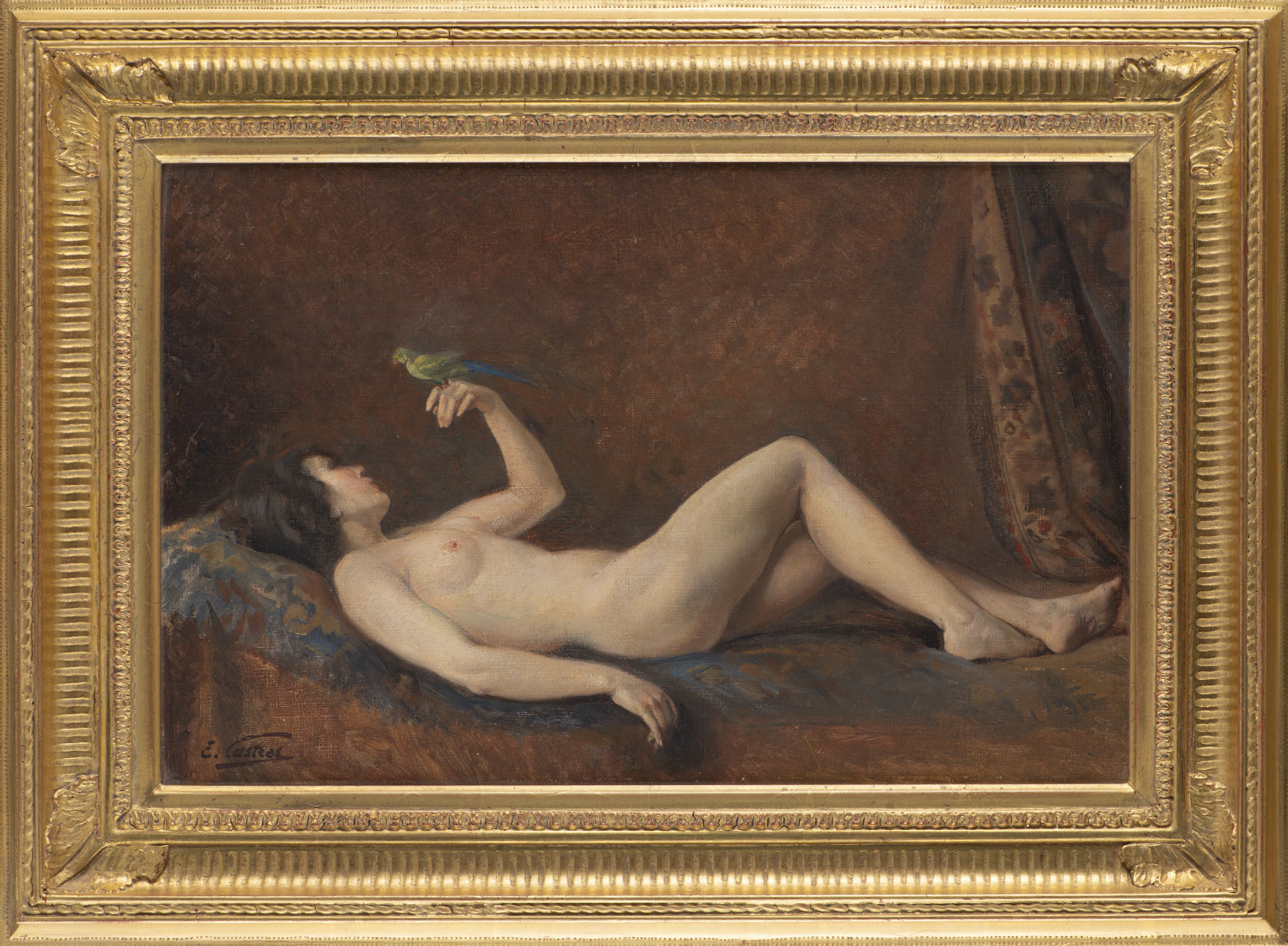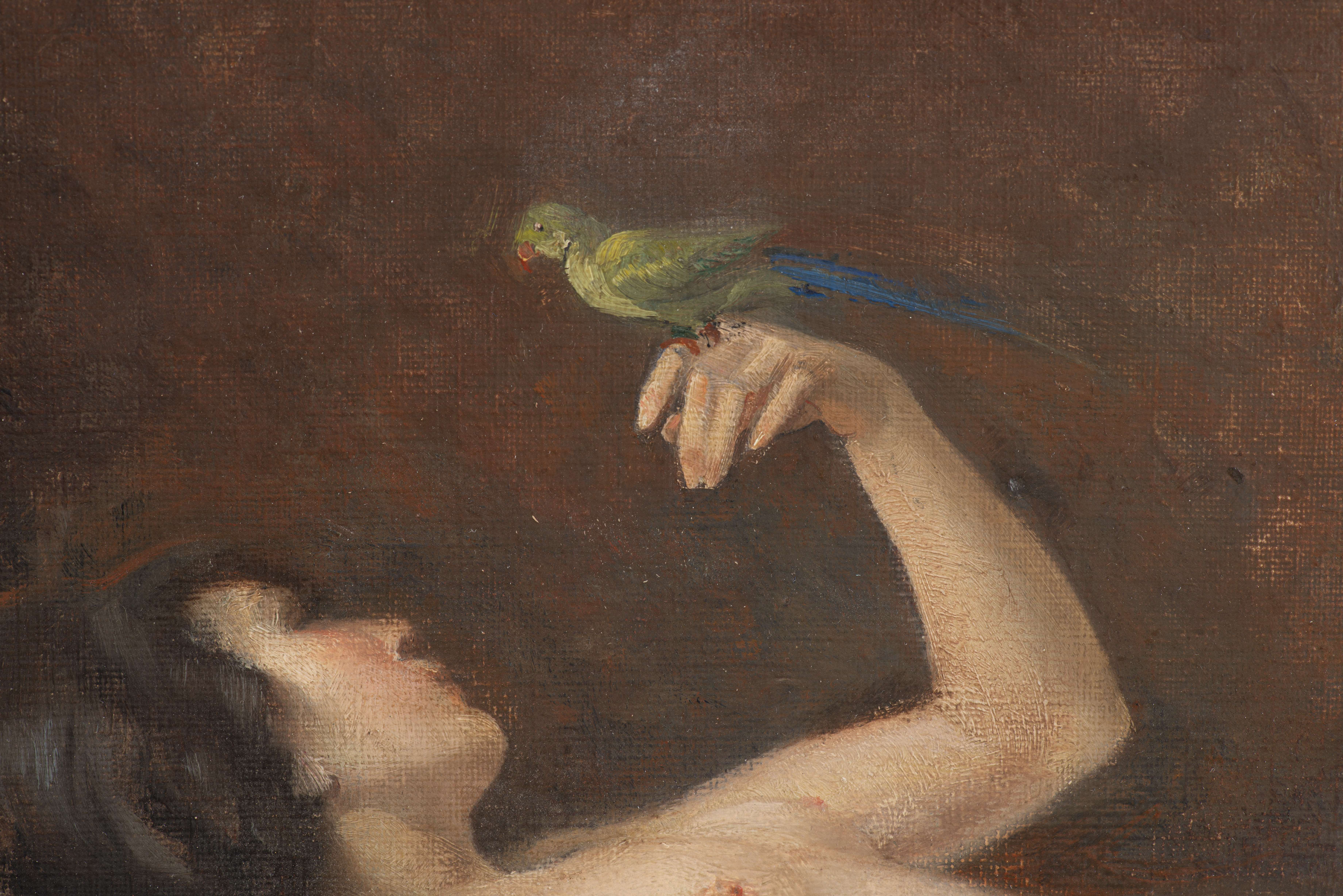 Edouard CASTRES (1838-1902) "Femme à la perruche", huile sur carton, signé en bas à gauche