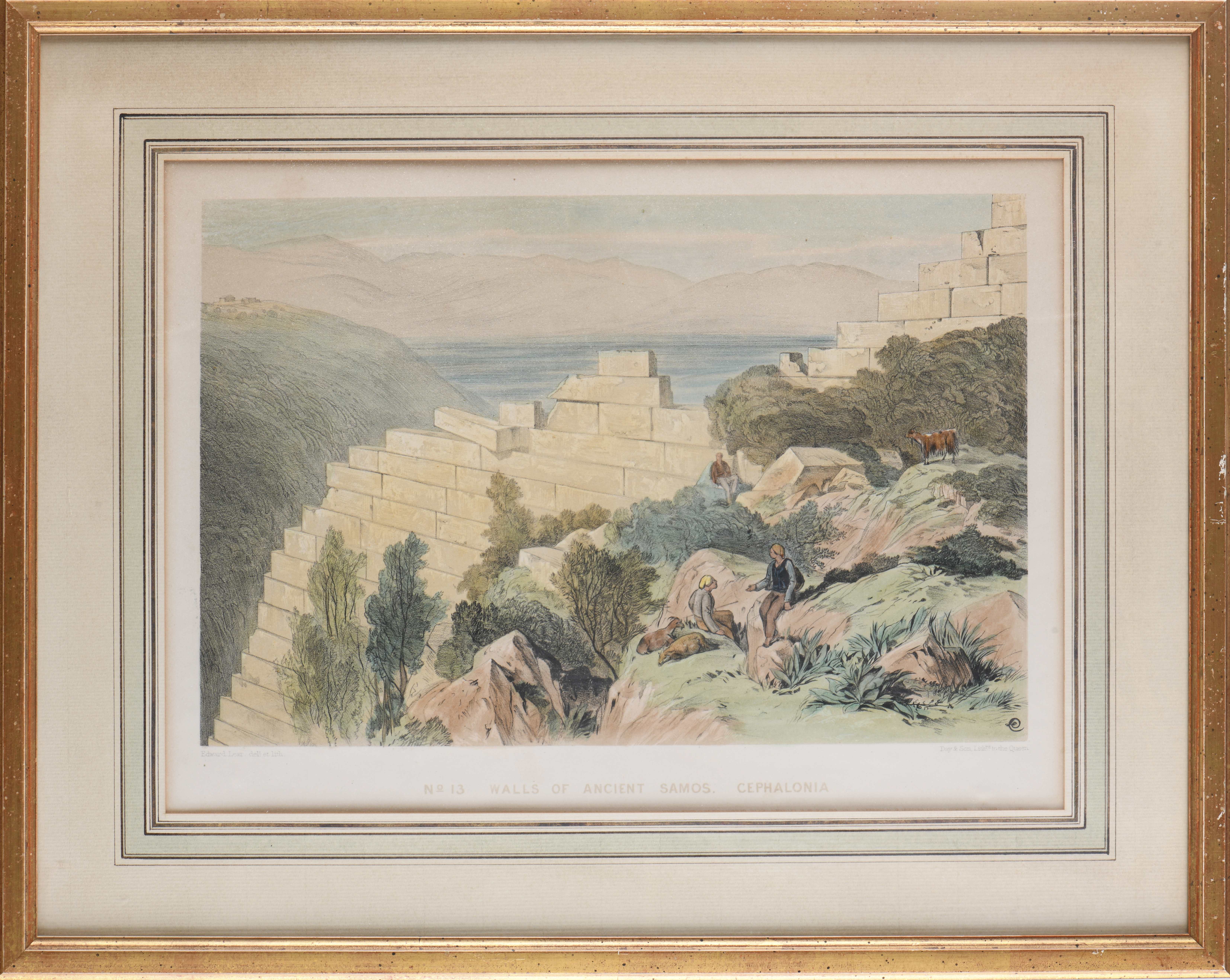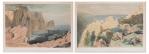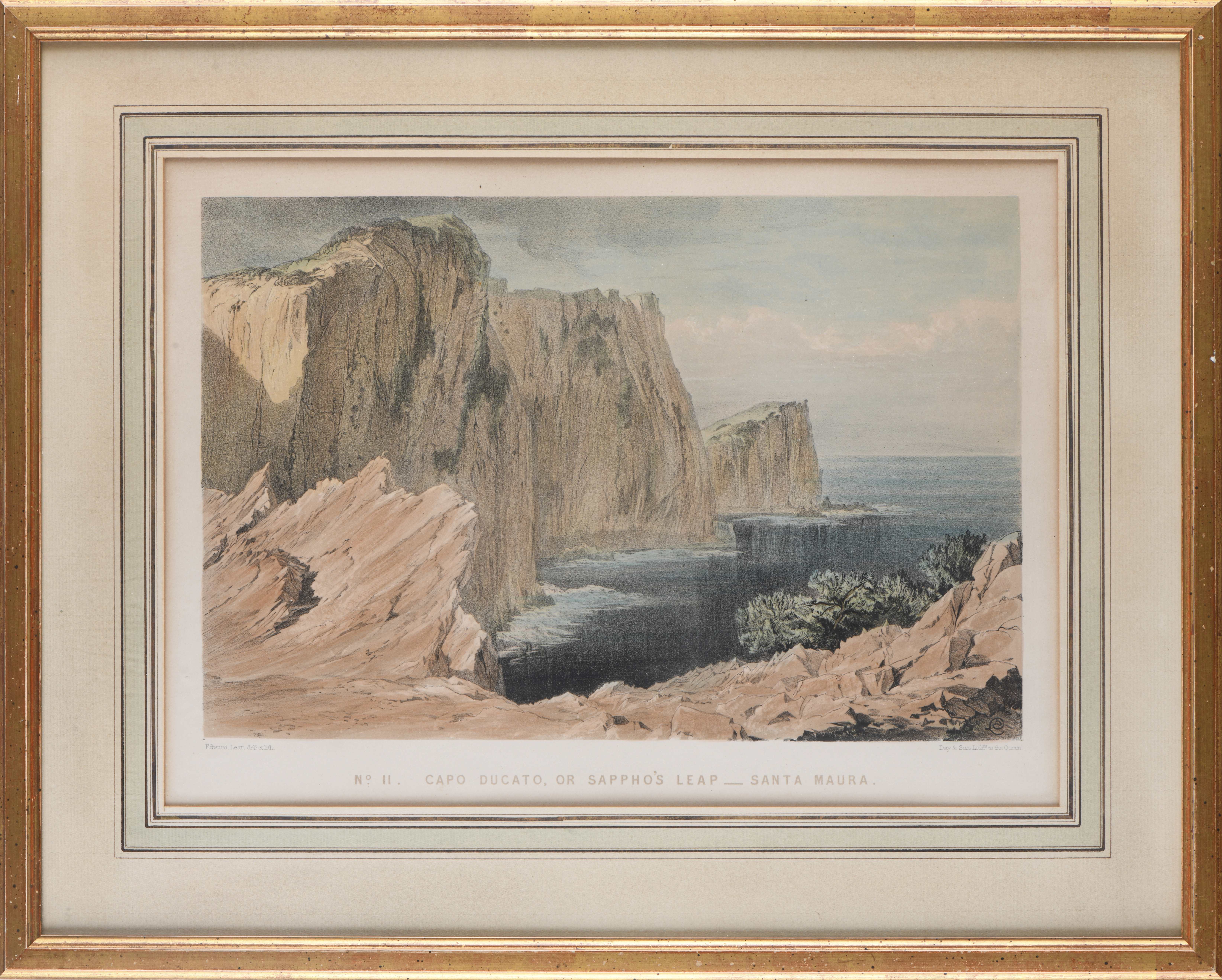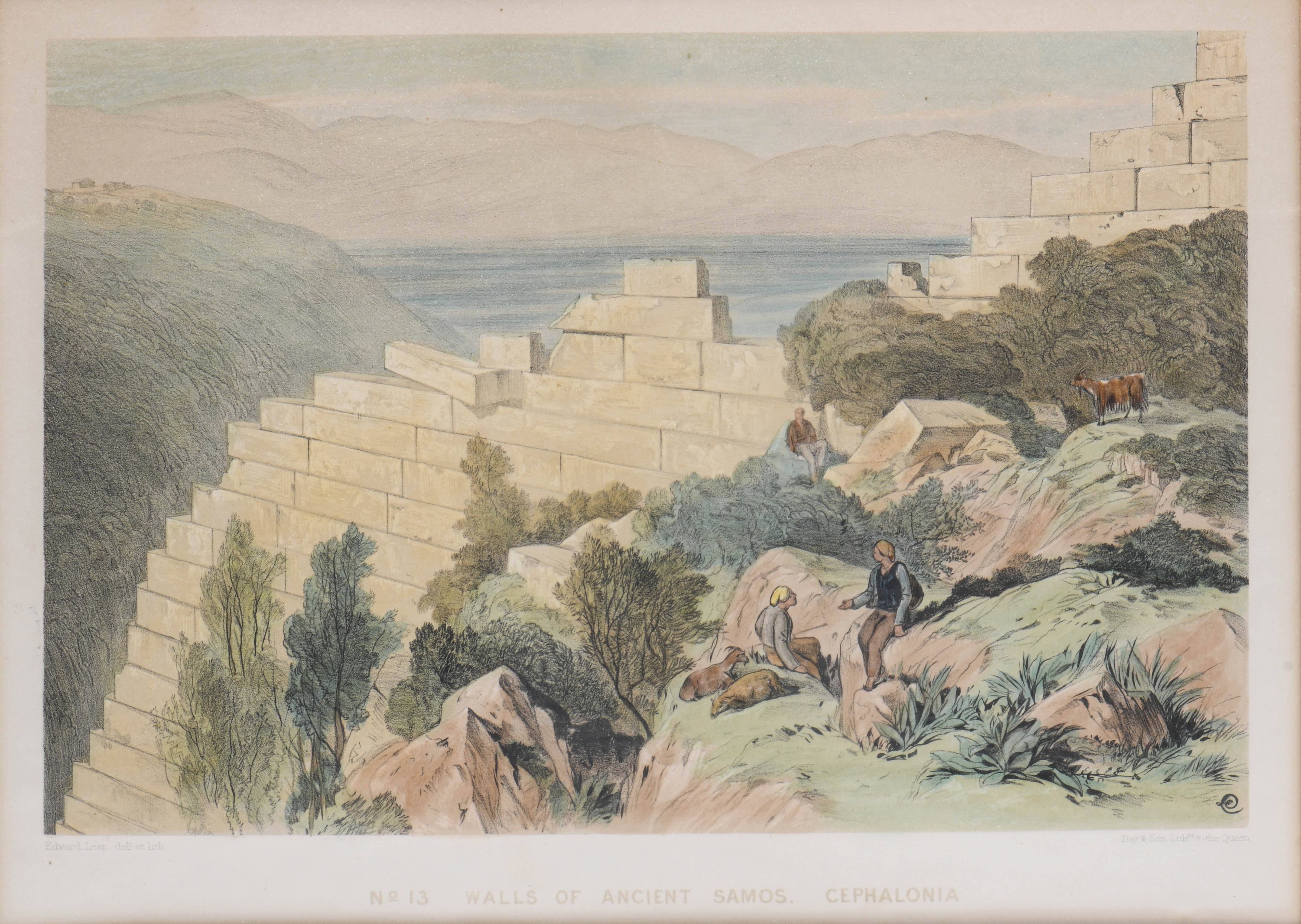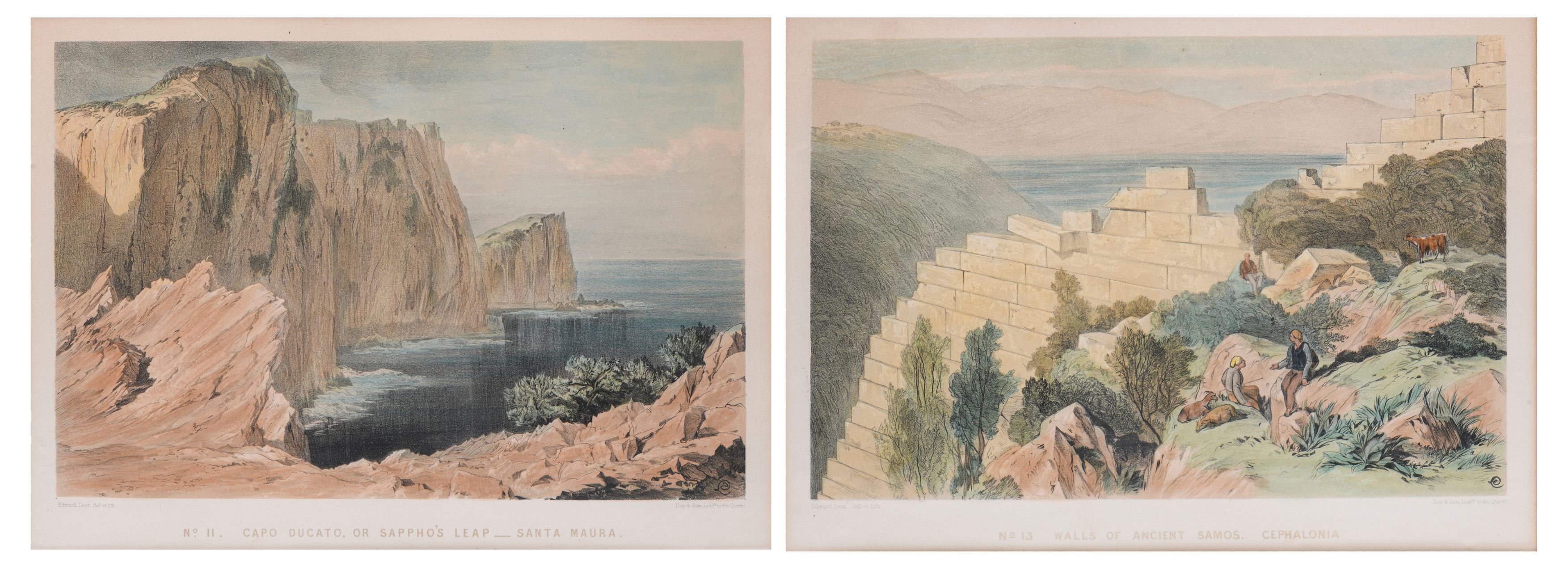 Edward LEAR (1812 - 1888), "No 11. Capo Ducato , or Sappho's Leap - Santa Maura" et " No. 13. Walls of Ancient Samos. Cephalonia", litographies couleur rehaussées à l'aquarelle sur papier, imprimées par Day & Son, Lithographers to the Queen, monogrammé en bas à droite dans la plaque.