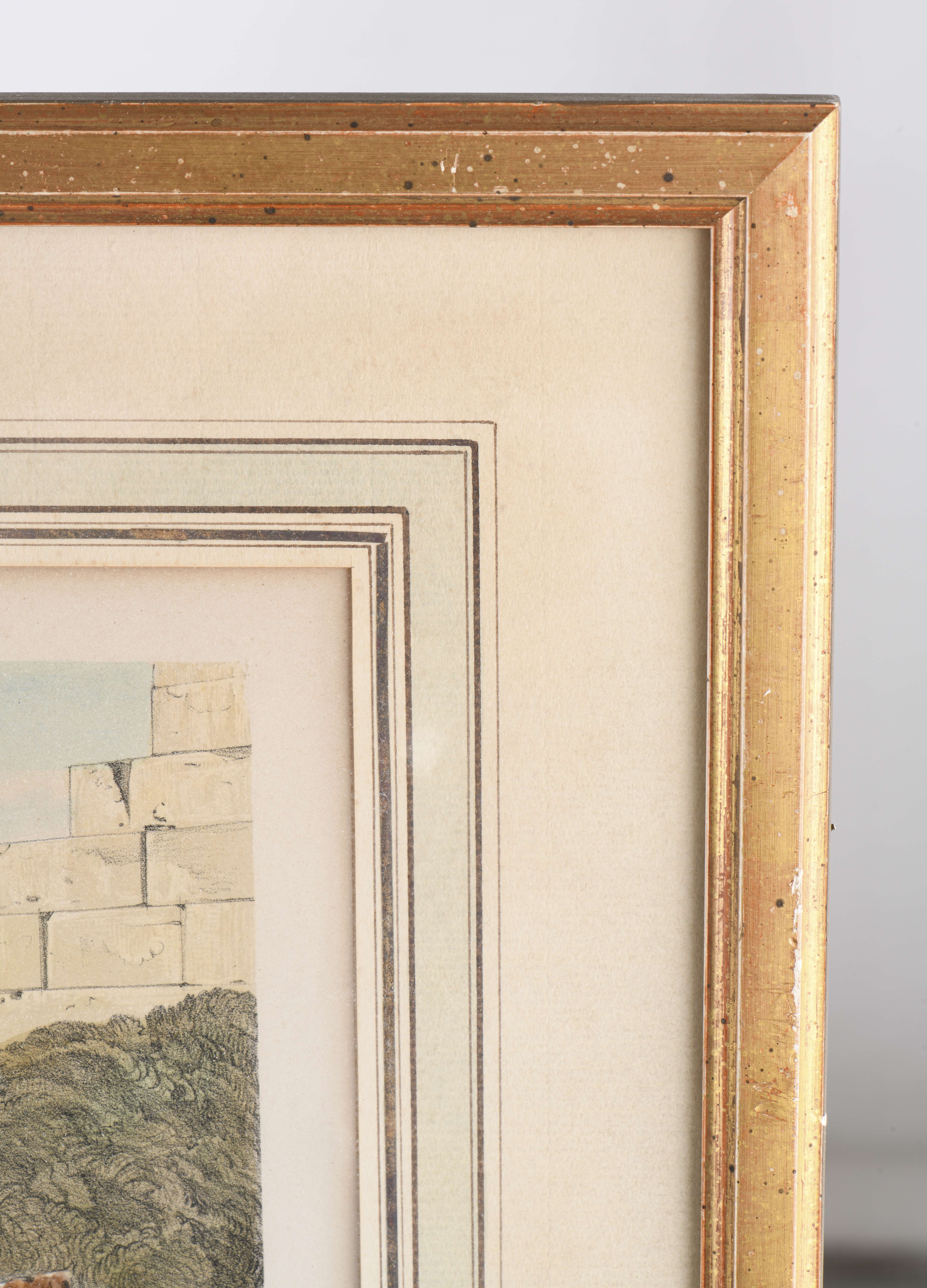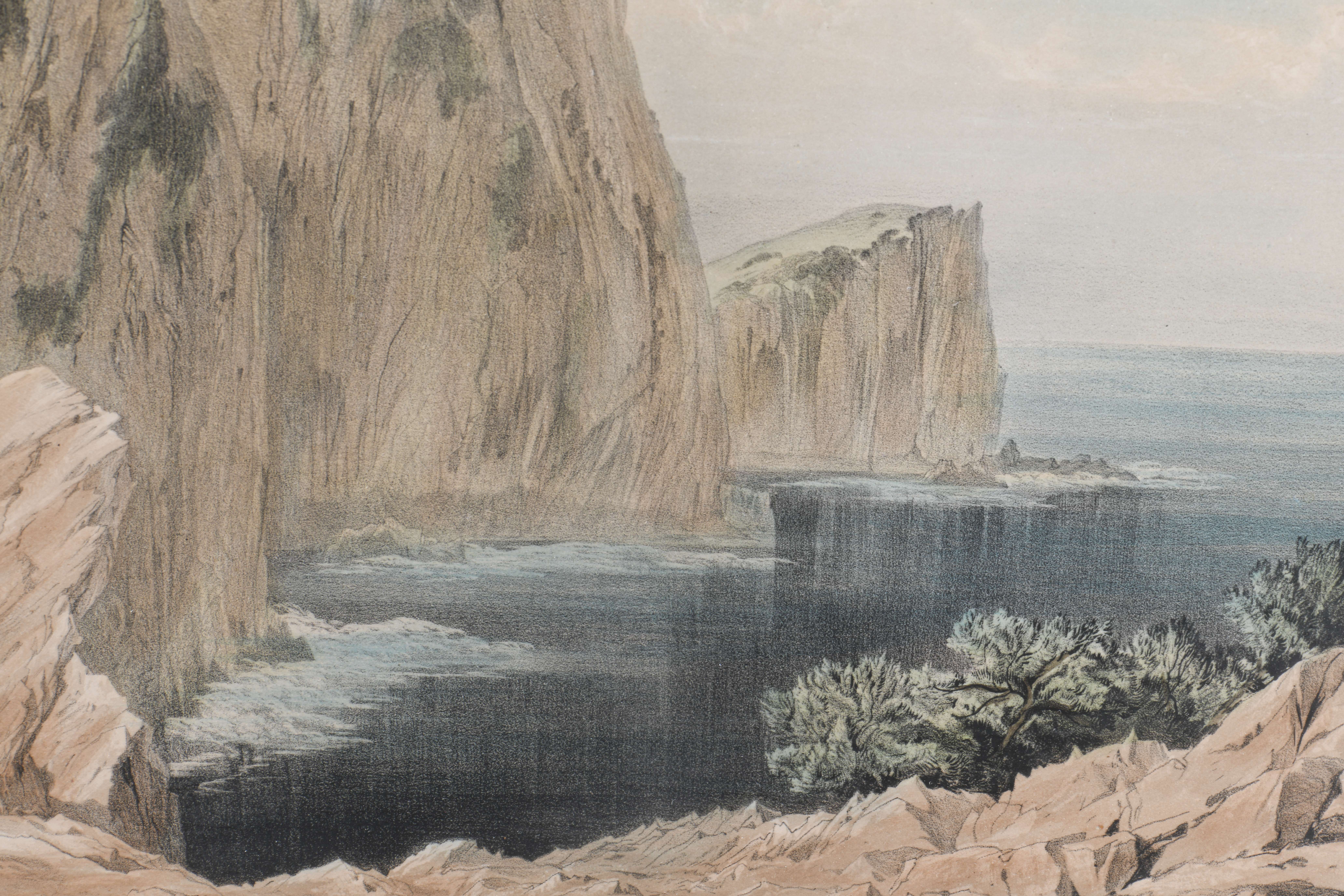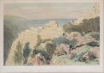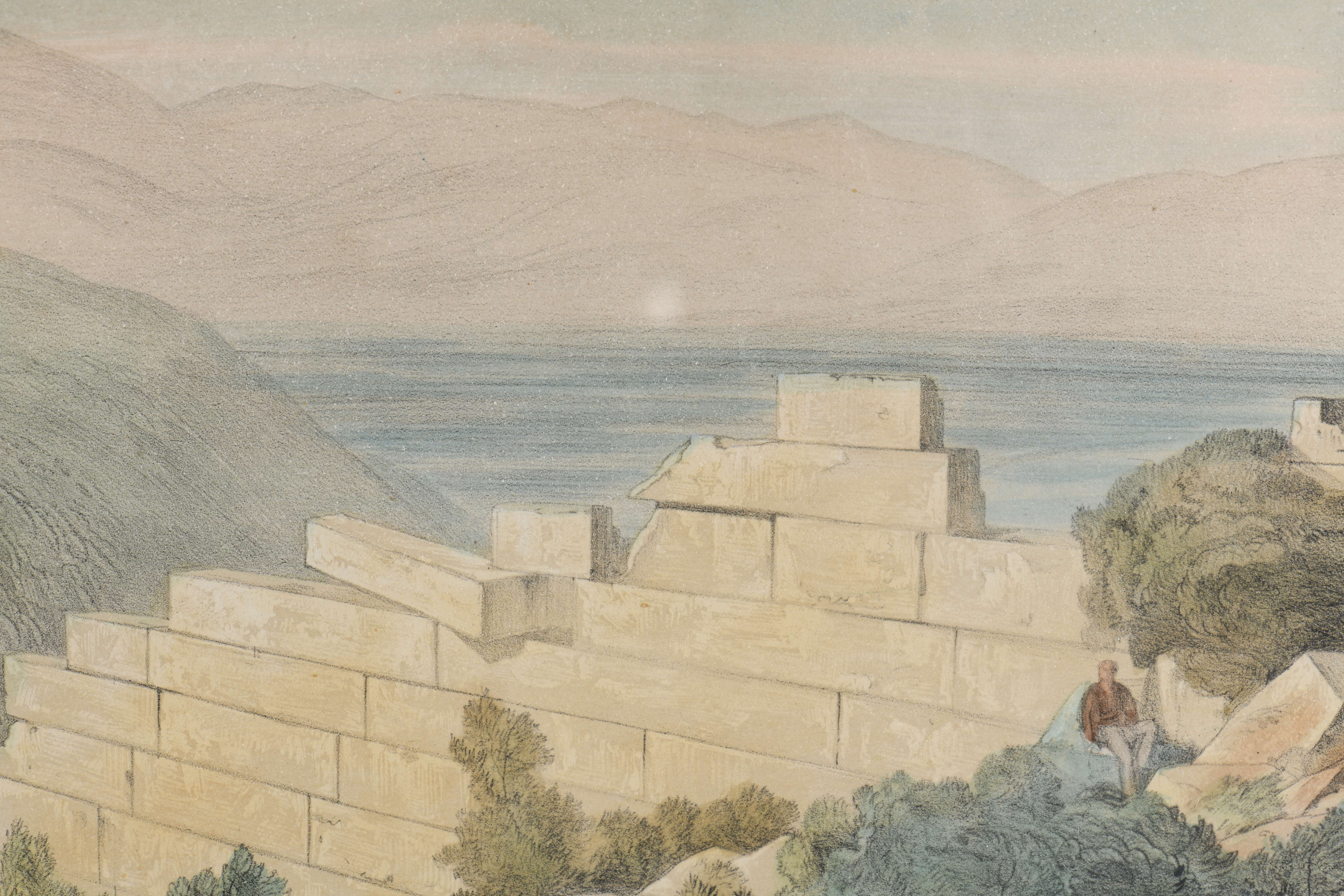 Edward LEAR (1812 - 1888), "No 11. Capo Ducato , or Sappho's Leap - Santa Maura" et " No. 13. Walls of Ancient Samos. Cephalonia", litographies couleur rehaussées à l'aquarelle sur papier, imprimées par Day & Son, Lithographers to the Queen, monogrammé en bas à droite dans la plaque.