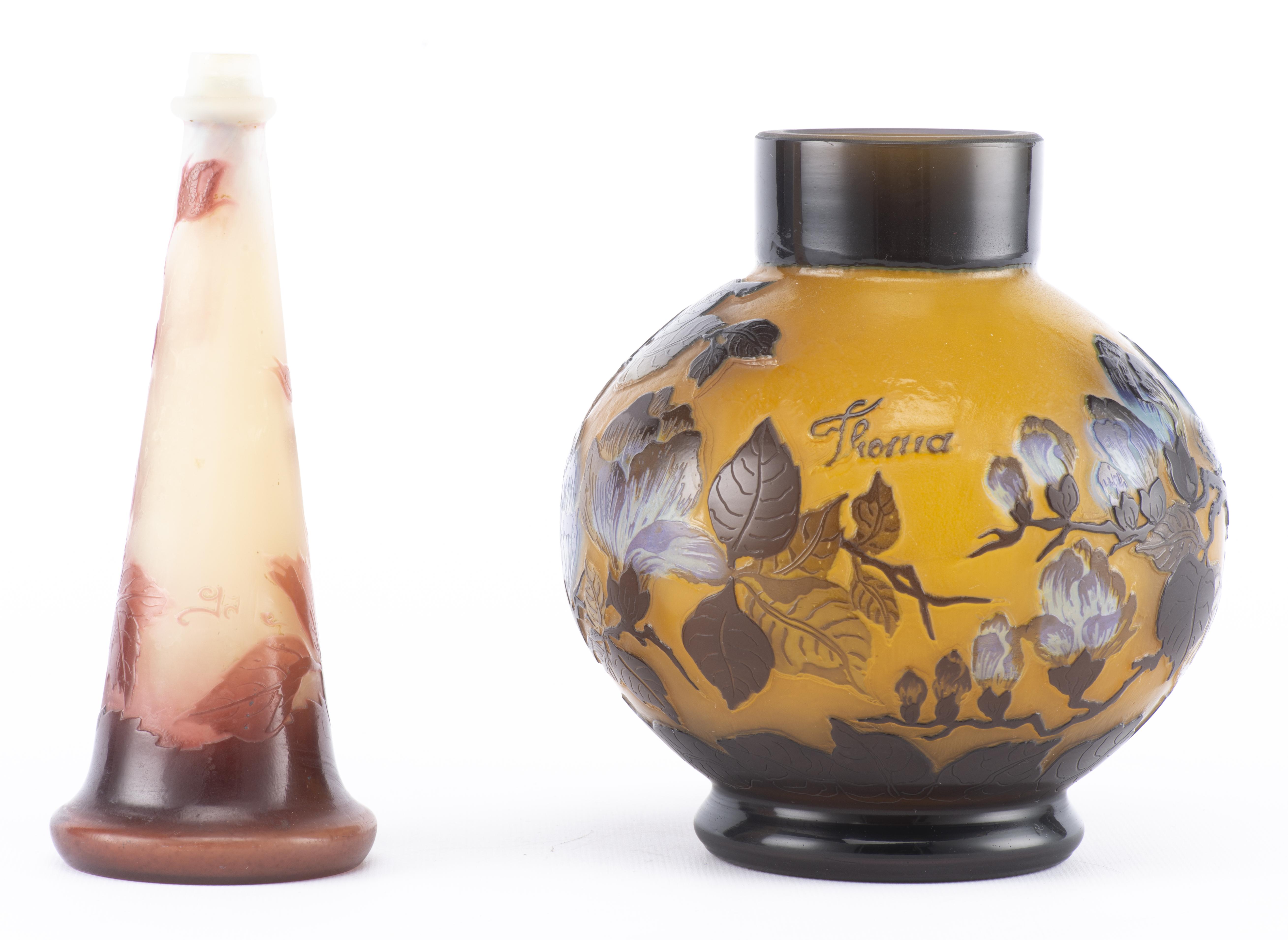 Emile GALLE (1846 - 1904), flacon de vaporisateur à parfum en verre multicouche et vase boule