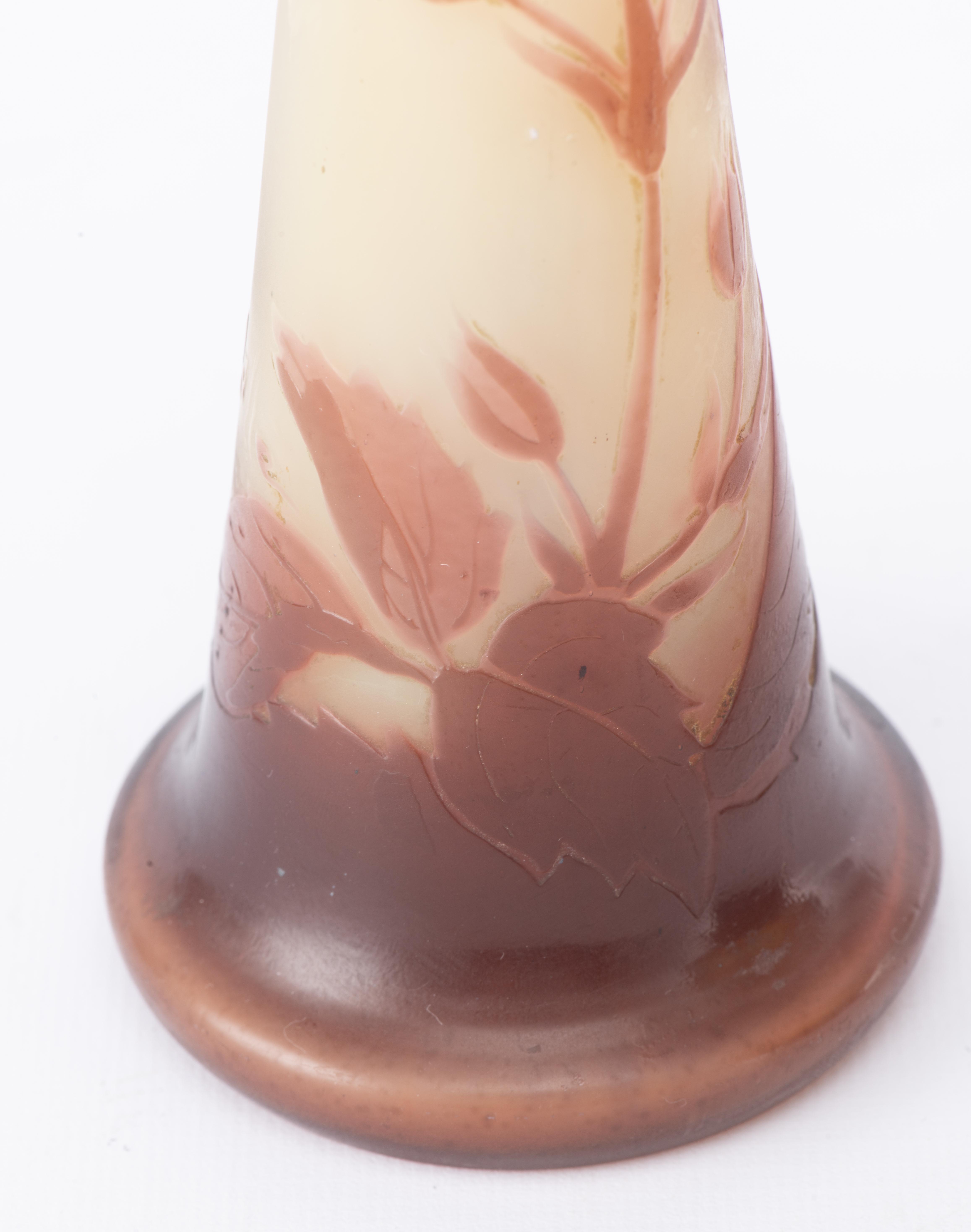 Emile GALLE (1846 - 1904), flacon de vaporisateur à parfum en verre multicouche à tronc conique et base aplatie, décor gravé à l'acide de feuilles et fleurs en rouge sur fond clair.