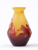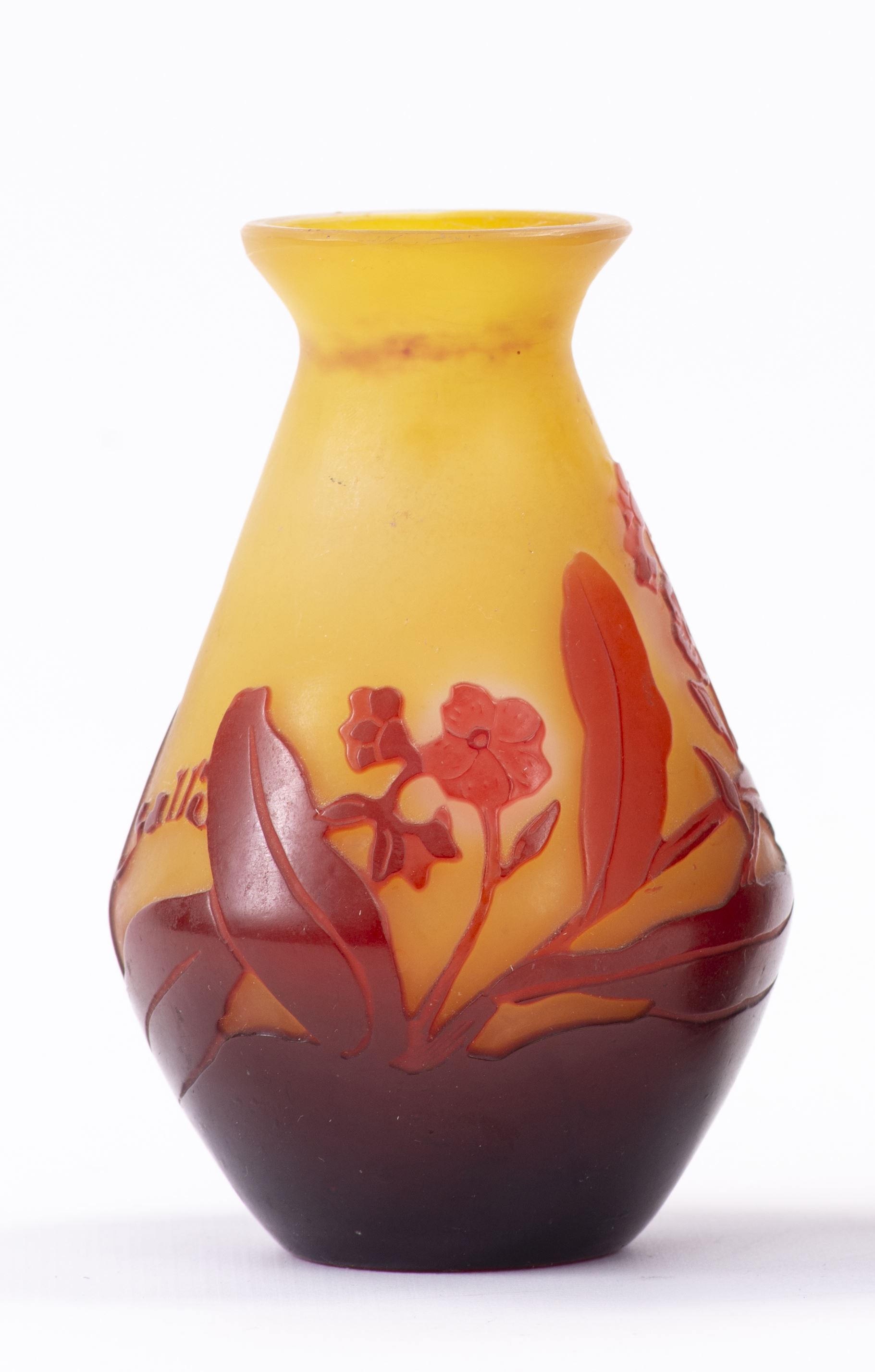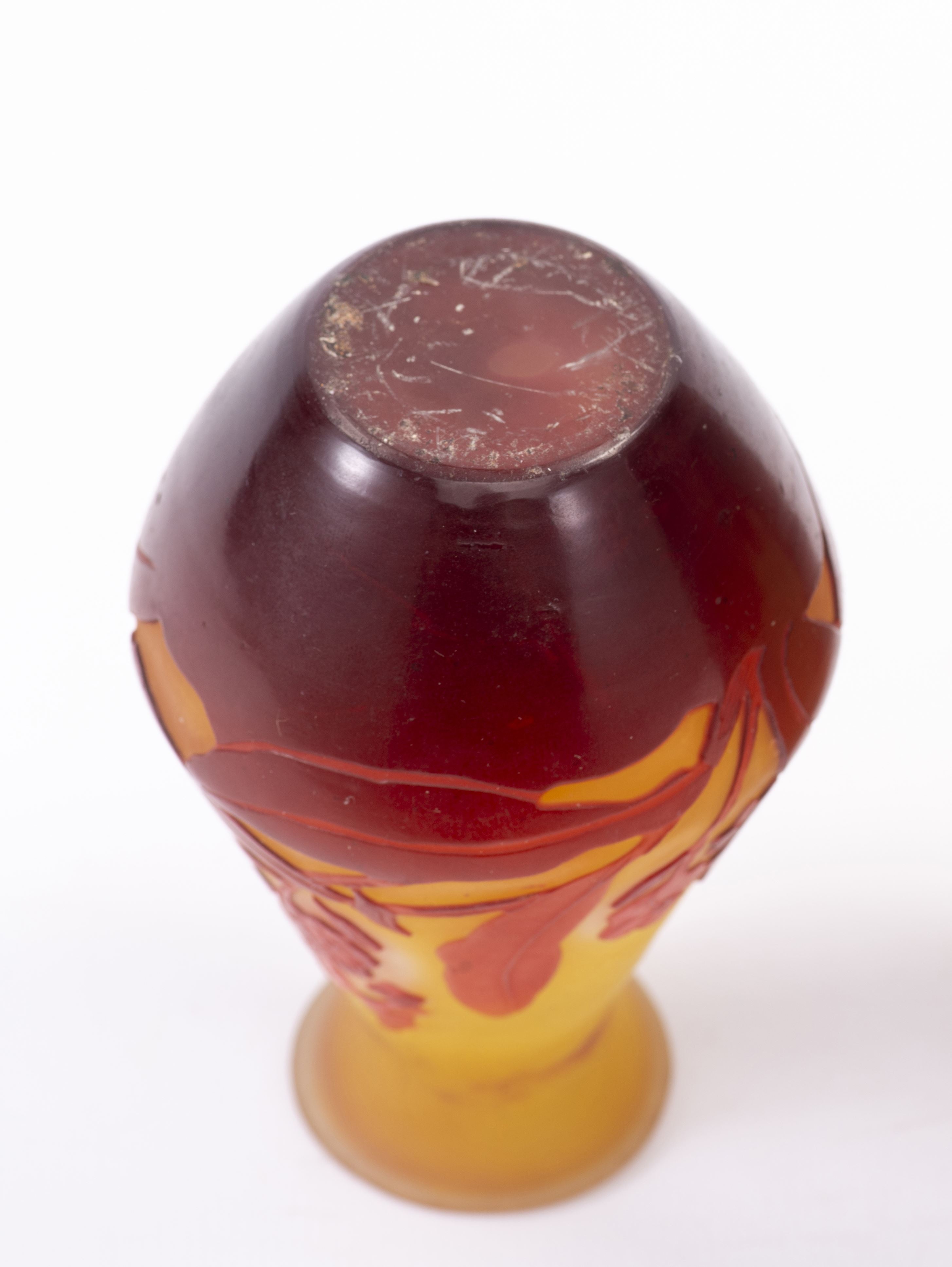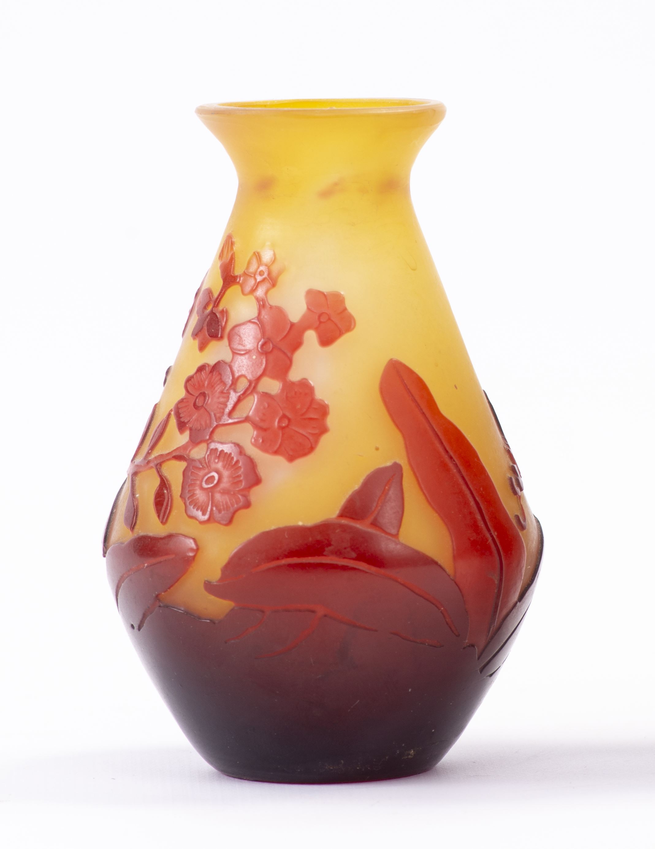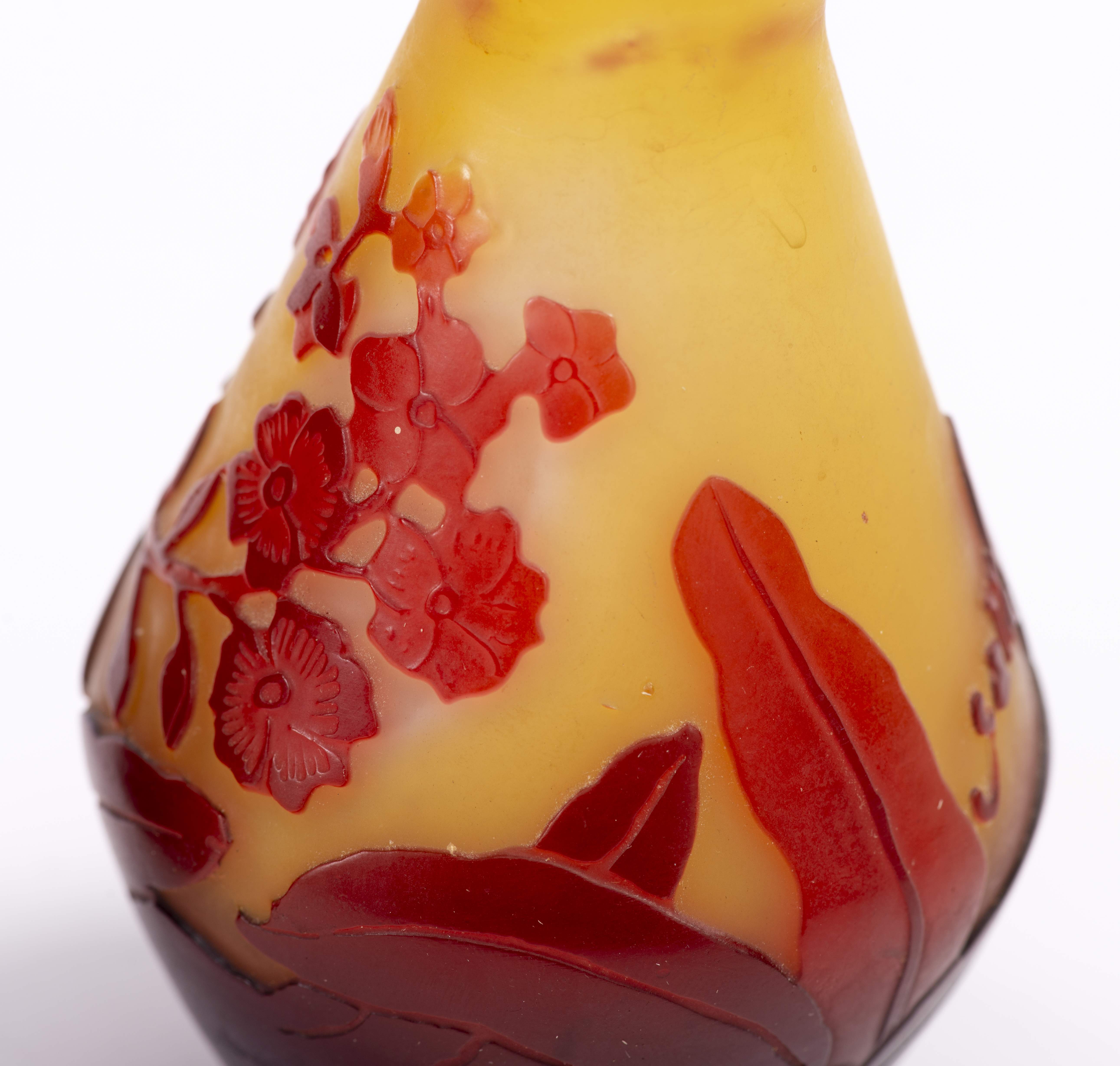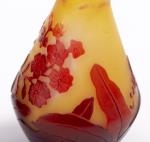 Emile GALLE (1846-1904), petit vase en verre multicouche à panse évasée, col rentrant et lèvre évasée, décor gravé à l'acide de feuilles et fleurs en rouge sur fond jaune.