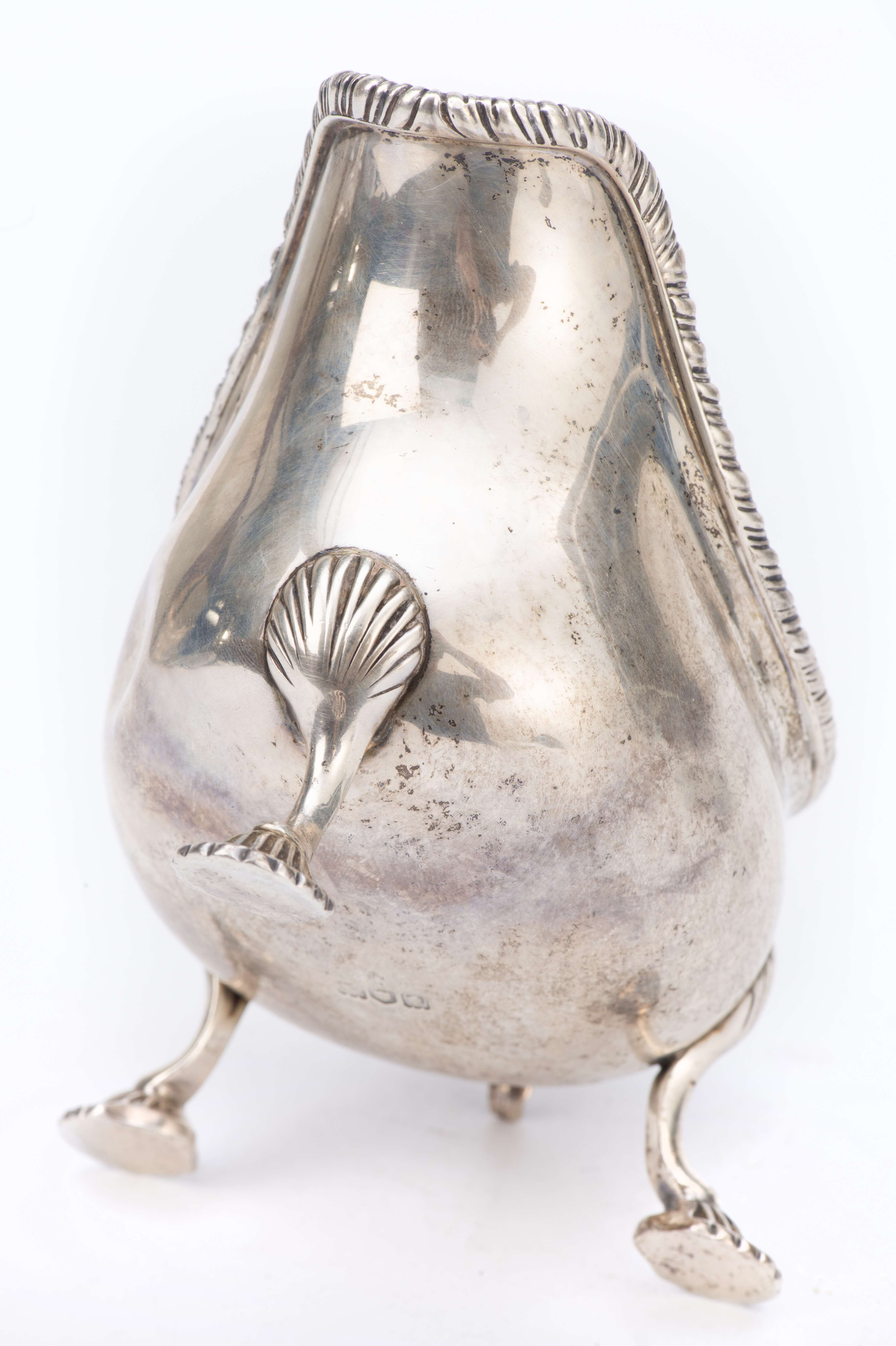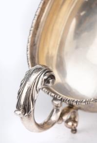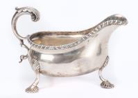 Saucière casque en argent sterling anglais, la prise figurant une feuille d'acanthe, piétement tripode à applique en palmette