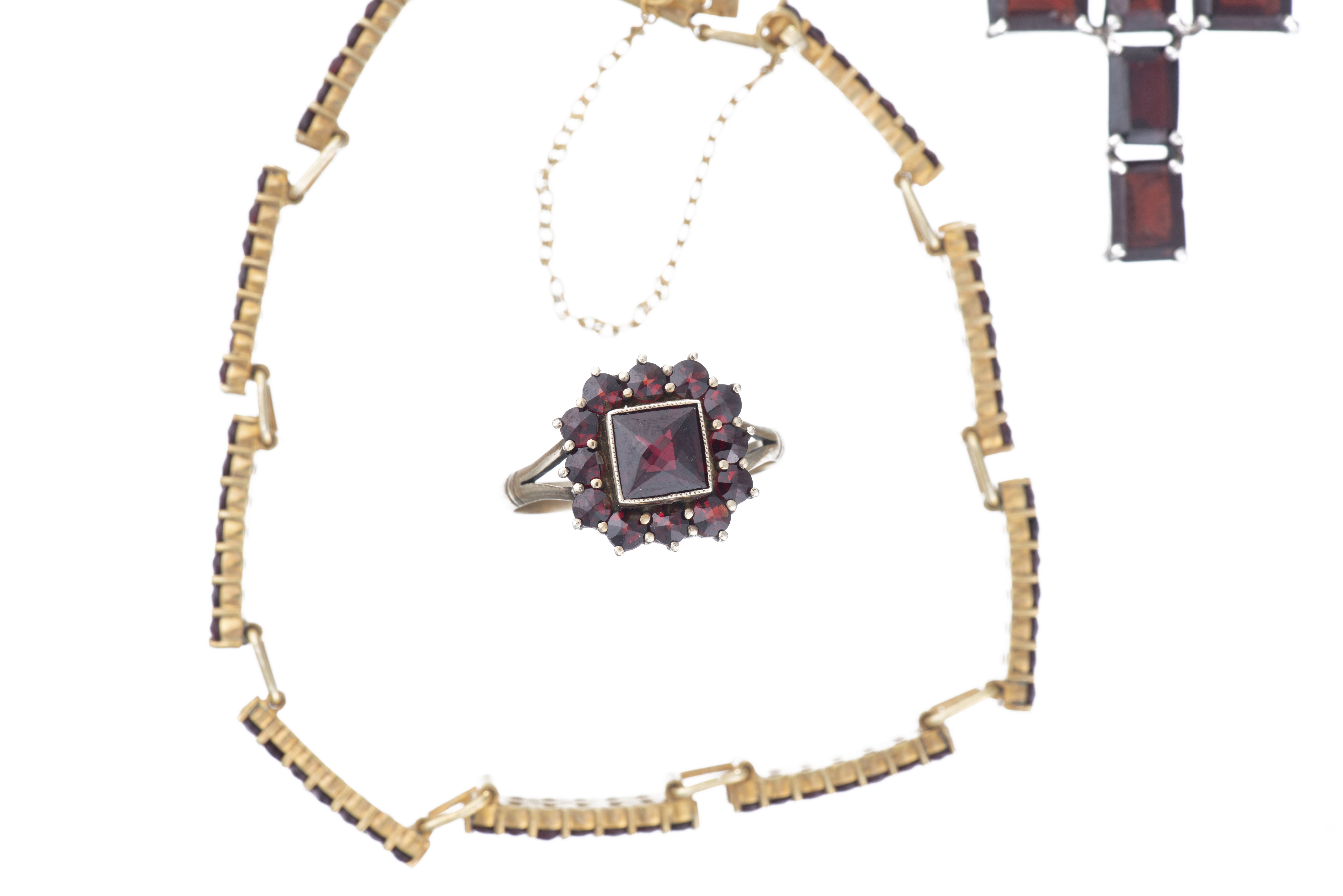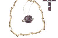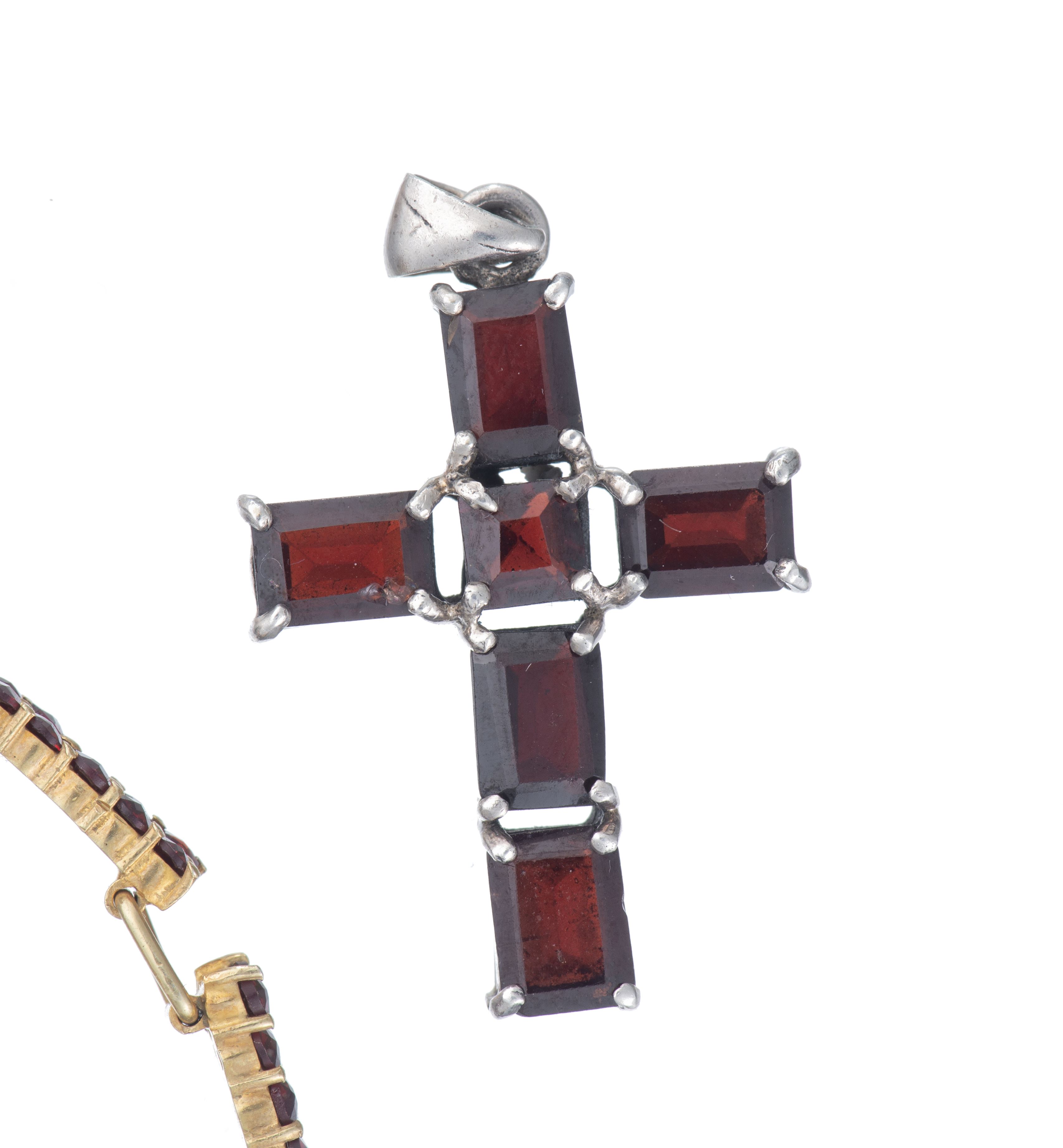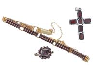 Ensemble comprenant une bague, un bracelet et un pendentif en forme de croix et argent doré .800 et .925 en grenat de Bohême. tailles roses.