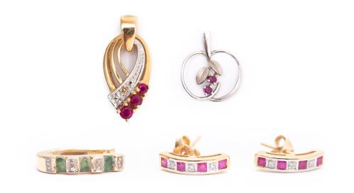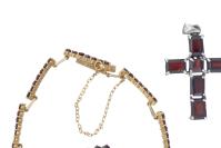 Ensemble d'une bague, un bracelet et un pendentif à la forme de croix en argent doré et grenat