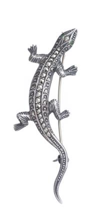 - 1 broche en argent .800 en forme de lézard serti d'hématites, L. 6.3 cm, poids total : 7.18 g