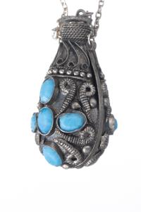 - 1 petite bouteille en métal ornée de verres taillés imitant la turquoise, H. 6x3.2x3.2 cm