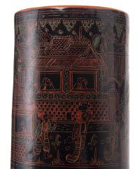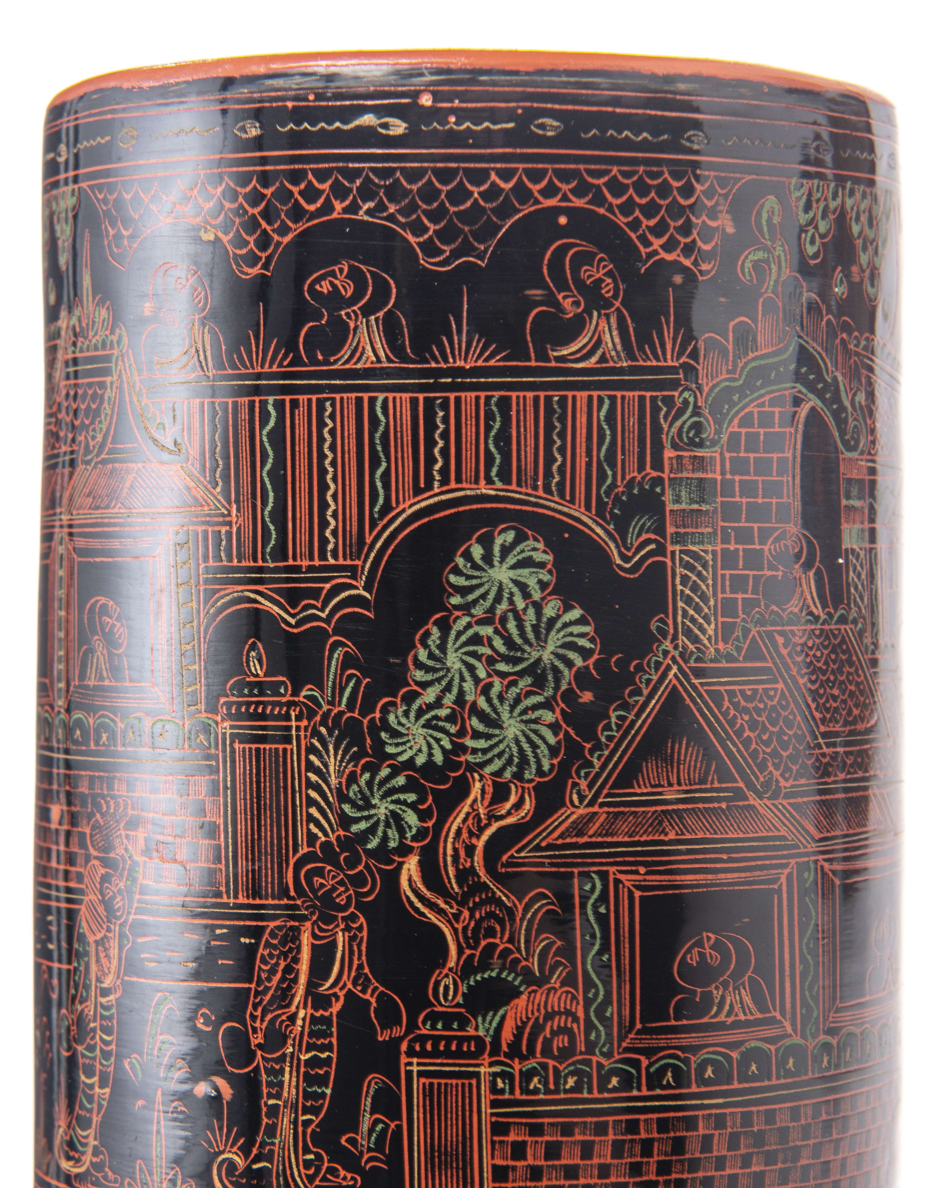 Boîte cylindrique en laque noire de Birmanie à décor en rouge et vert d'une ville et de personnages.