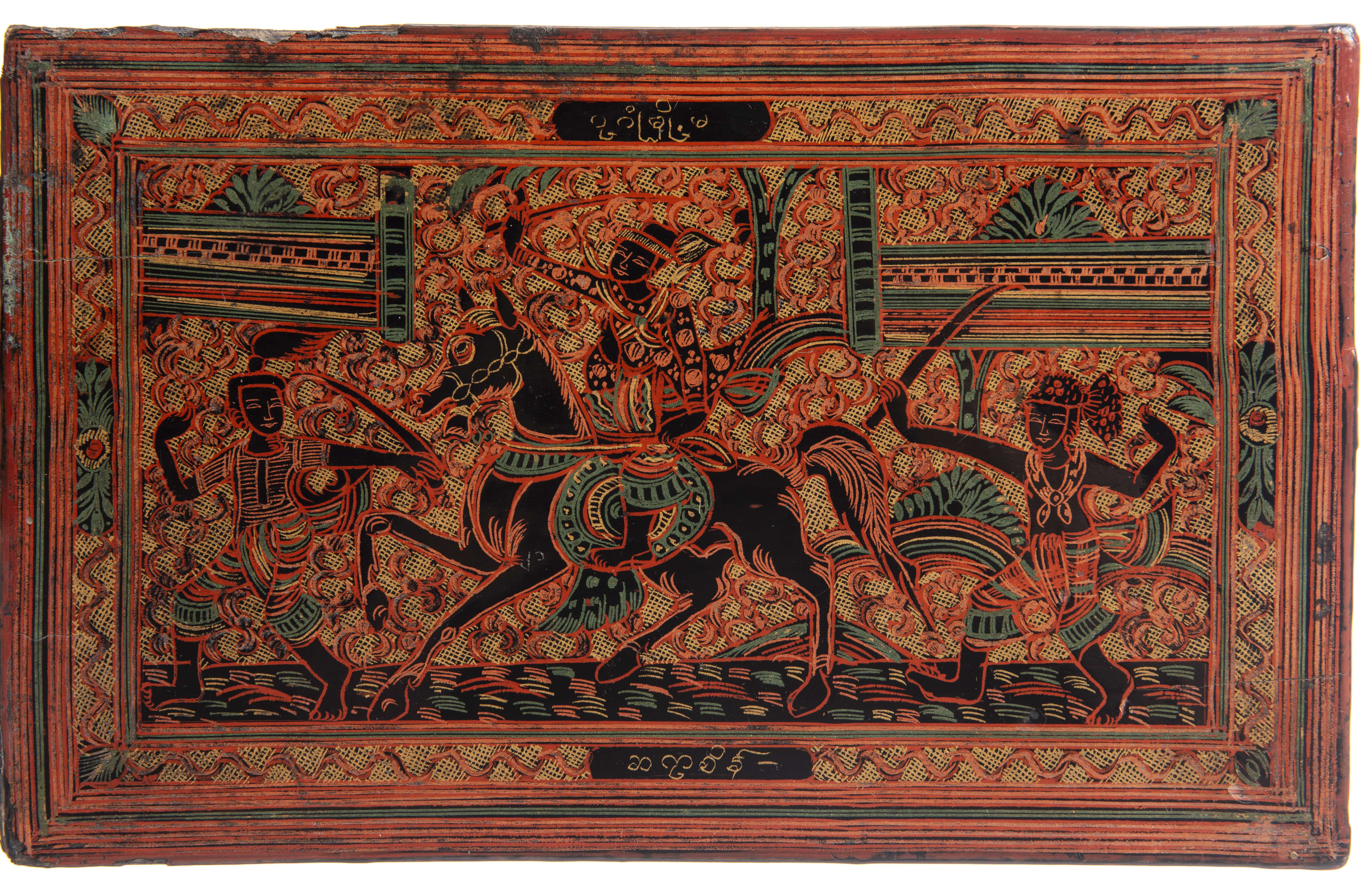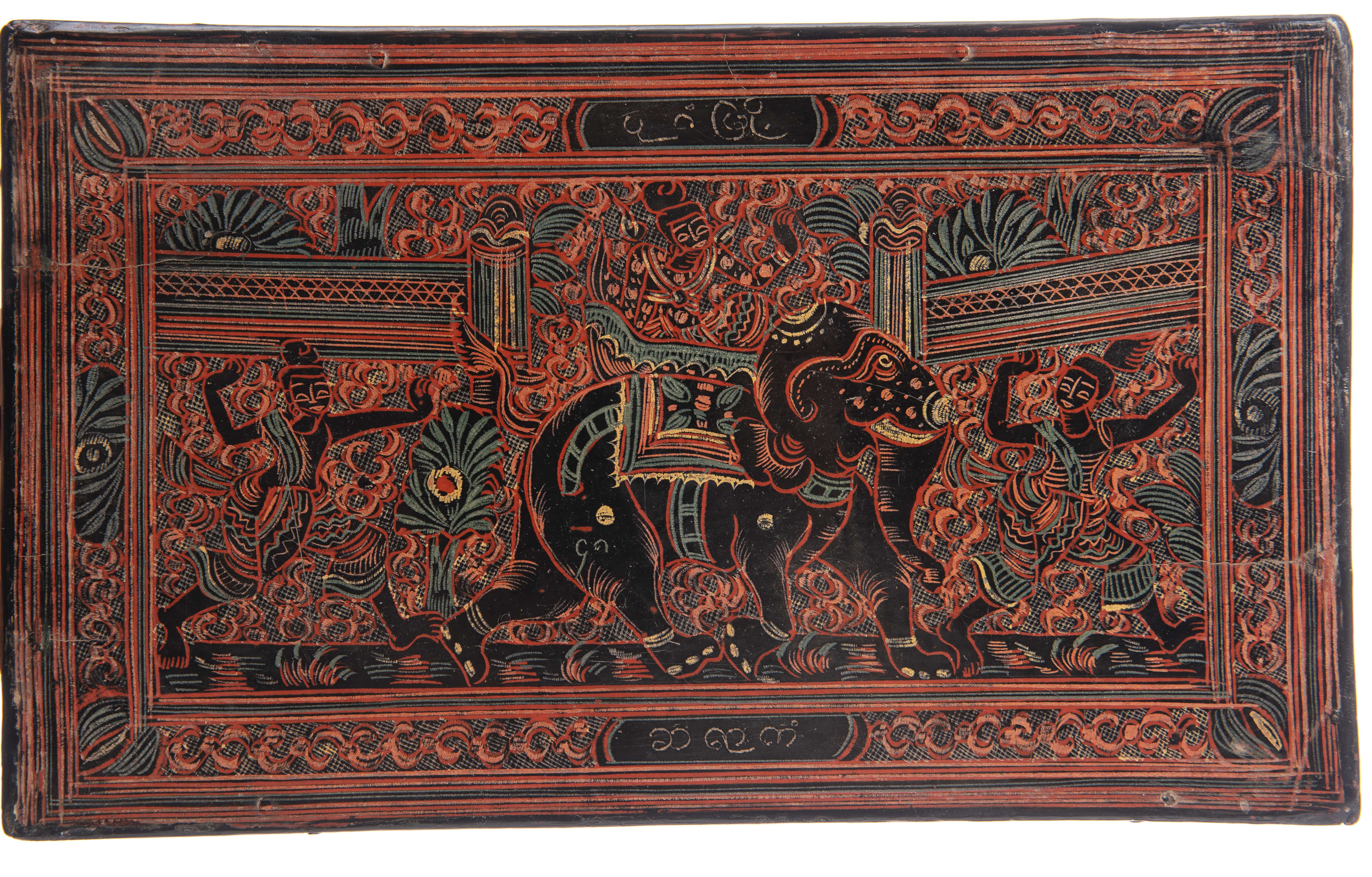 Deux boîtes rectangulaires en laque noire et rouge de Birmanie, à décor d'un cheval et 3 personnages pour l'une et d'un éléphant avec trois personnages pour l'autre.