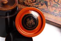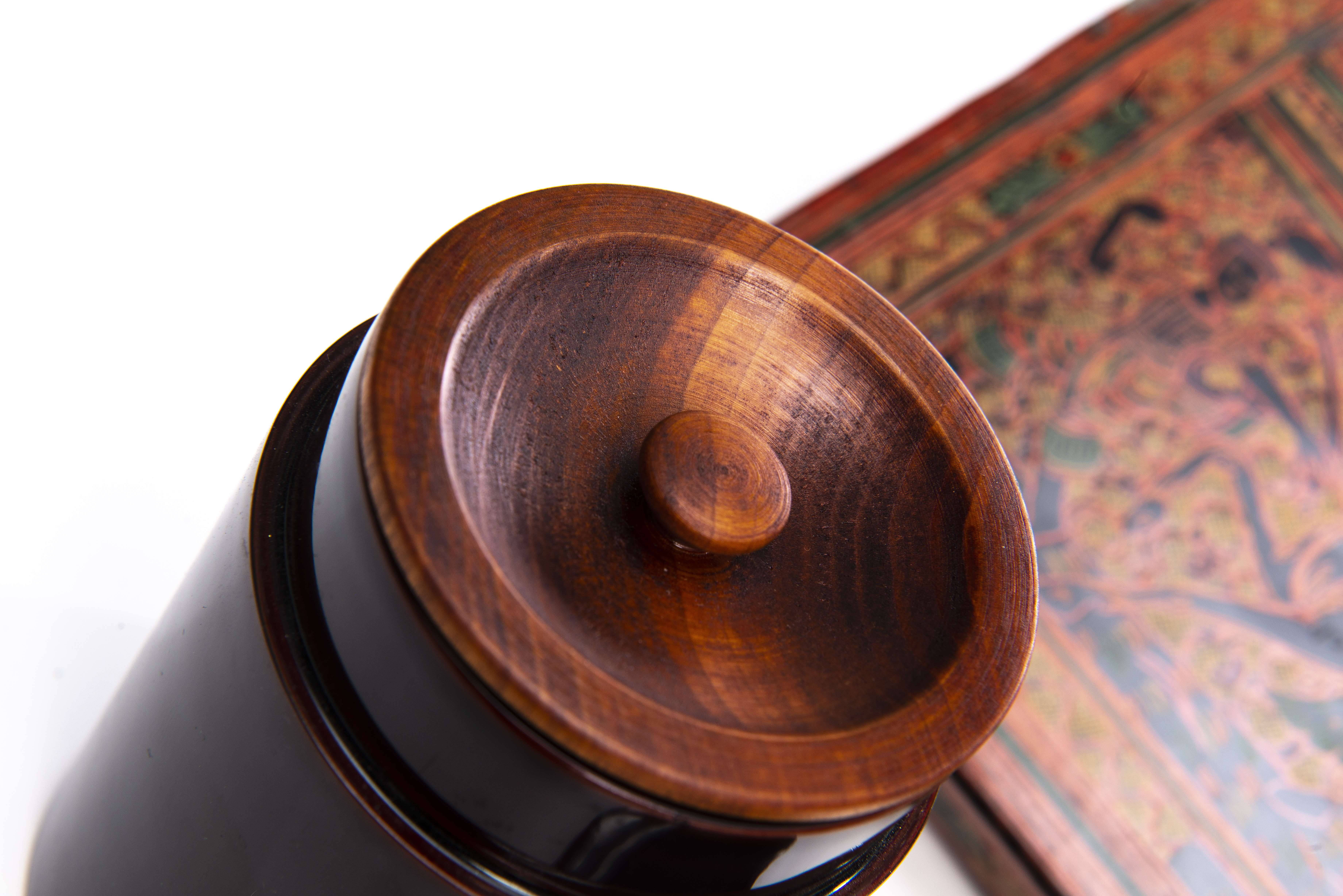 Boîte cylindrique en laque noire rouge de Birmanie, sans décor, avec à l'intérieur un bouchon en bois