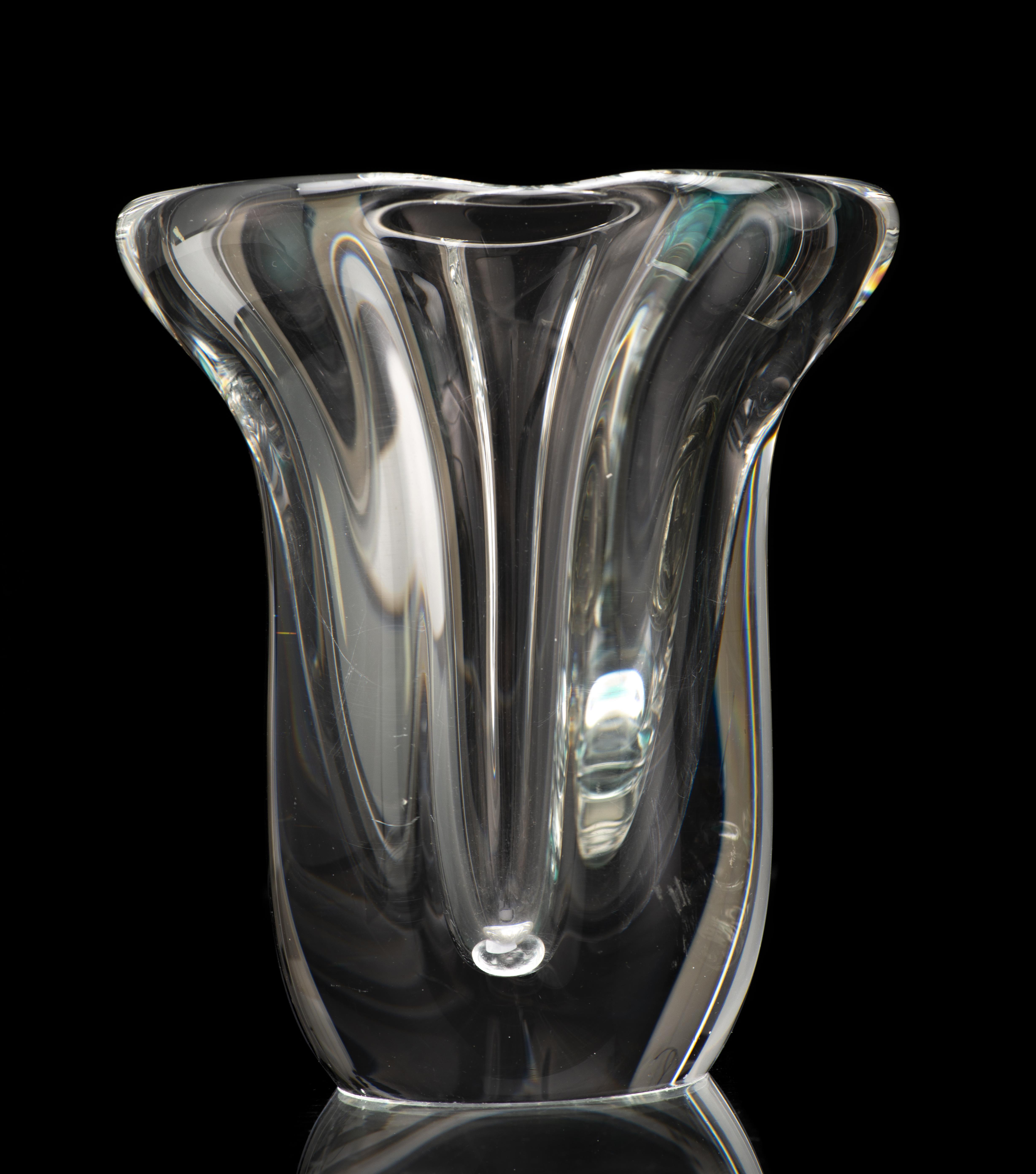 - 1 vase mouvementé à 2 lobes en cristal transparent signé au centre Sèvres France. H. 14.3 cm