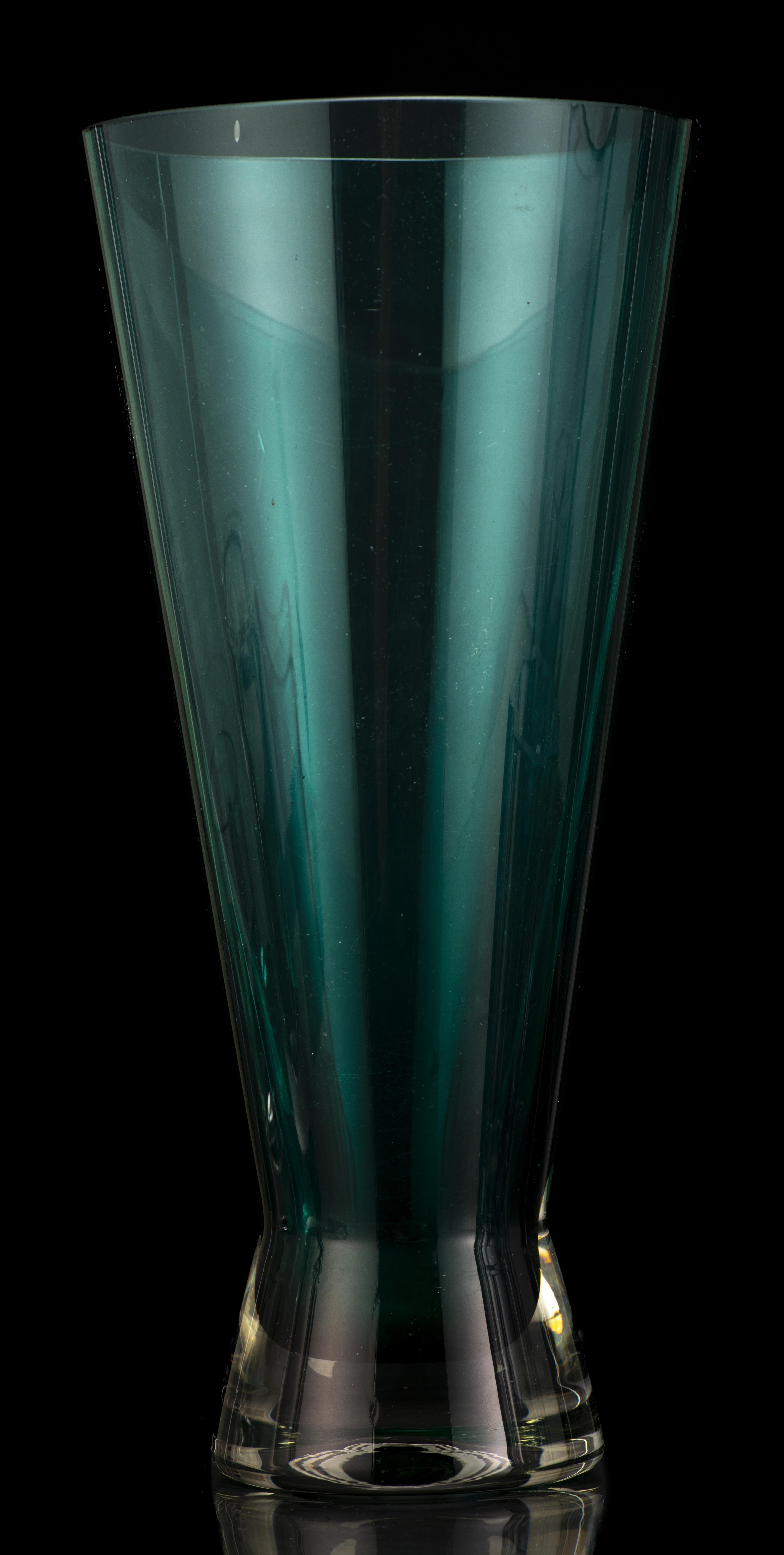 - 1 vase en cristal bicolore vert et transparent gravé sous la base Riihimäen Lasi oy Finland. H. 28.1 D. 13 cm
