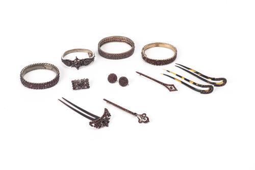 Ensemble de bijoux composé d’une paire de boutons de manchette, deux pinces à cravate, un bouton de manchette et une pierre rose gravée