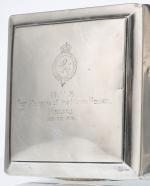 - petite boîte carrée avec blason de la Police du Kenya inscrit :"BVS From Members of the Kenya Police Kisumu, 22.12.29" avec intérieur en bois, en argent Sterling de Birmingham datant de 1939, 10 x 10 cm