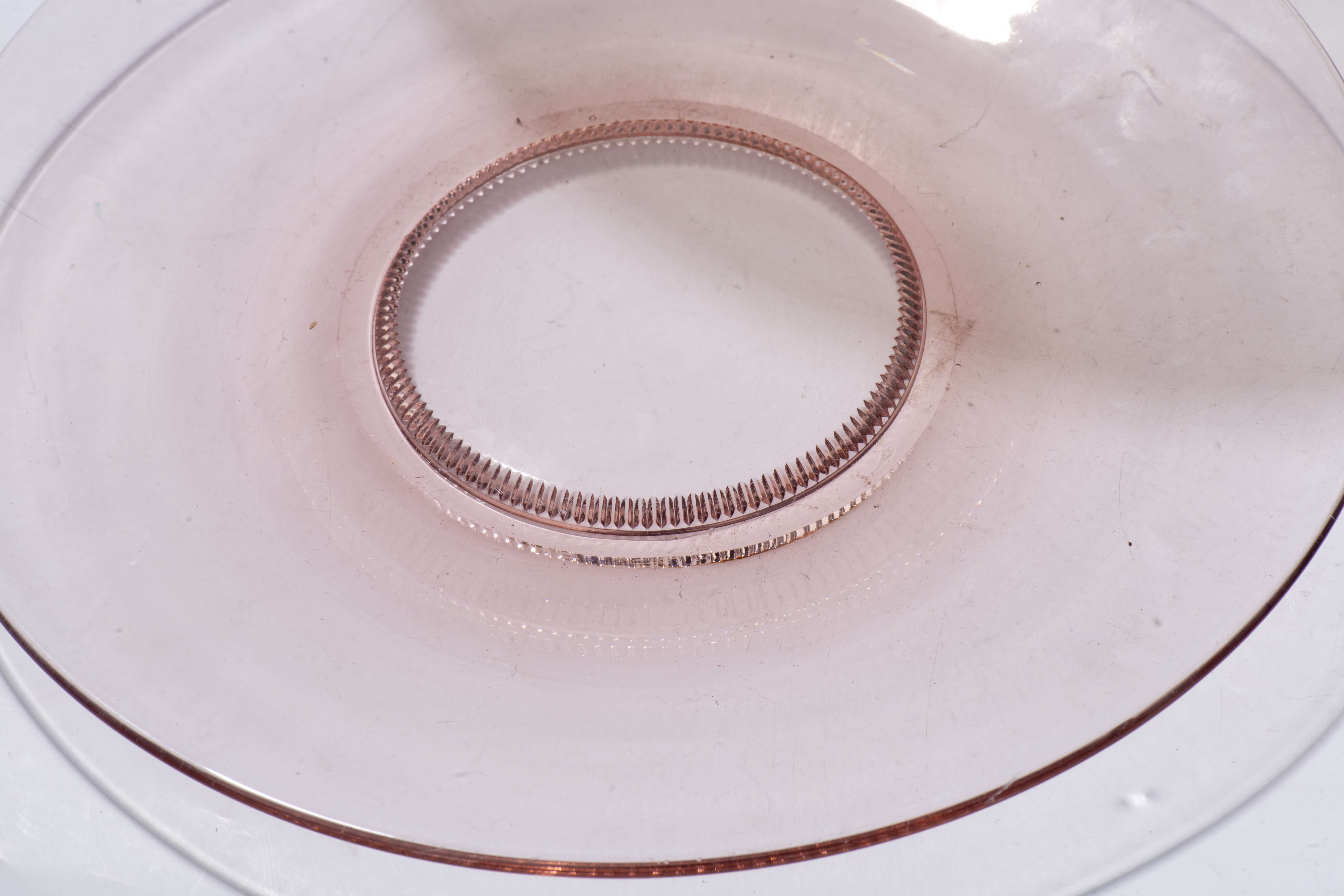 Un plat circulaire en verre rose D. 28.2 cm