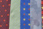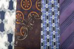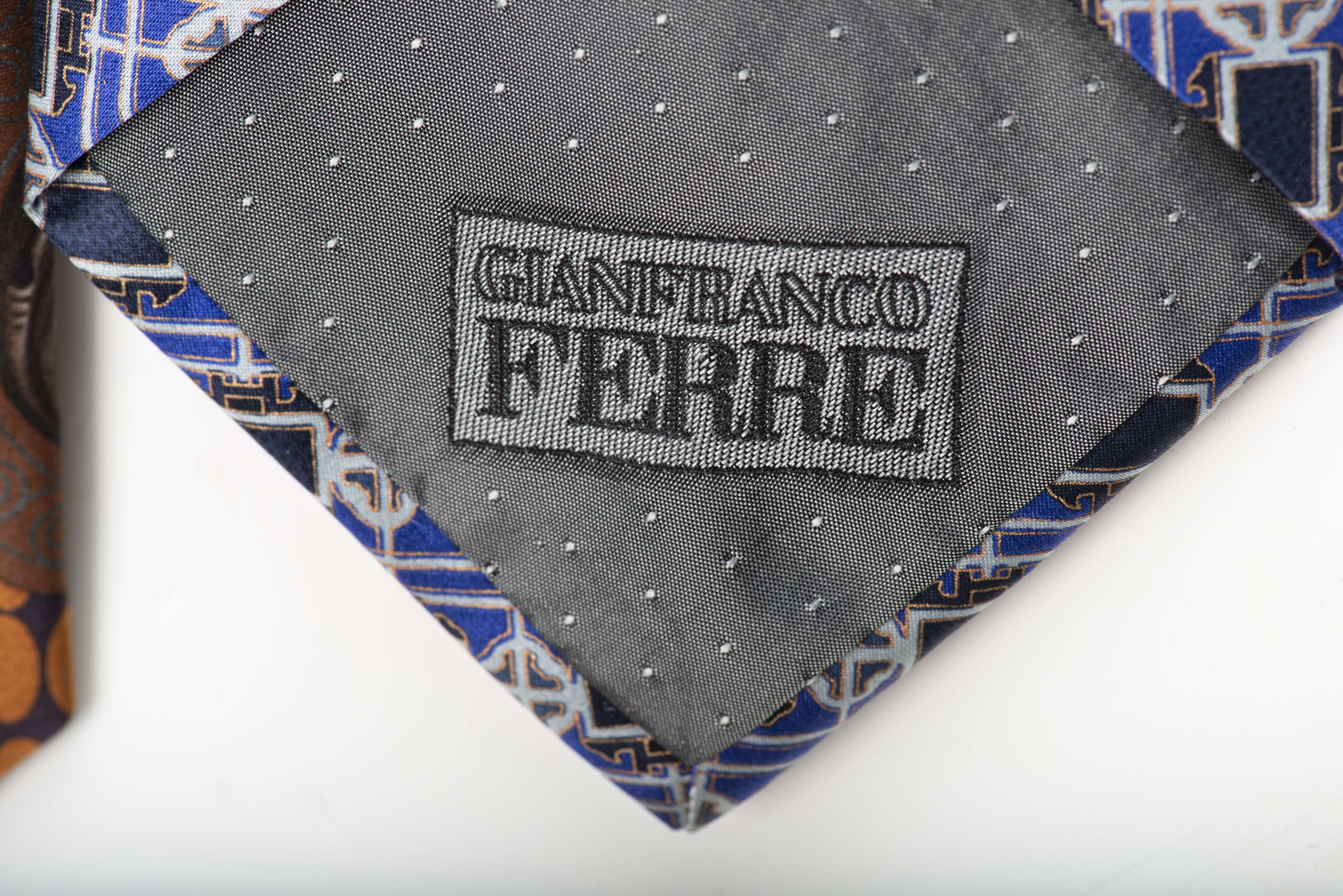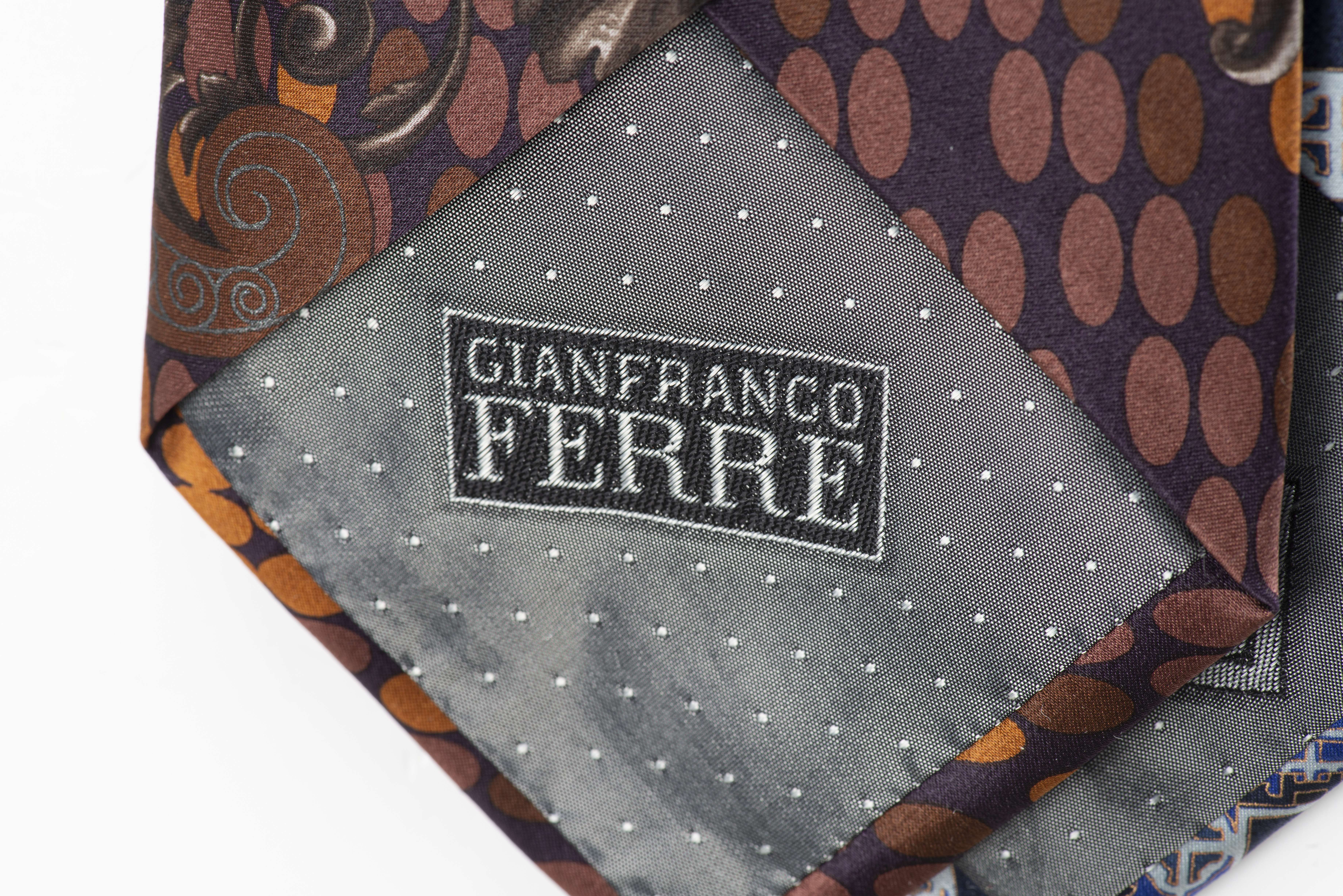 Ensemble de neuf cravates en soie signées VERSACE et FERRE dans les tons de bleu, violet, brun, rouge et vert.