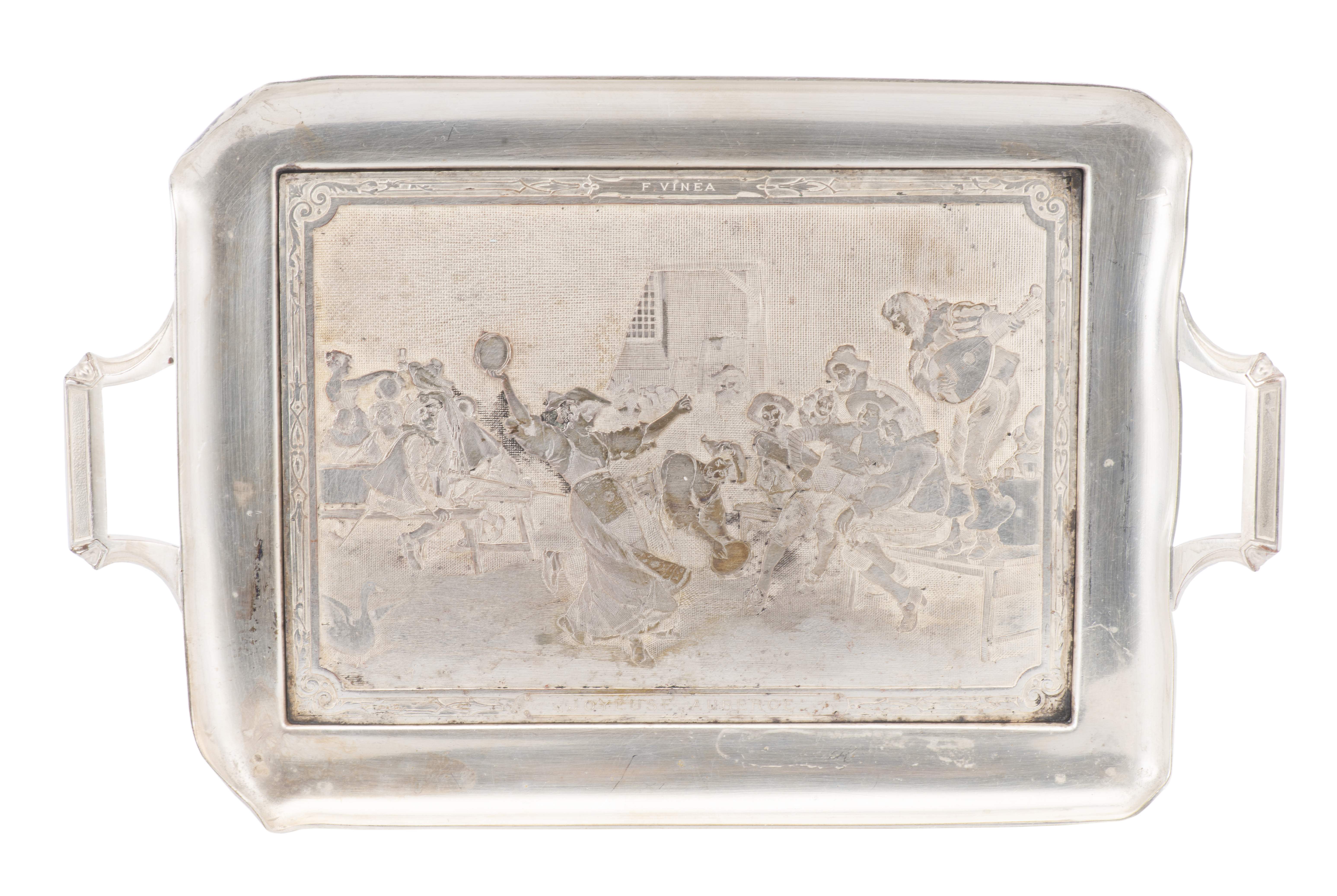 - Petit plateau à deux anses latérales à décor "Joyeuse auberge" par Francesco Vinea. L. 22x14 cm
