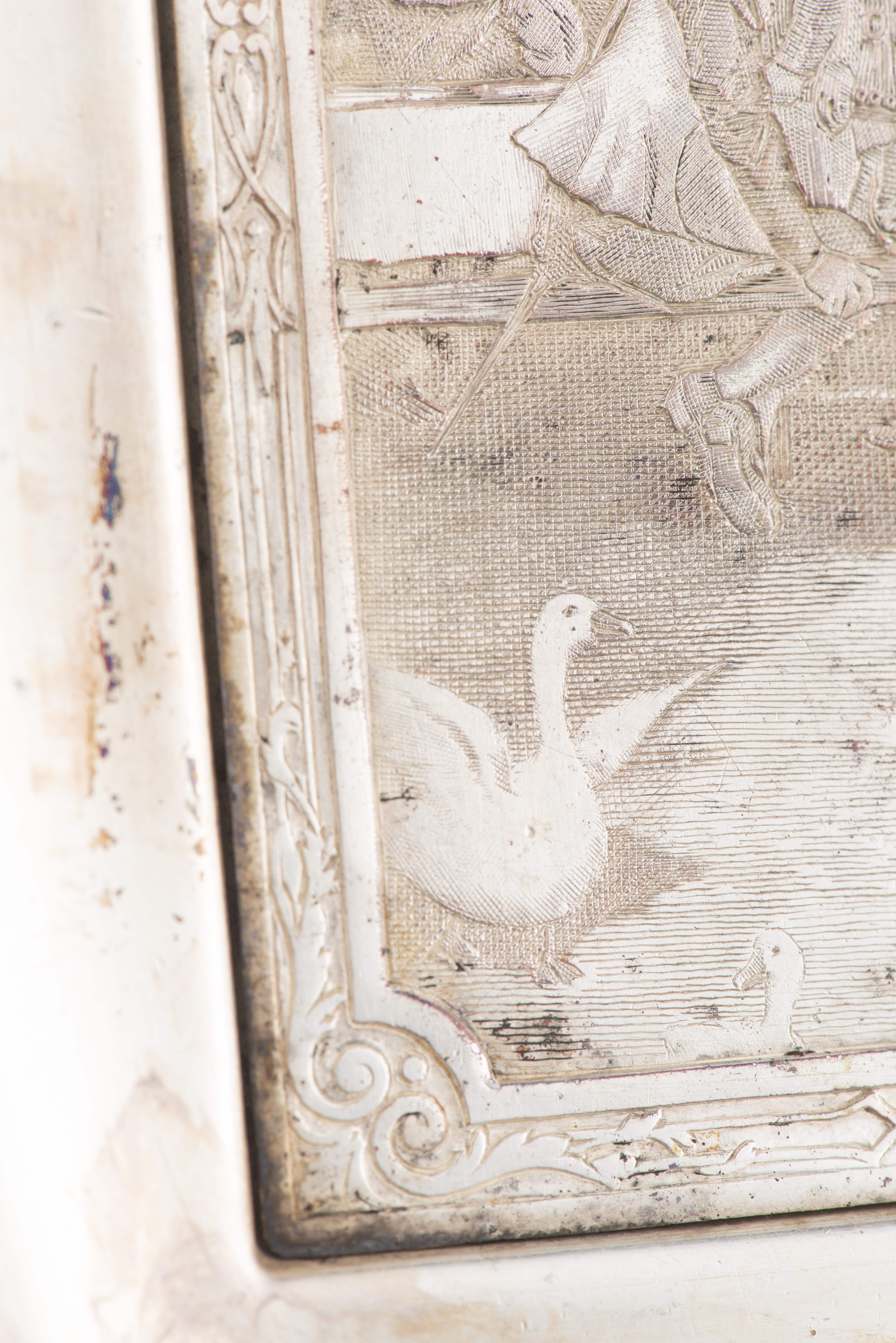 Ensemble de pièces en cuivre argenté à décor de scènes en léger relief gravé