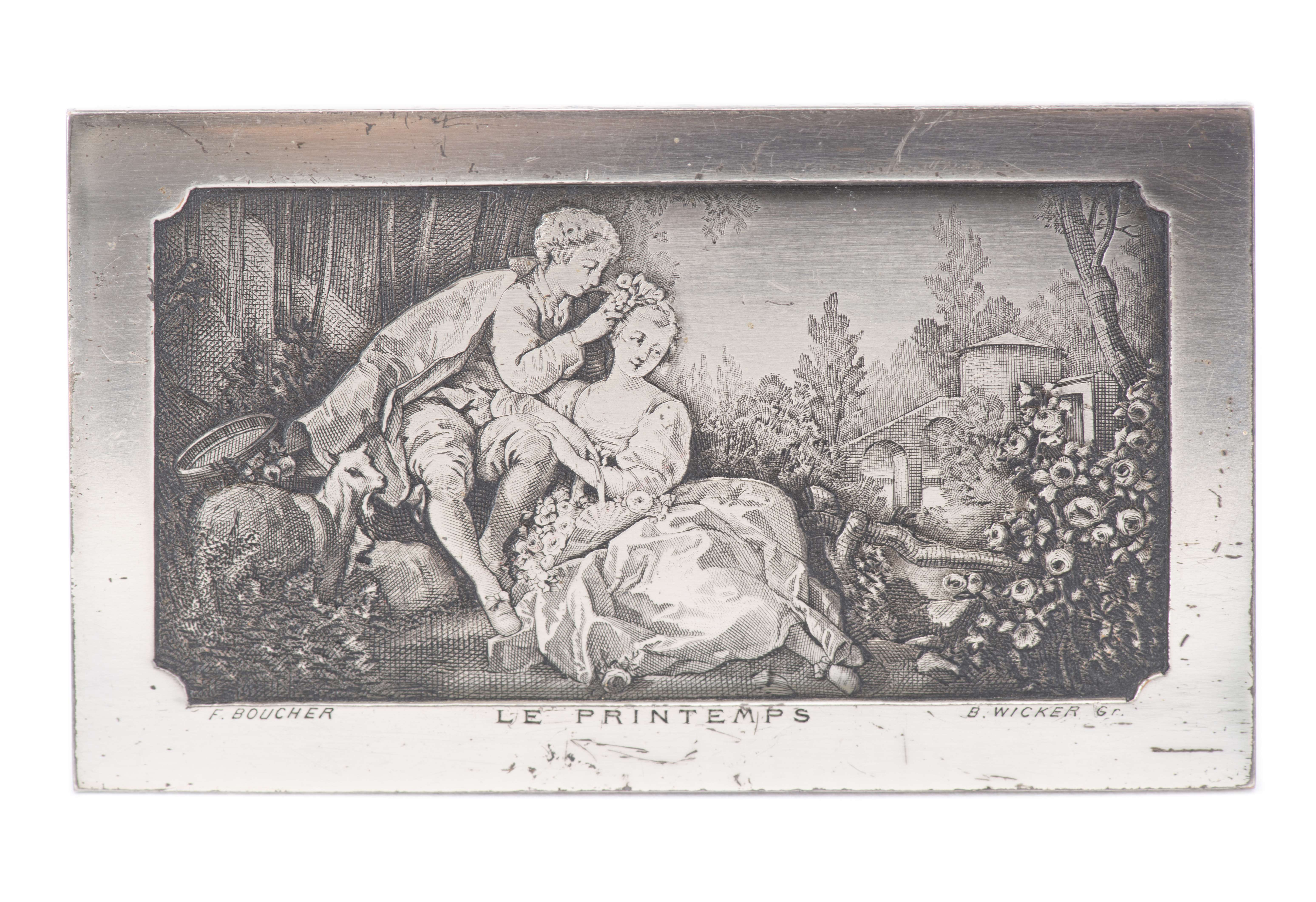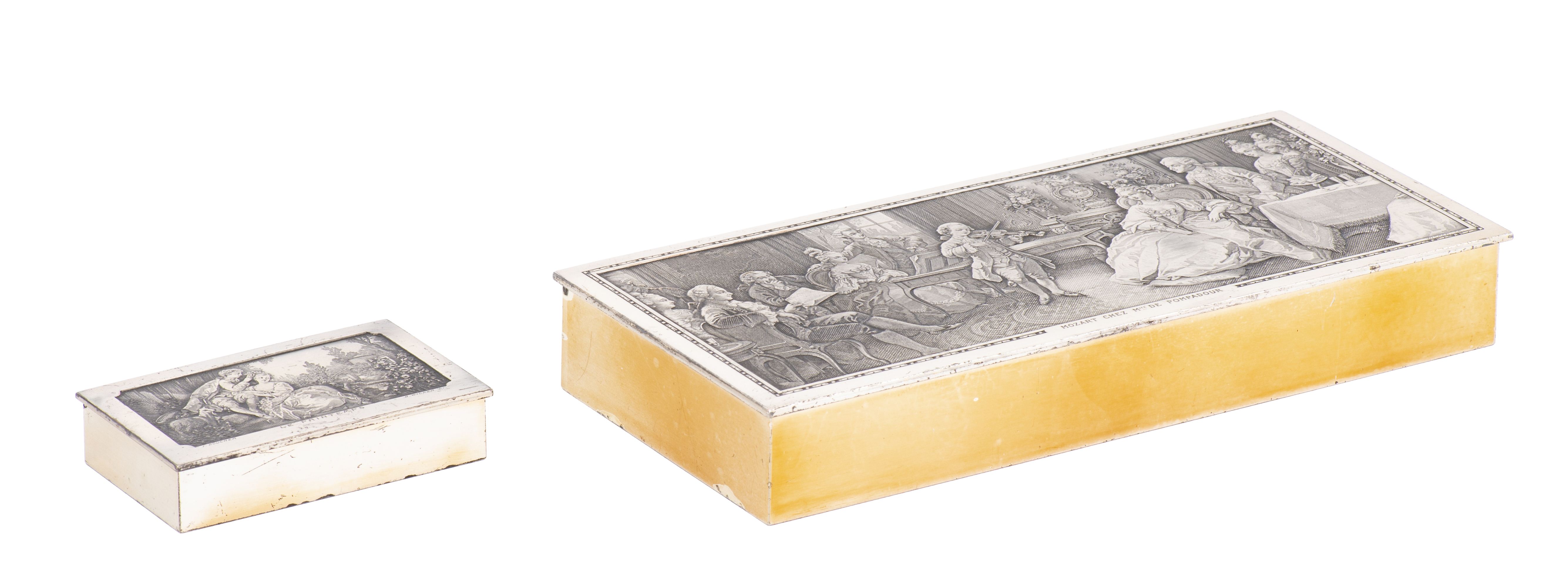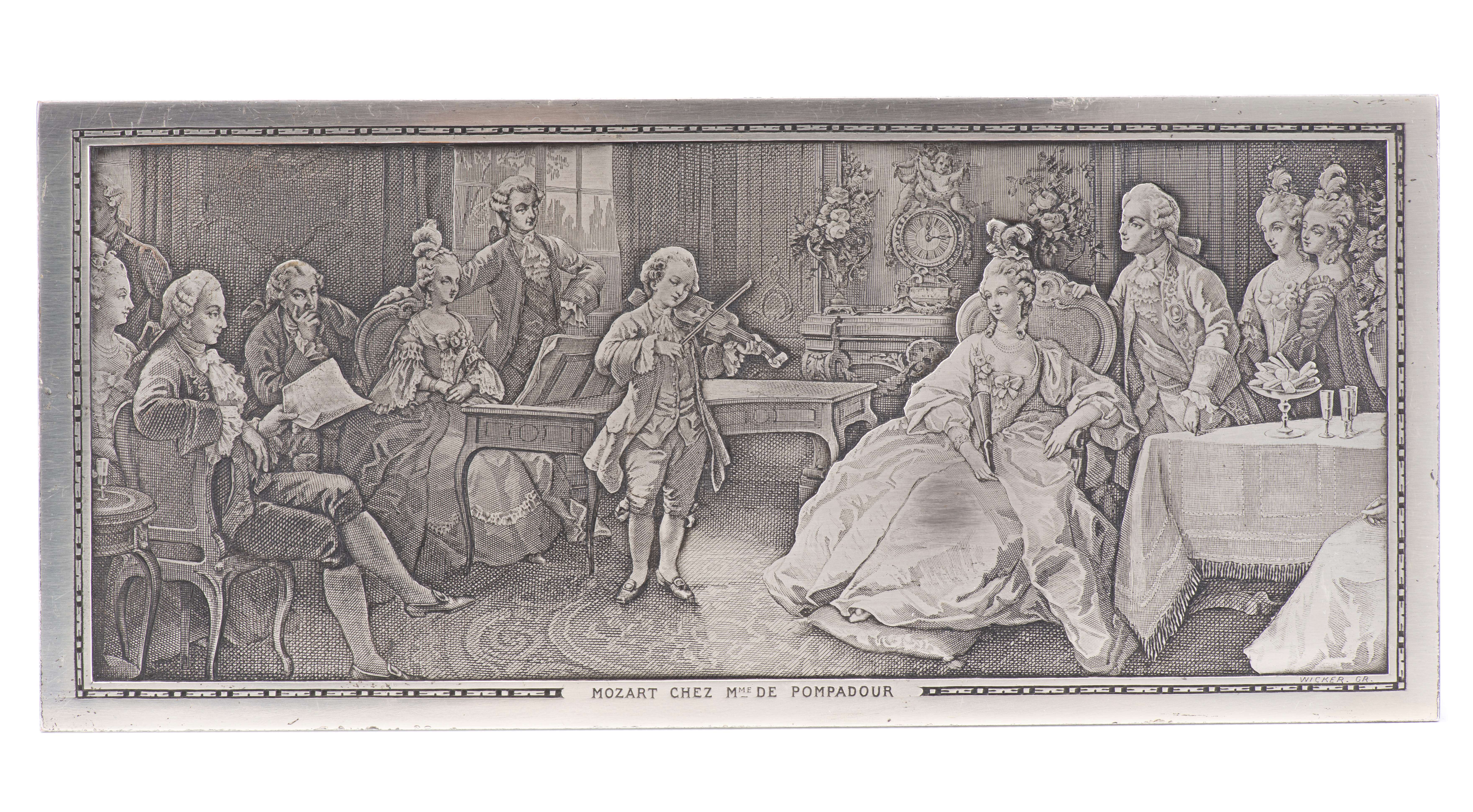 - Boîte rectangulaire à décor "Mozart chez Madame de Pompadour". H. 2.8x19.6x8.7 cm