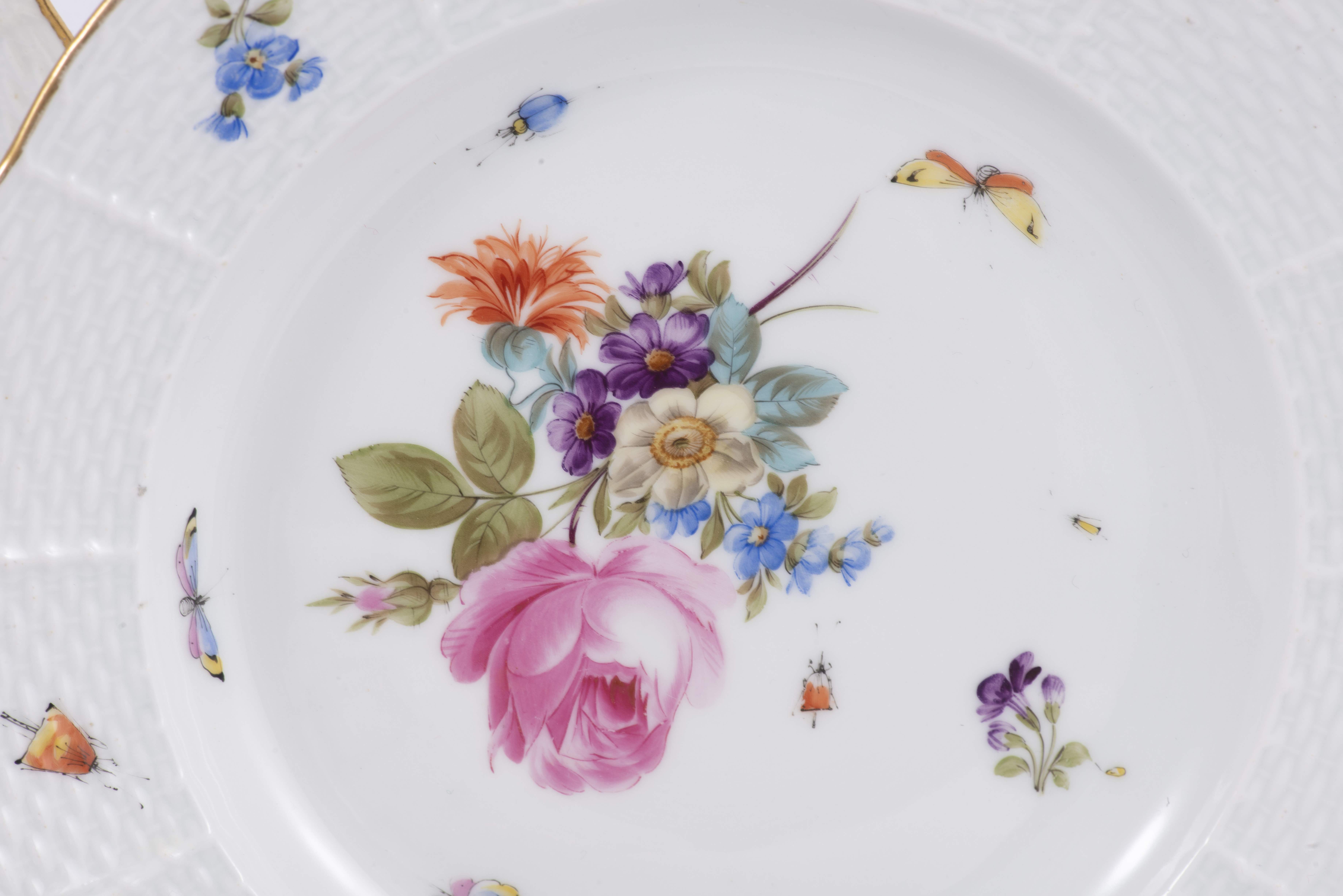 Ensemble de porcelaines à motifs végétaux et animaux à bordures dorées :