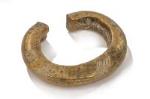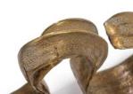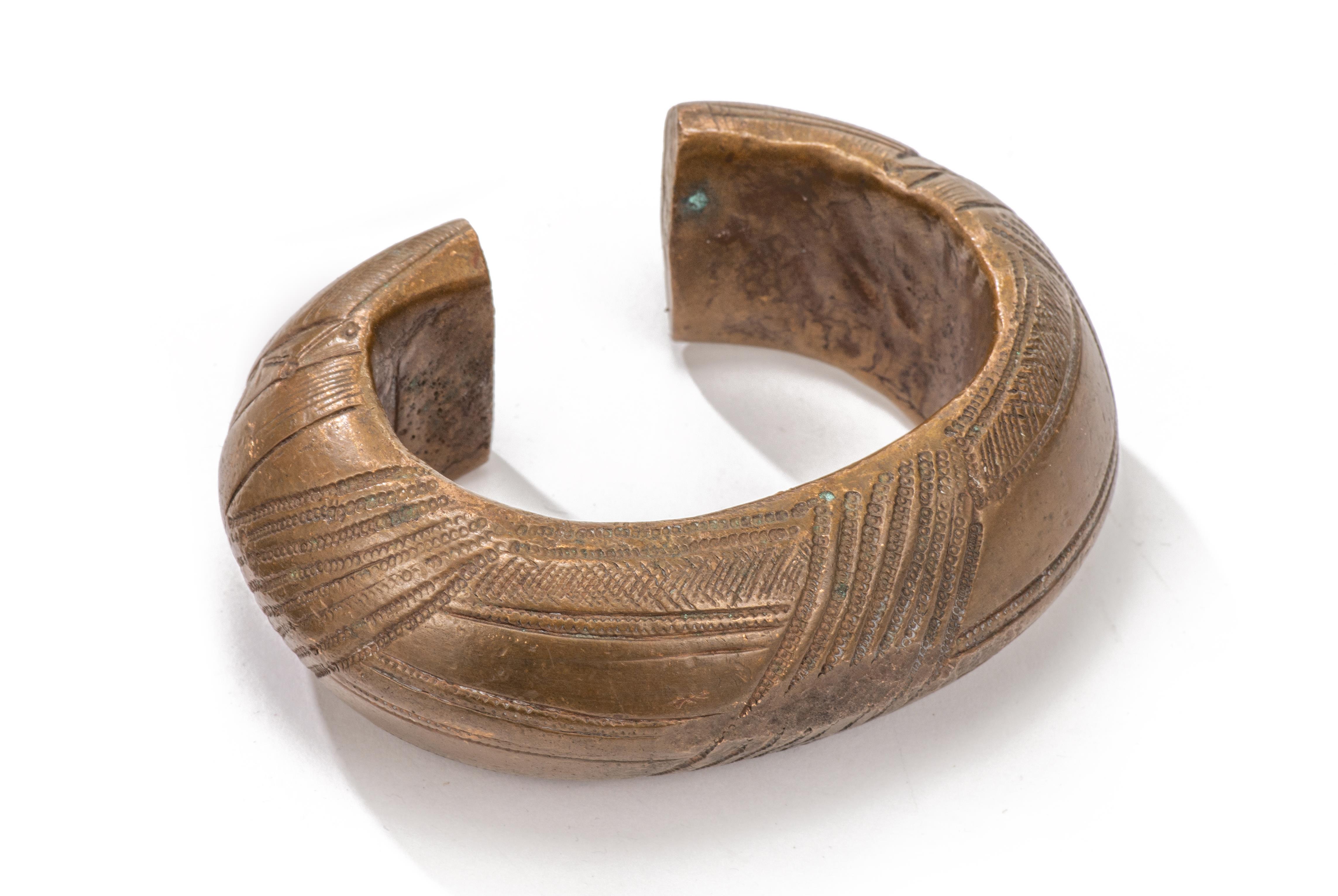 Ensemble de quatre bracelets esclaves et une entrave en laiton gravés de motifs géométriques et stylisés.