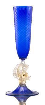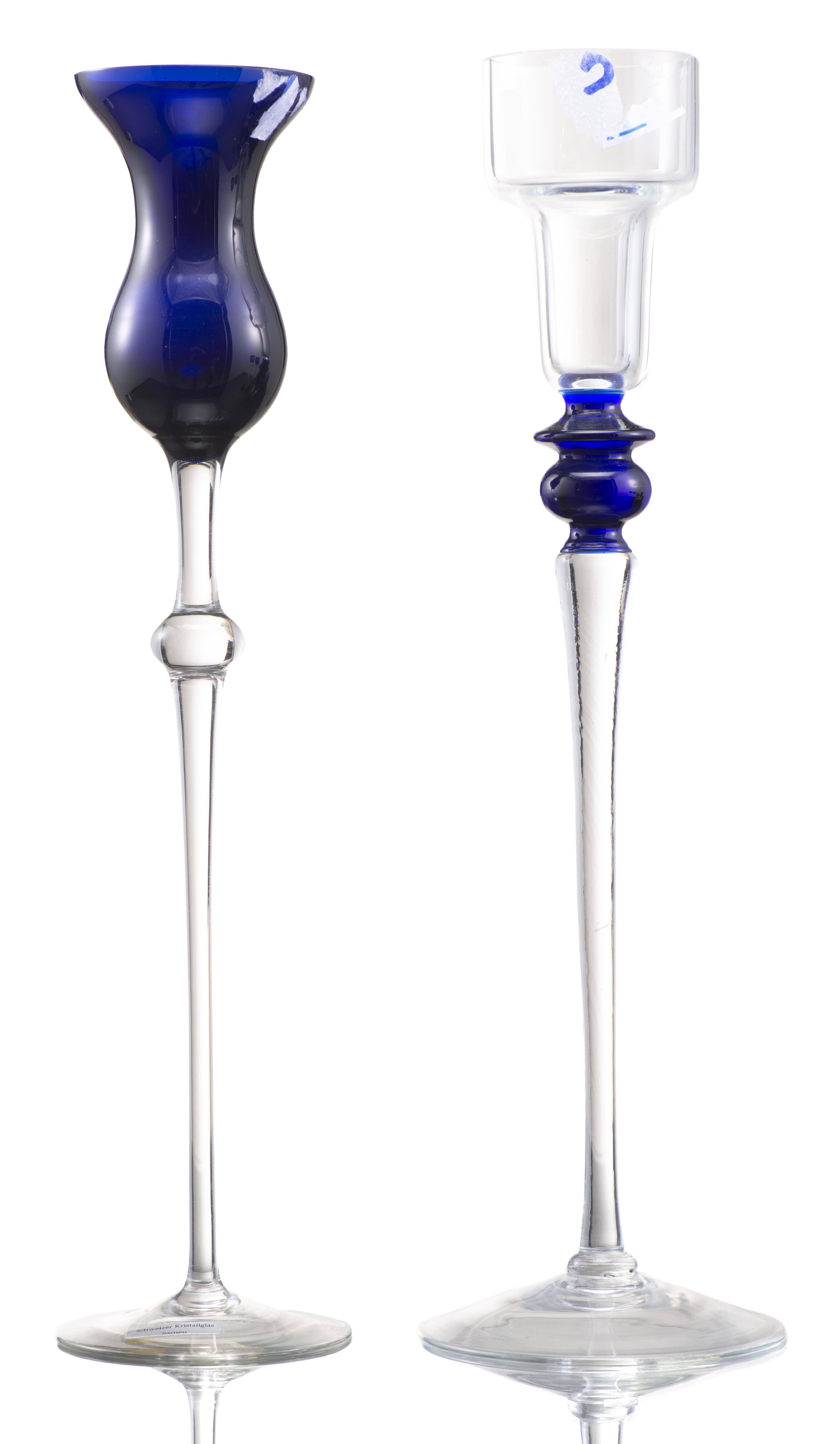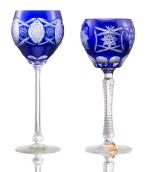 - 2 verres à pied en cristal taillé bicolore bleu et blanc, H. 22.4 cm & H. 20.8 cm