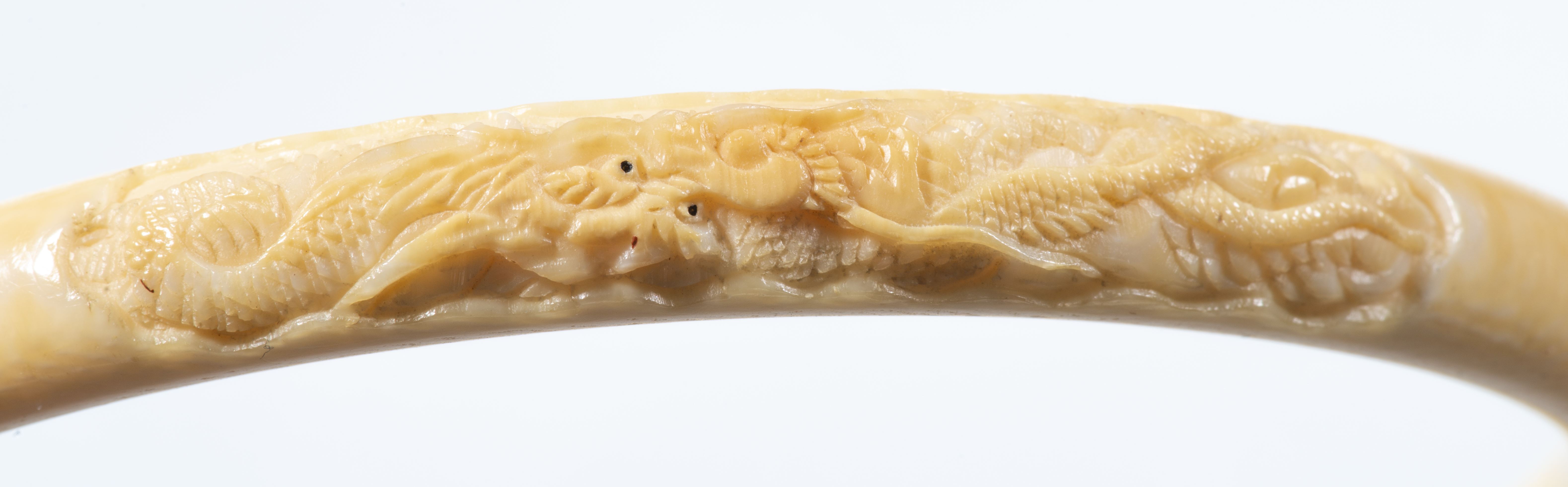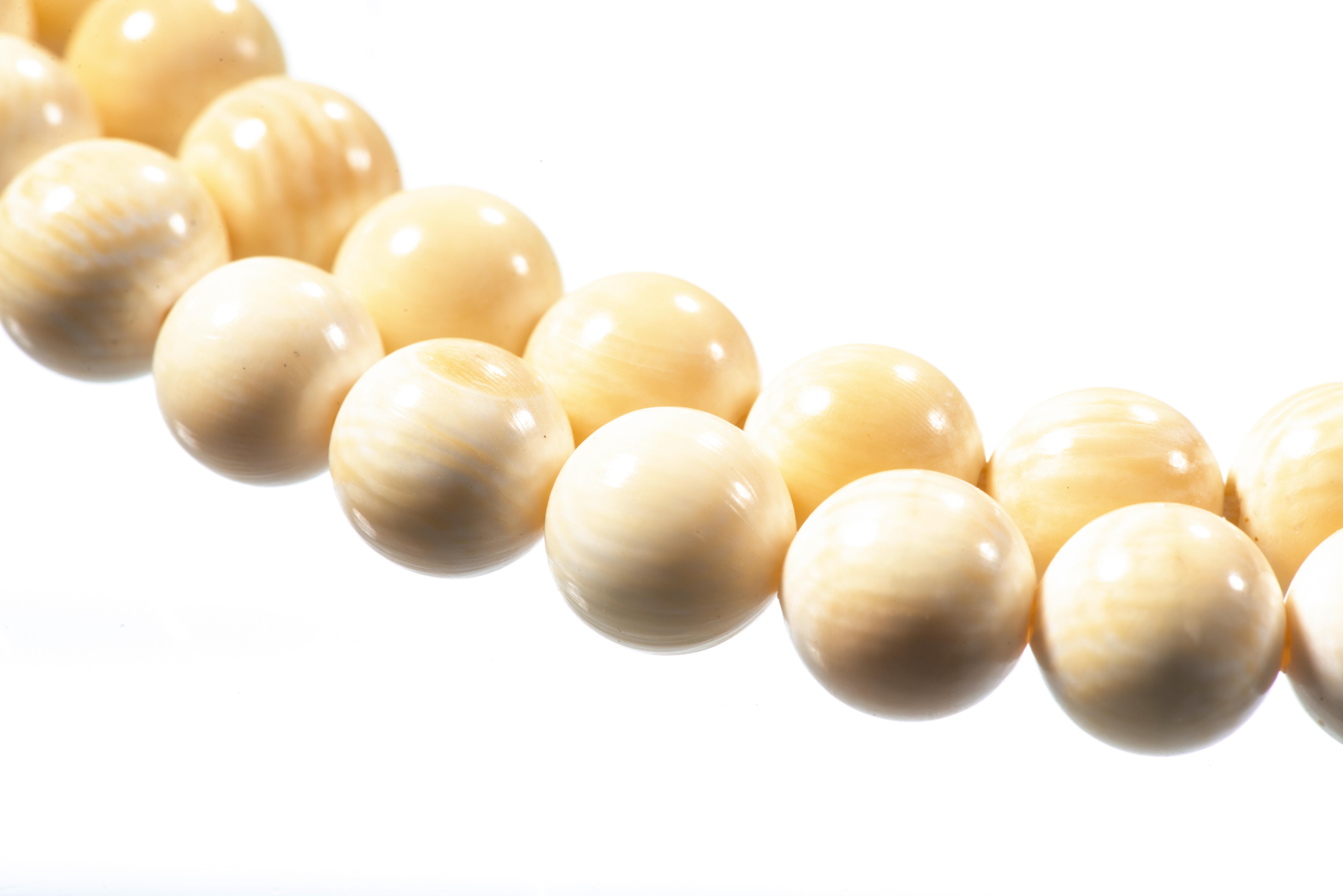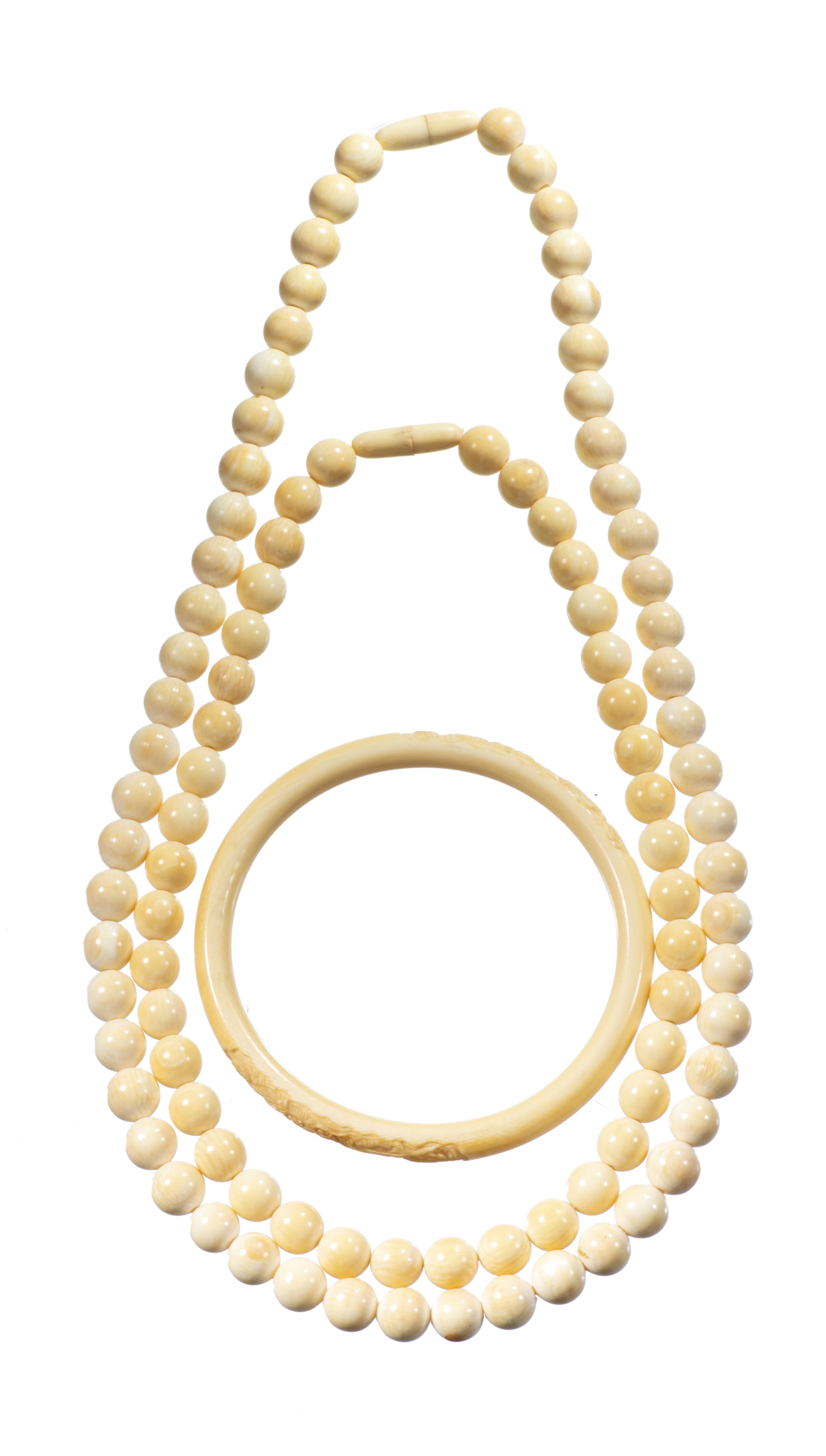 Ensemble composé de deux colliers à perles d'ivoire (choker et sautoir, de 41 et 56.7 cm) et d'un bracelet (6.7 cm de diamètre) gravé en ivoire.