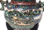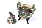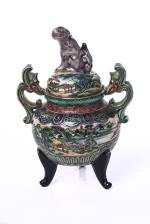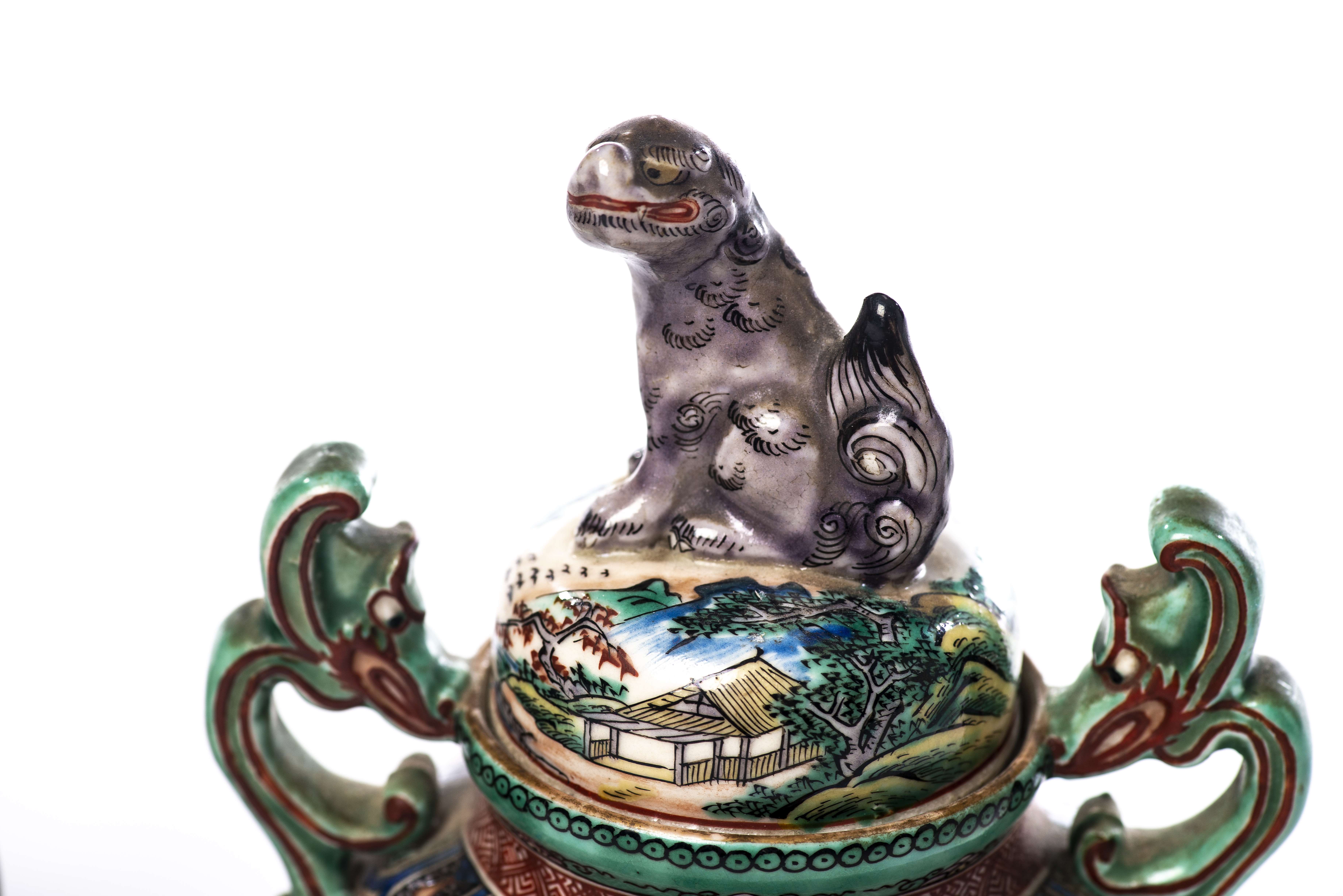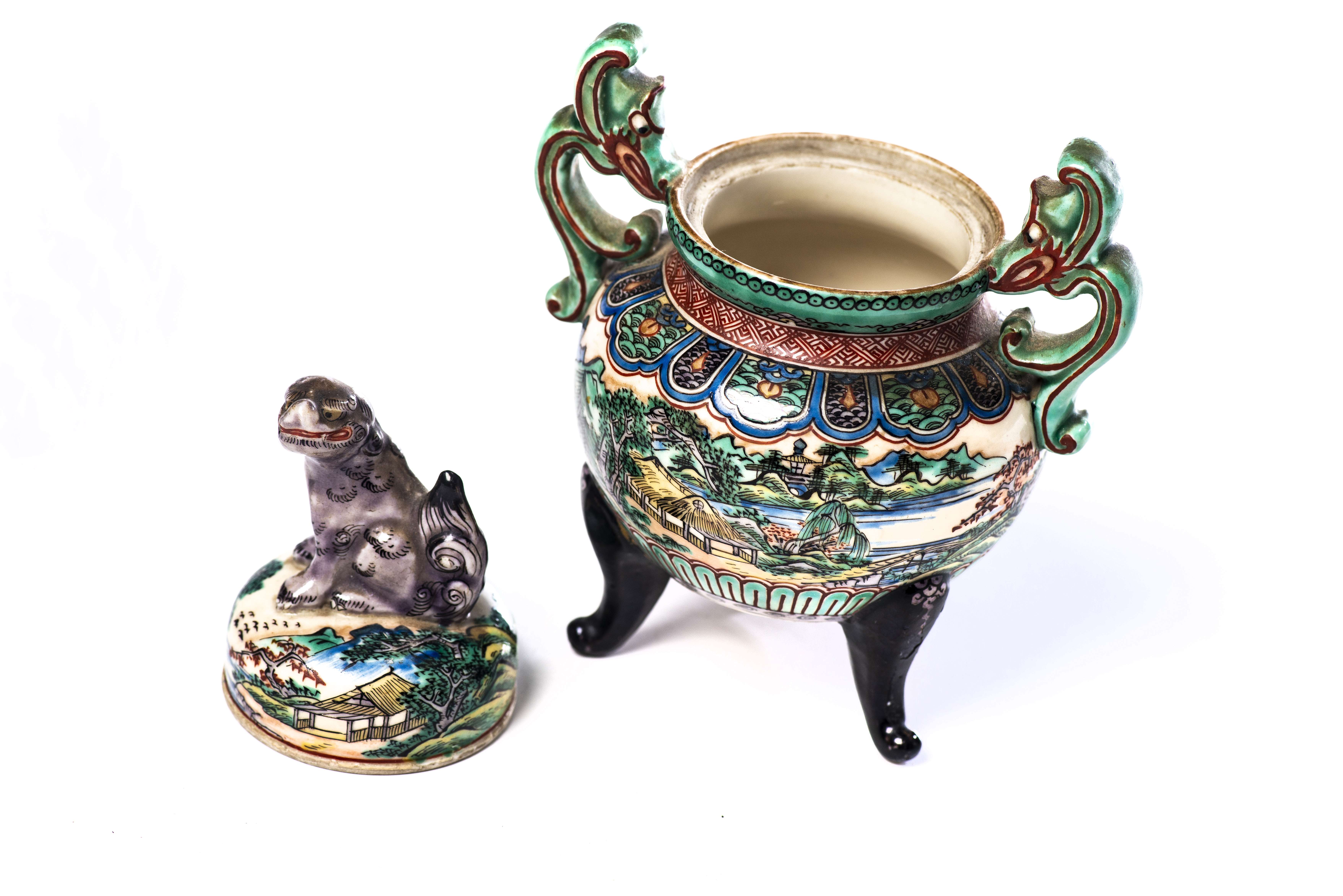 - brûle-parfum tripode à décor de personnages dans un paysage et à deux anses en forme de dragons stylisés, 1 caractère vers la base. Prise du couvercle en forme de Shi-Shi, Japon, Epoque Meiji
